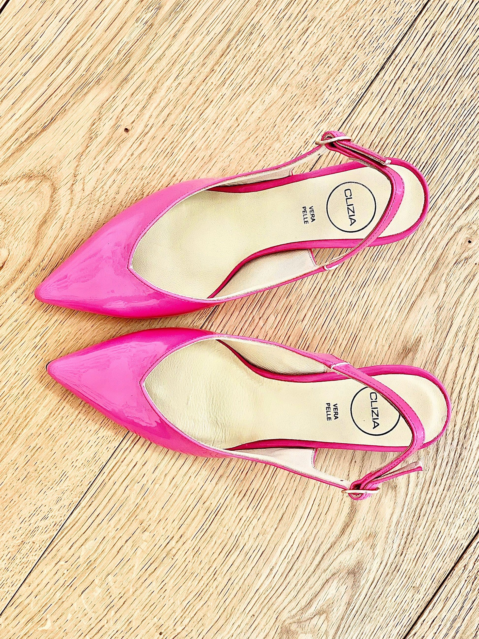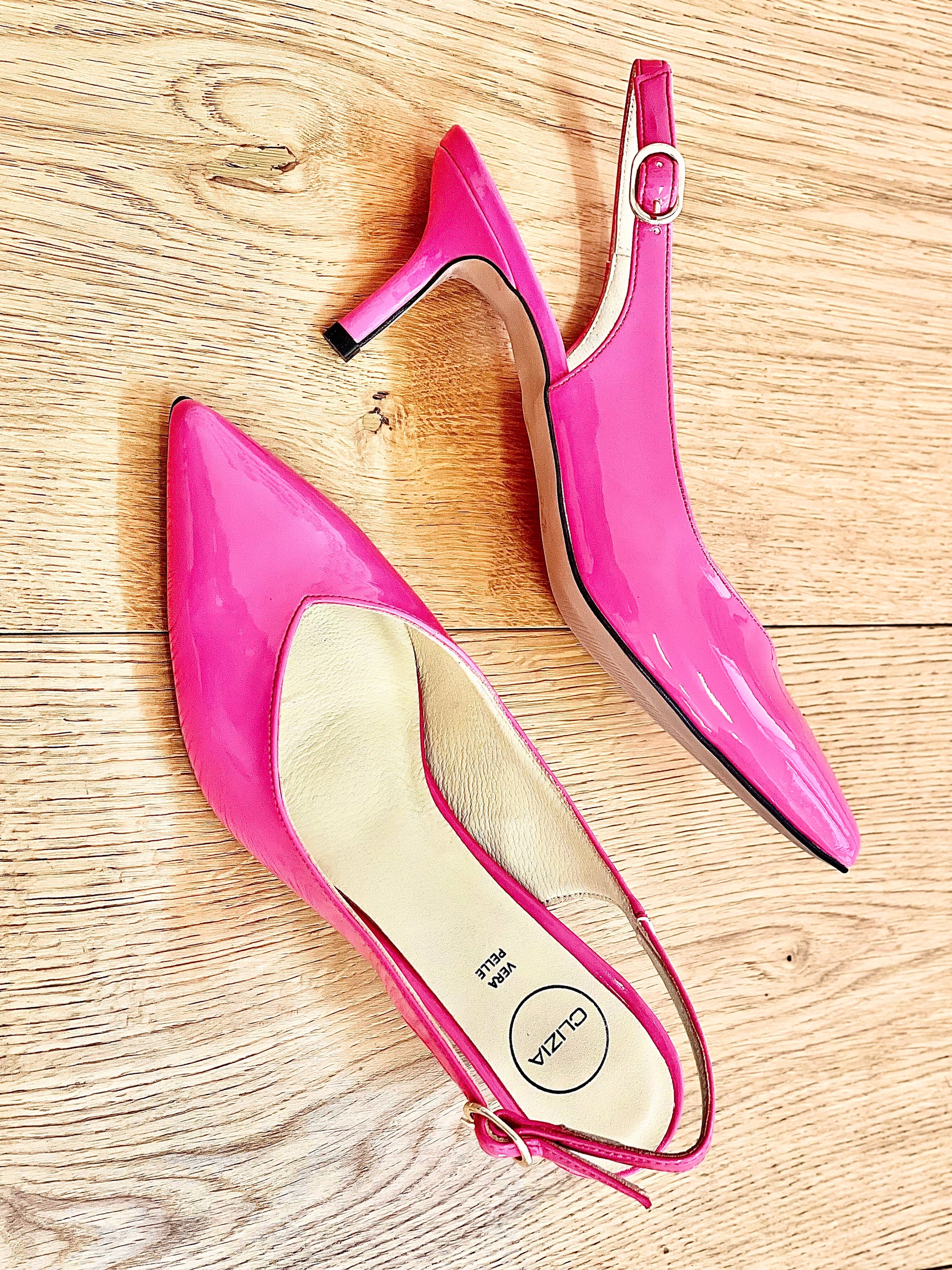Spitse slingbackpump met V-hals en hak van 6 cm.