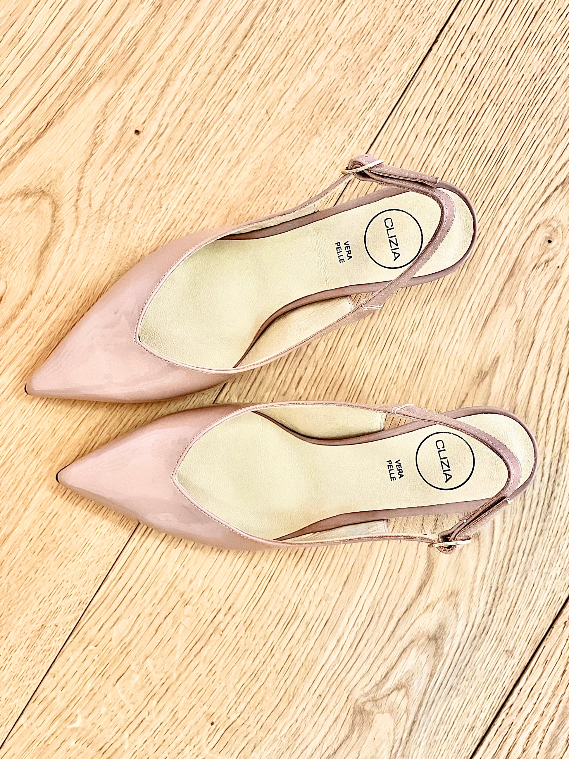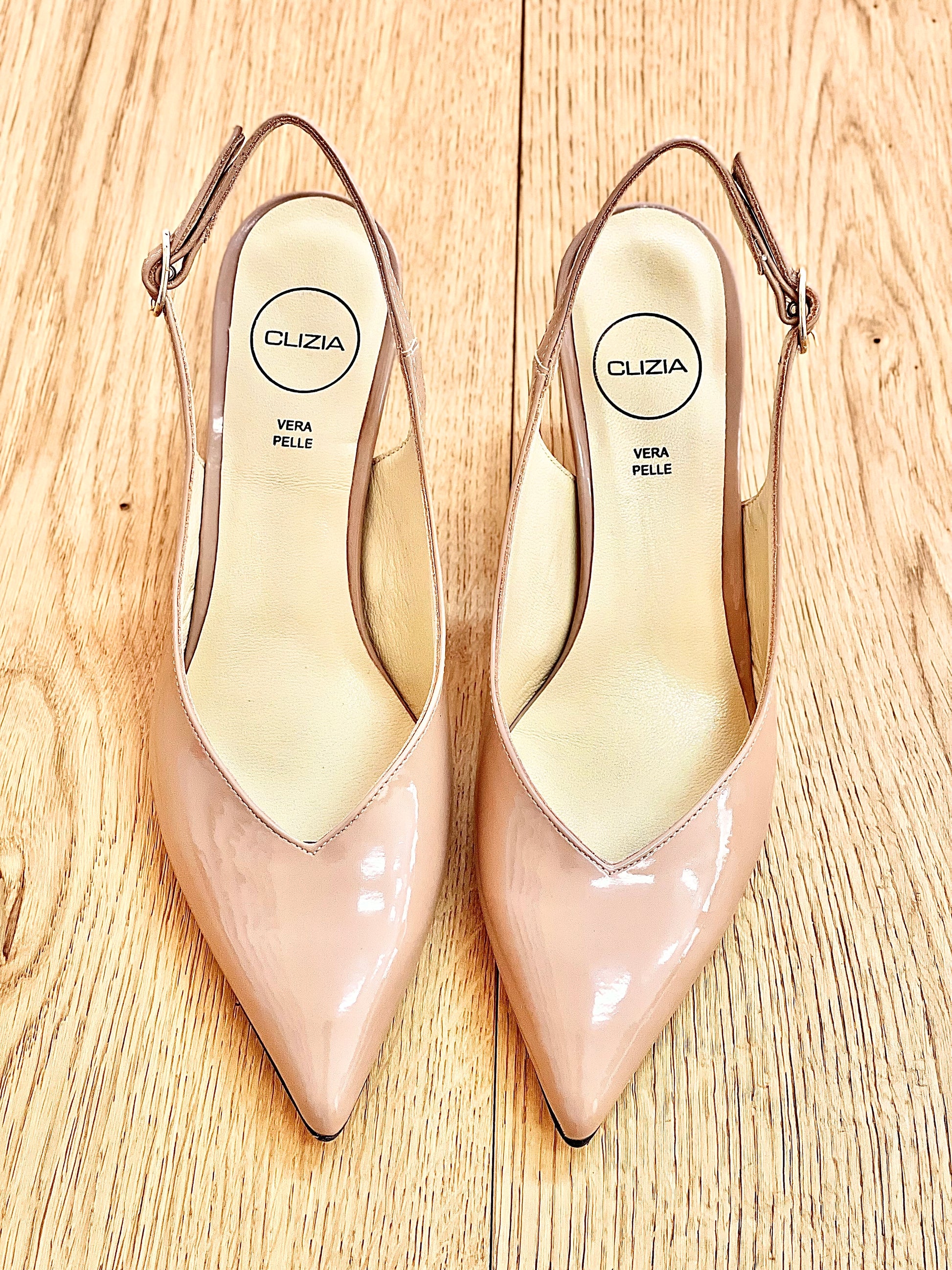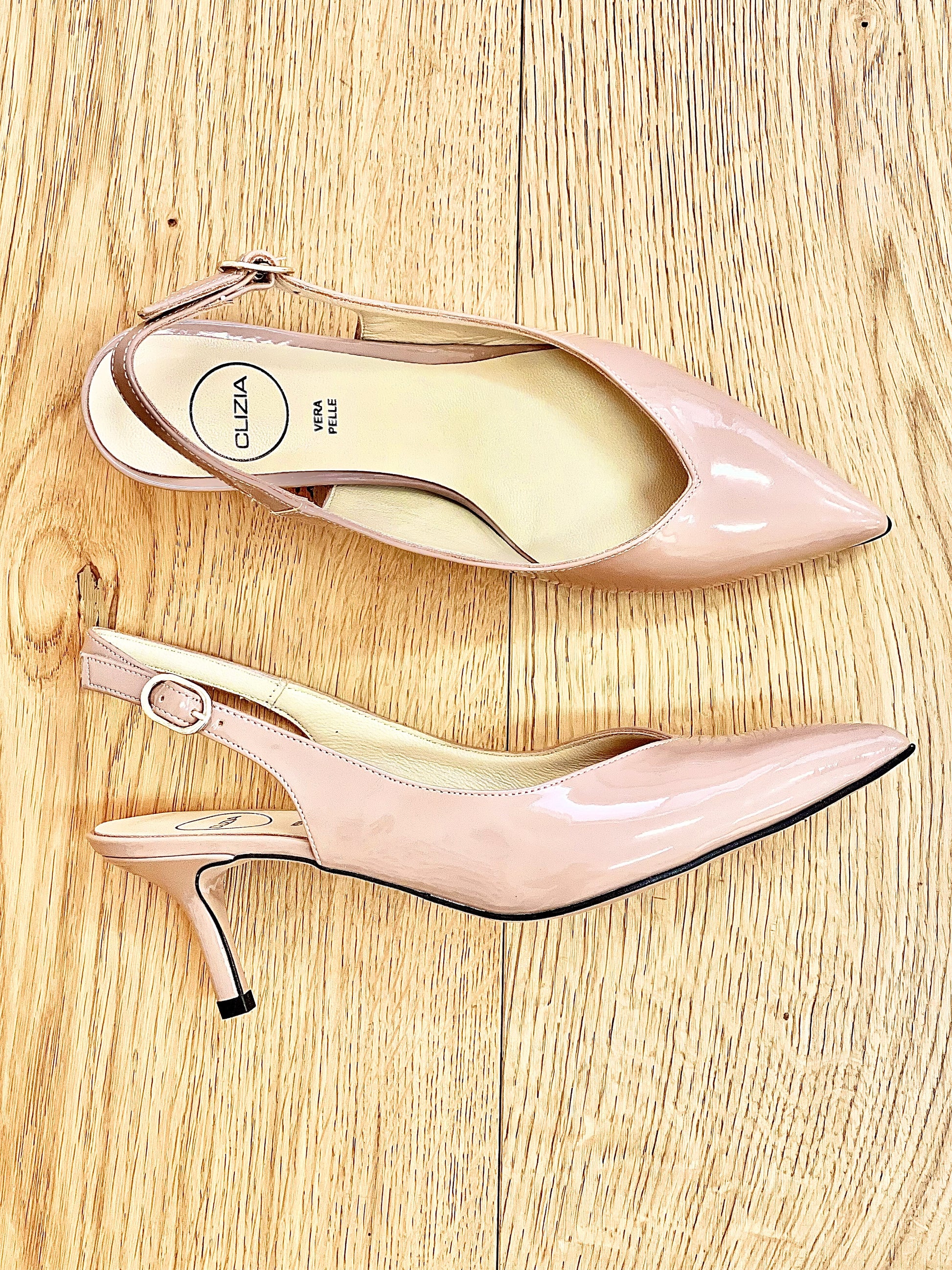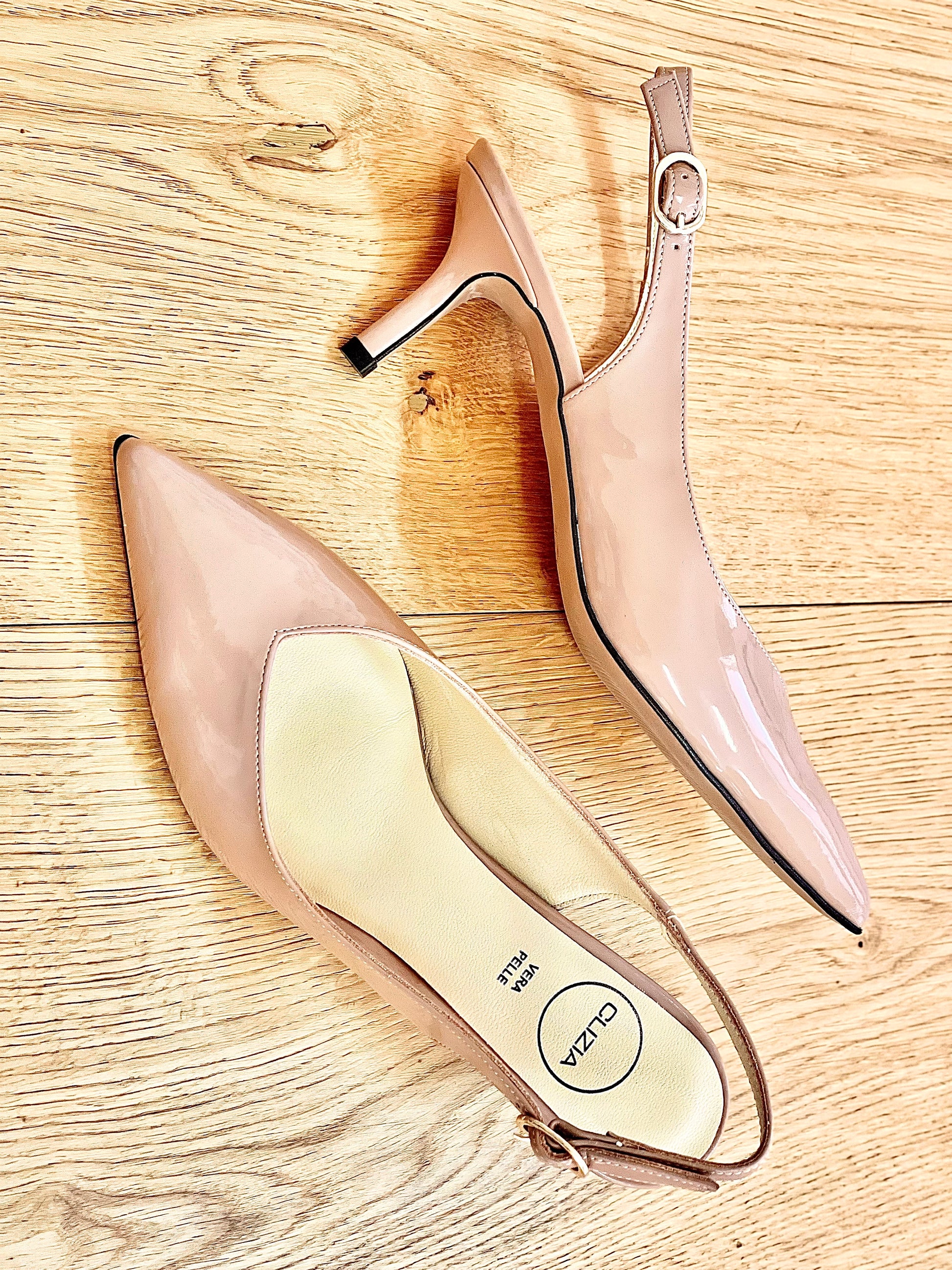 Spitse slingbackpump met V-hals en hak van 6 cm.