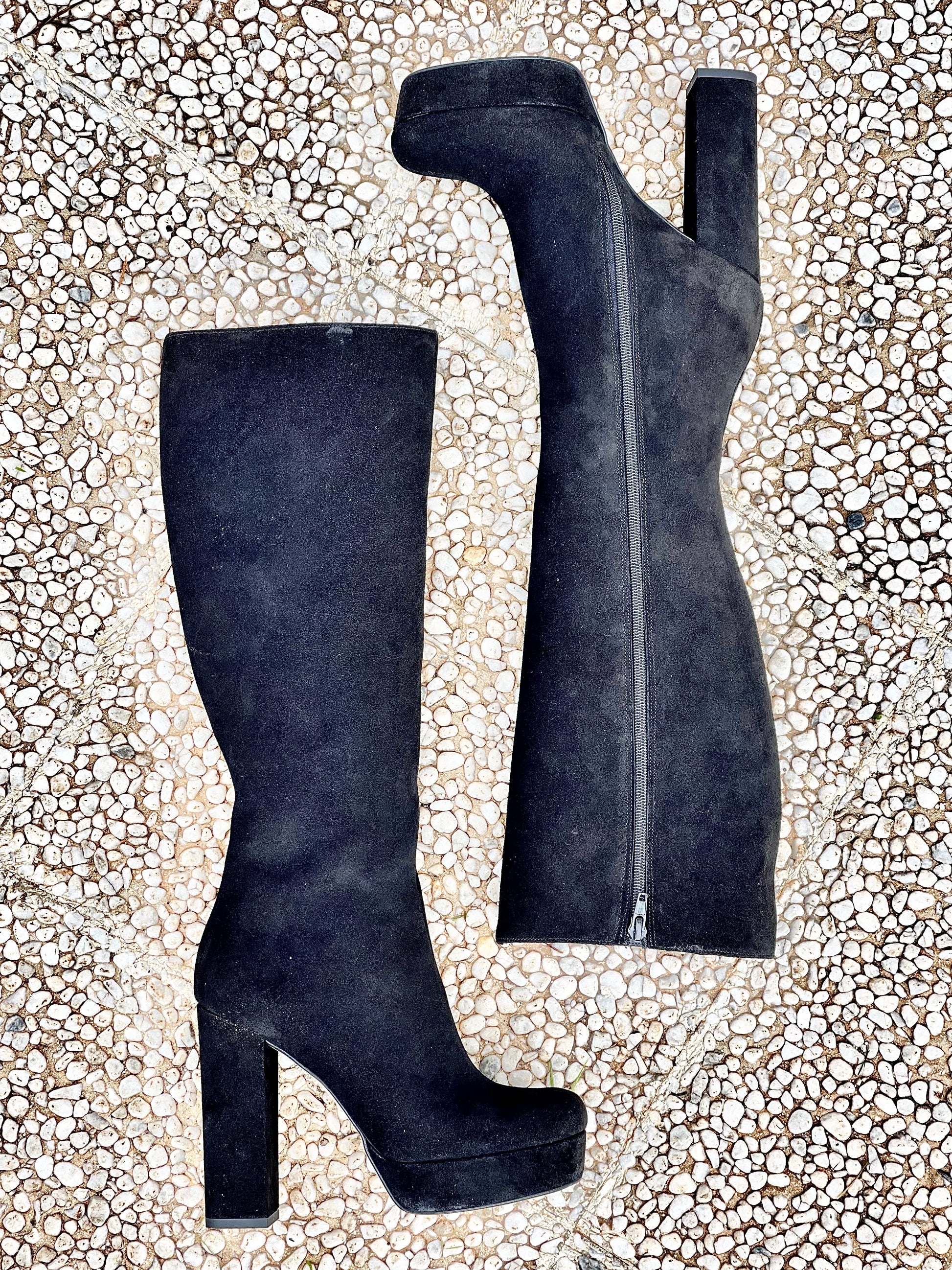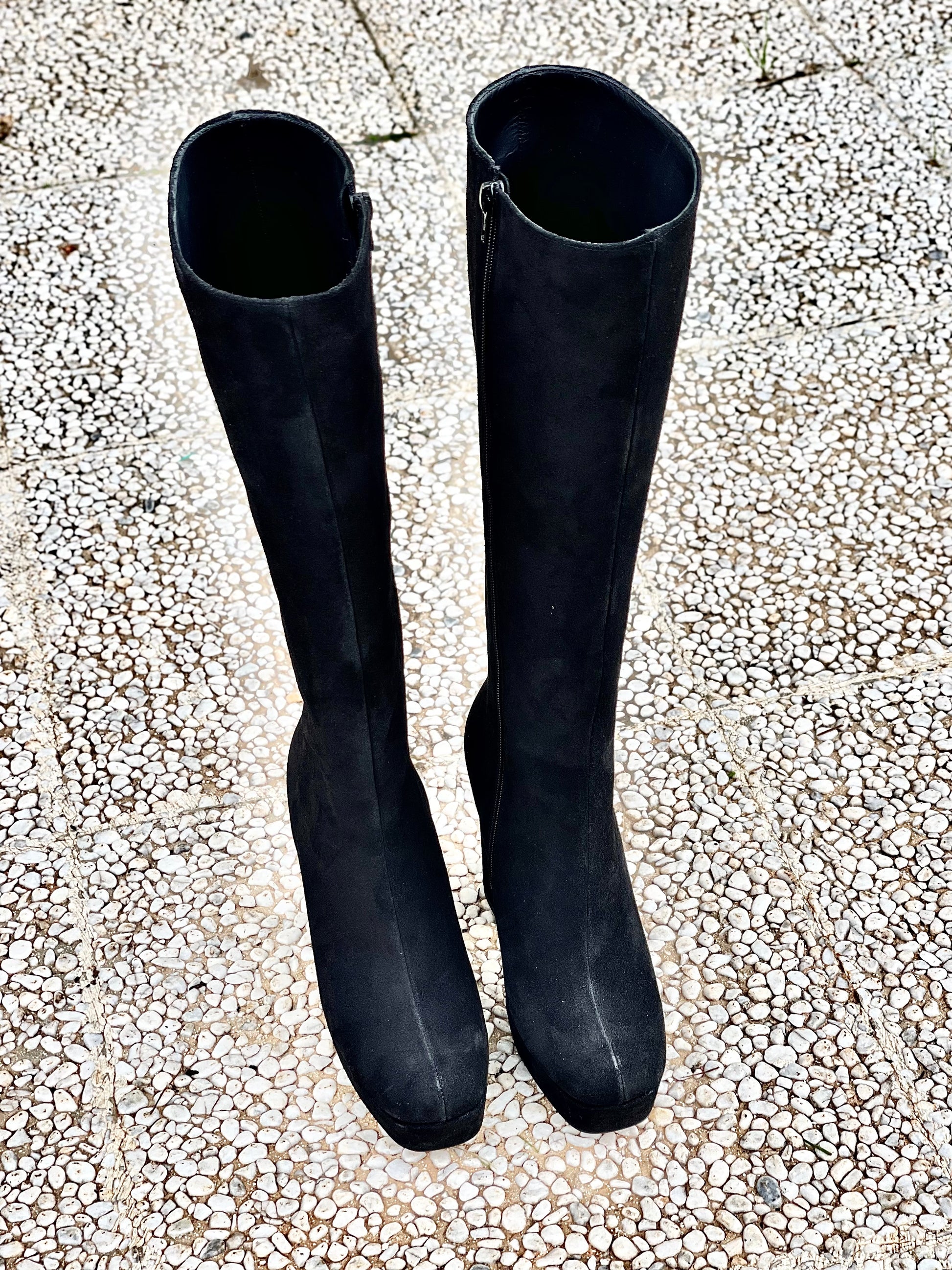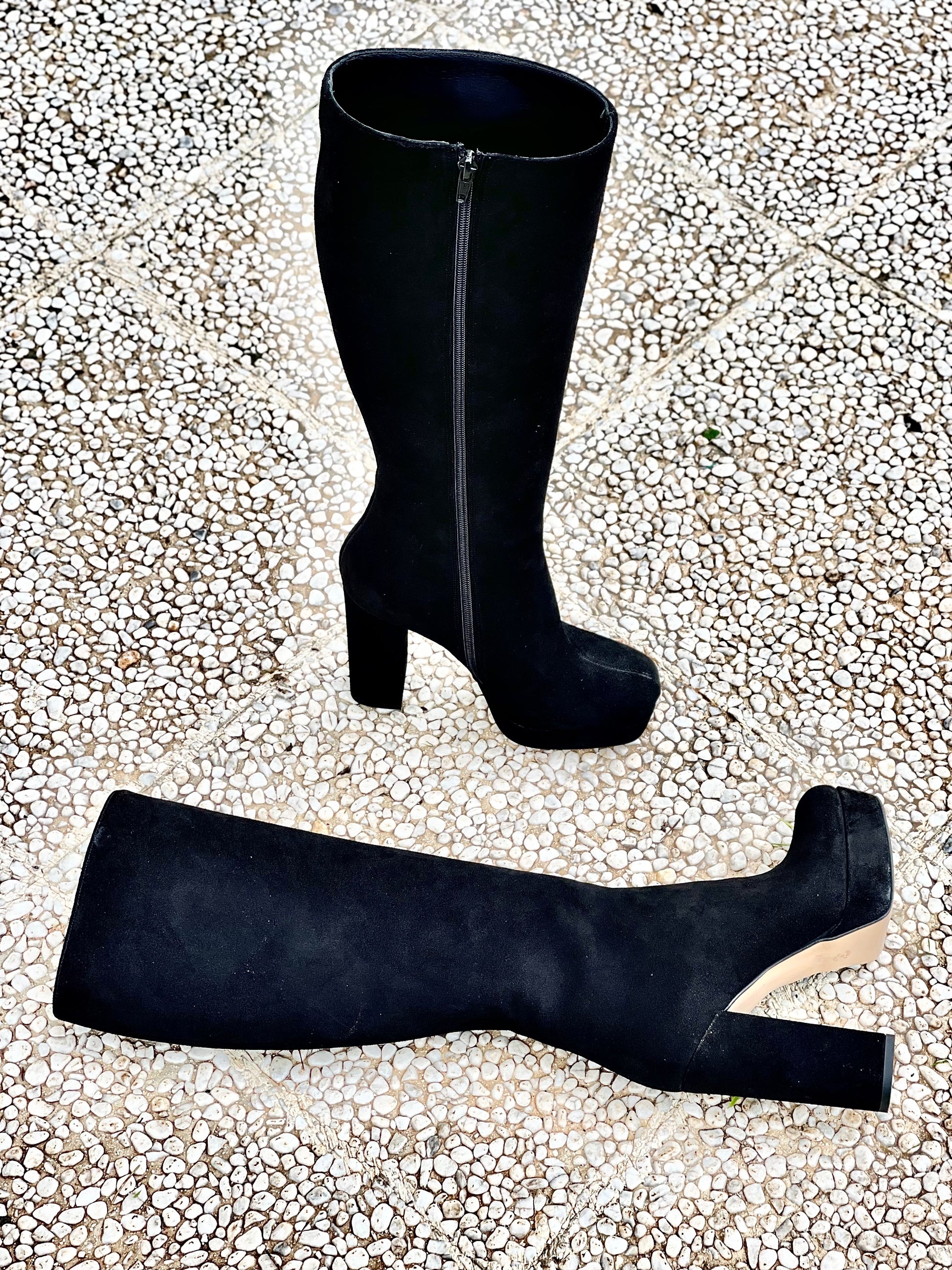 Suède laars met semi-vierkante teen, hak van 12 cm en plateau van 3 cm.