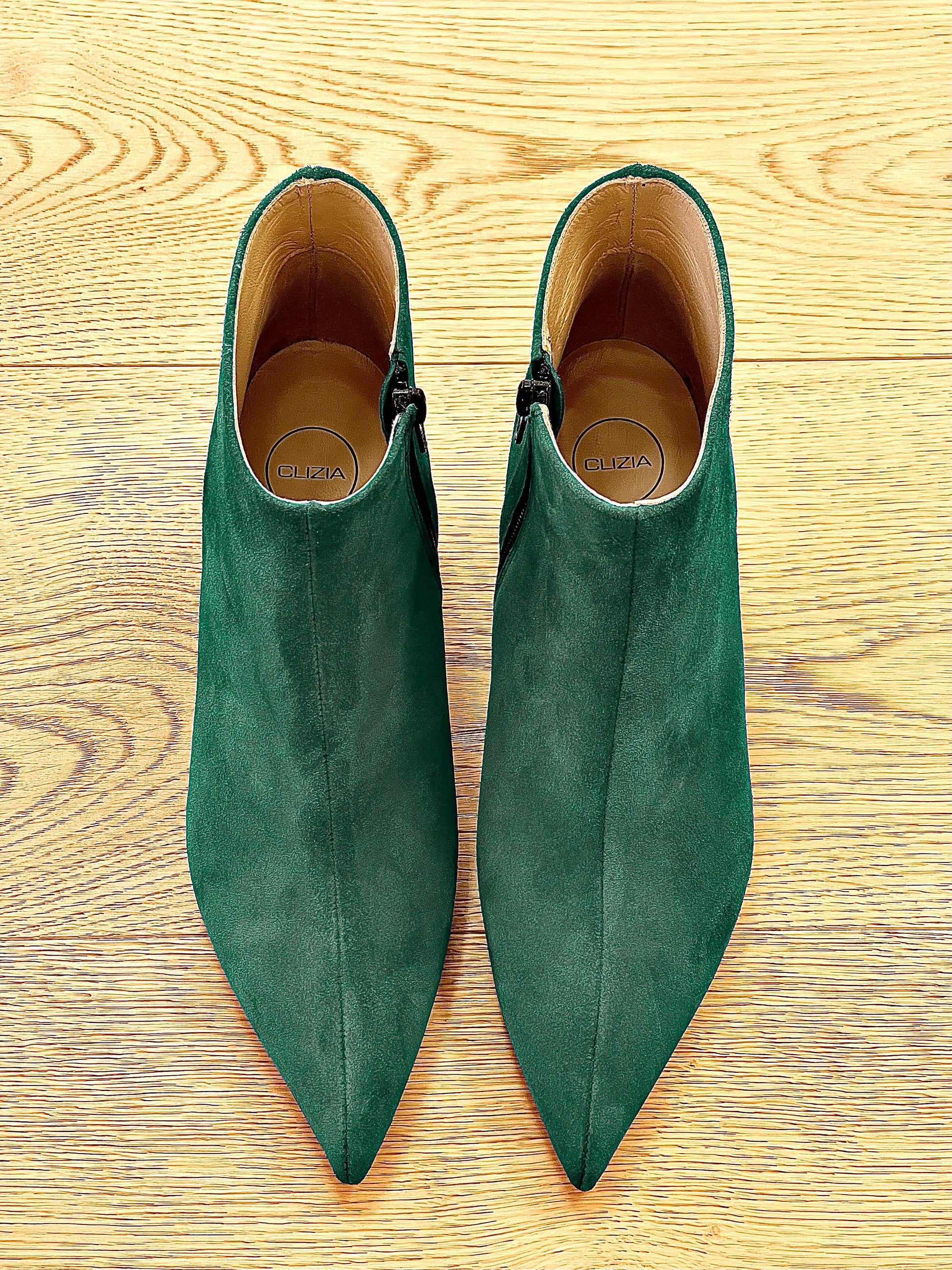 Puntige suède enkellaarsjes met een hak van 6 cm.