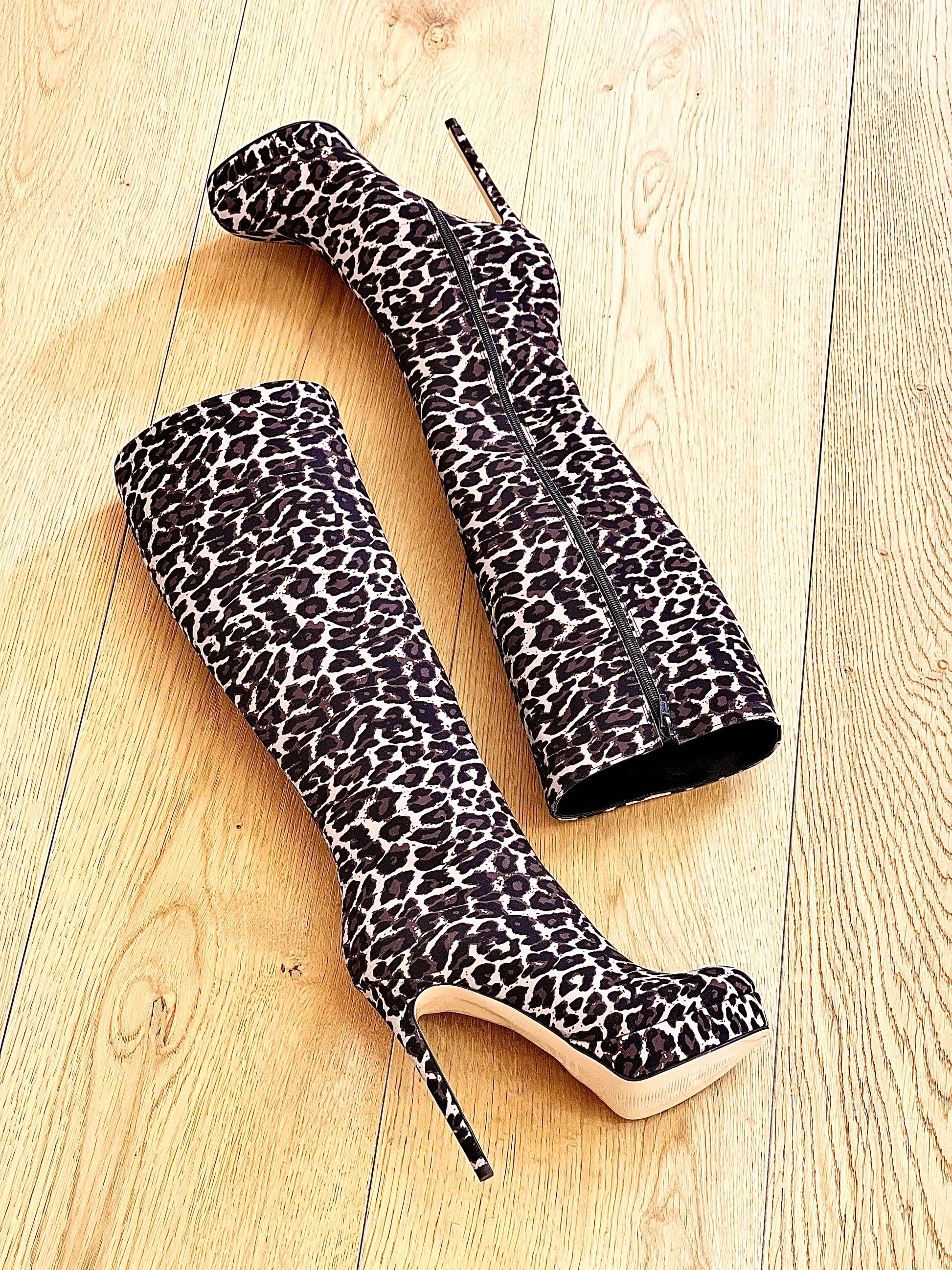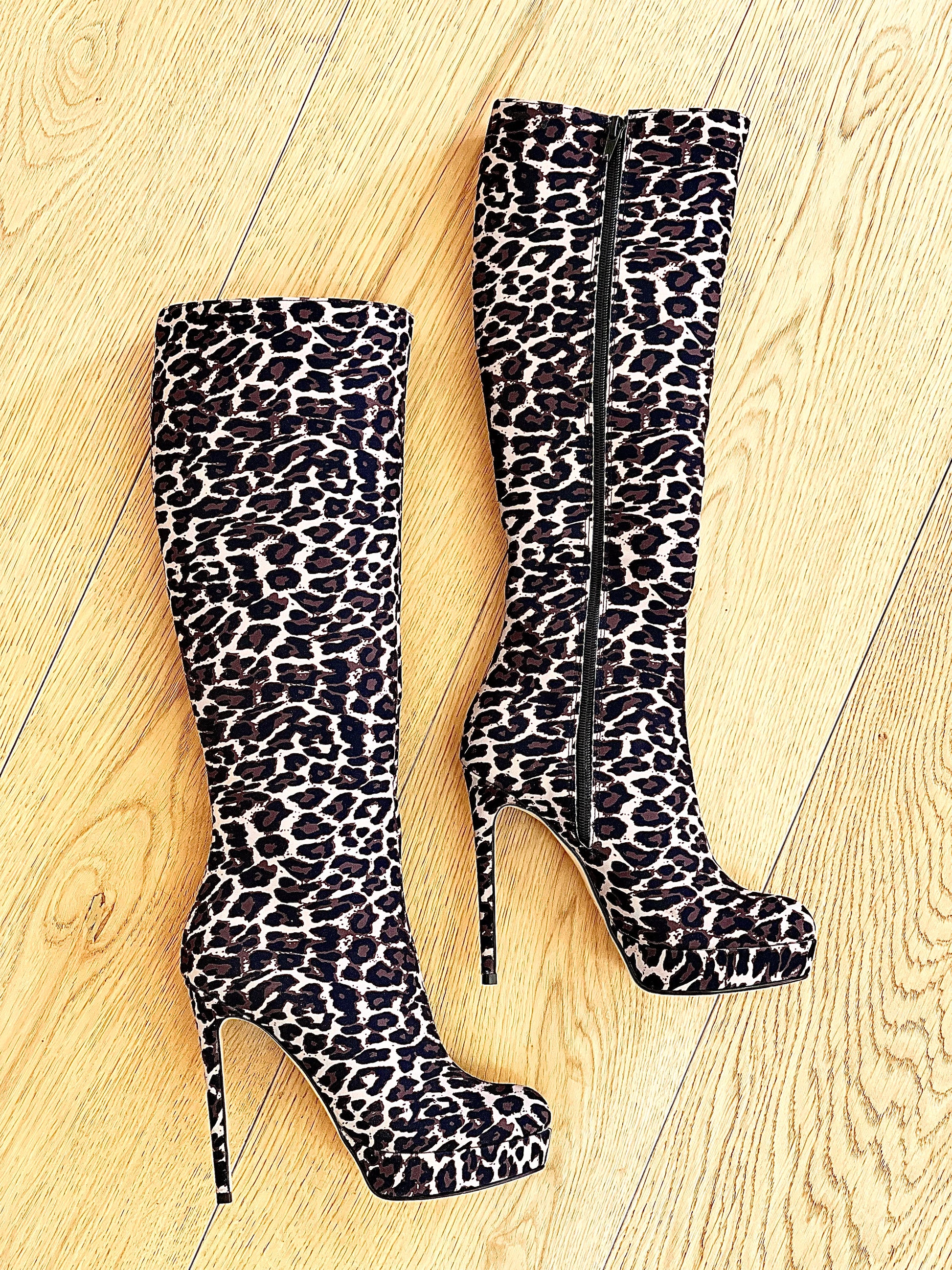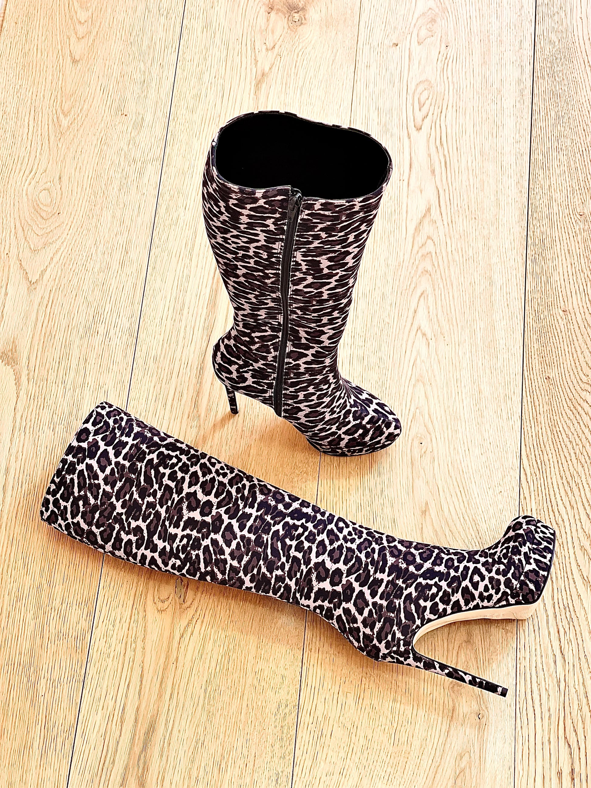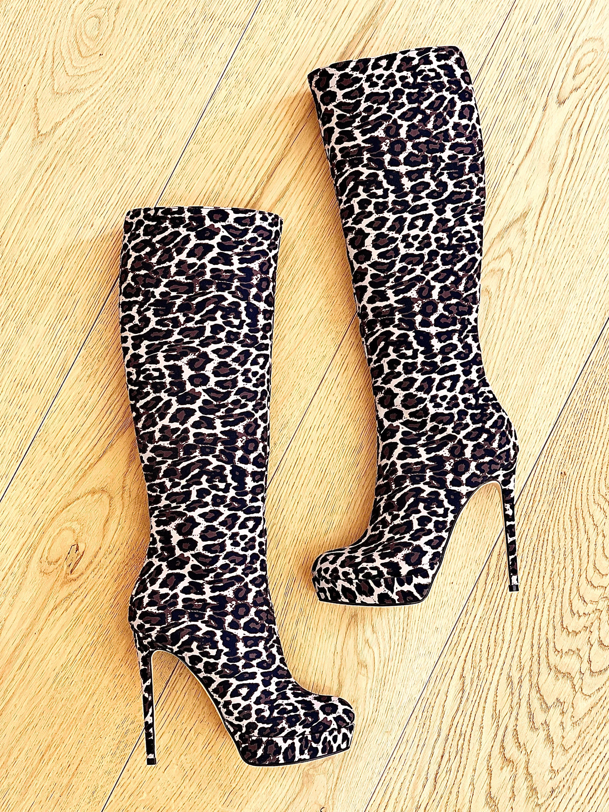 Hoge laarzen met een ronde teen en naaldhak in dierenprint.