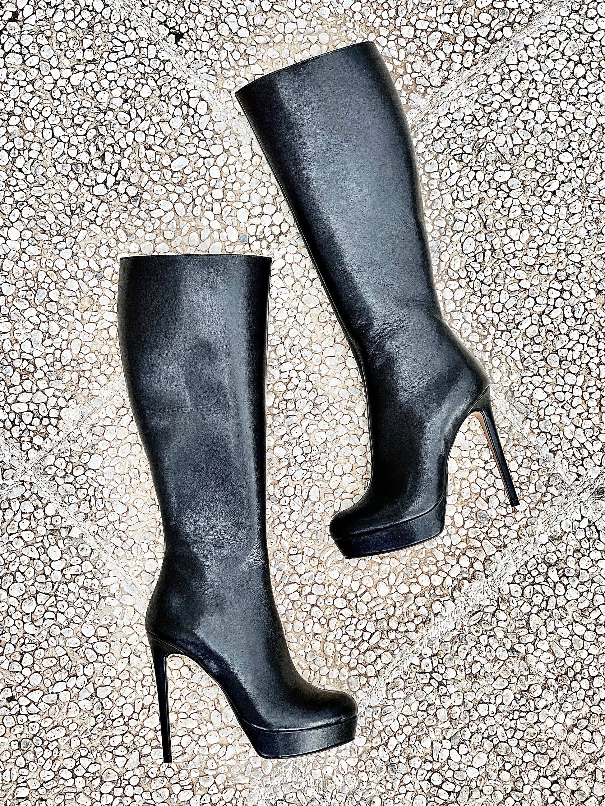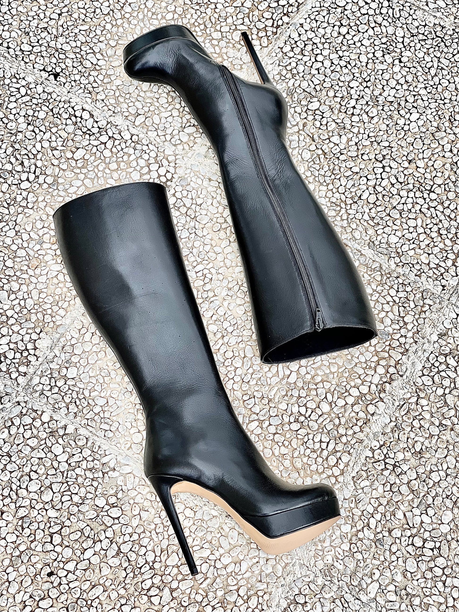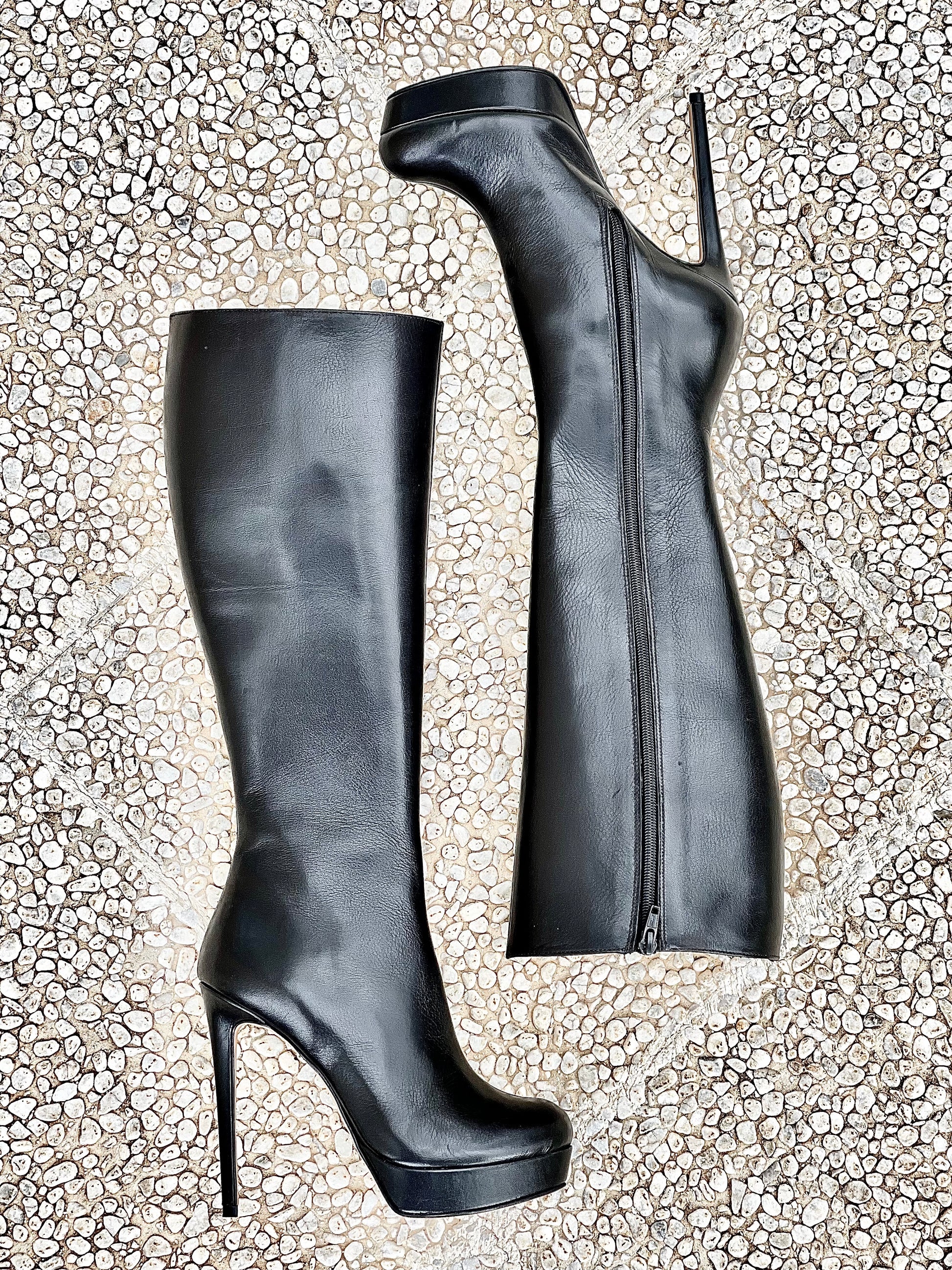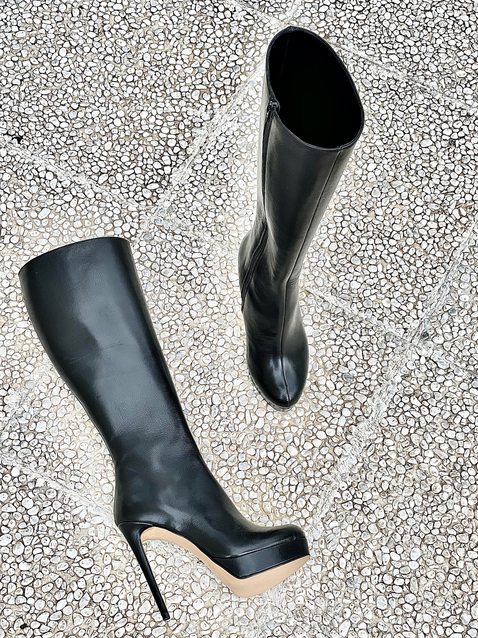 Leren laarzen met ronde tenen, hak van 12 cm en plateau van 2 cm.