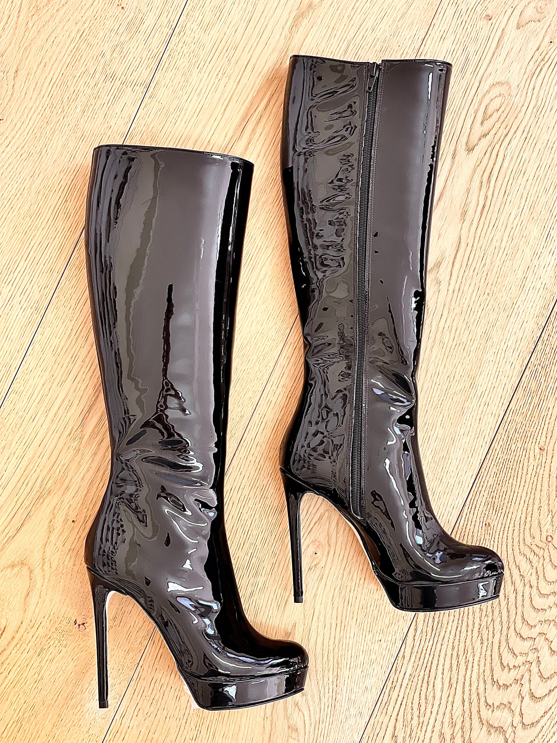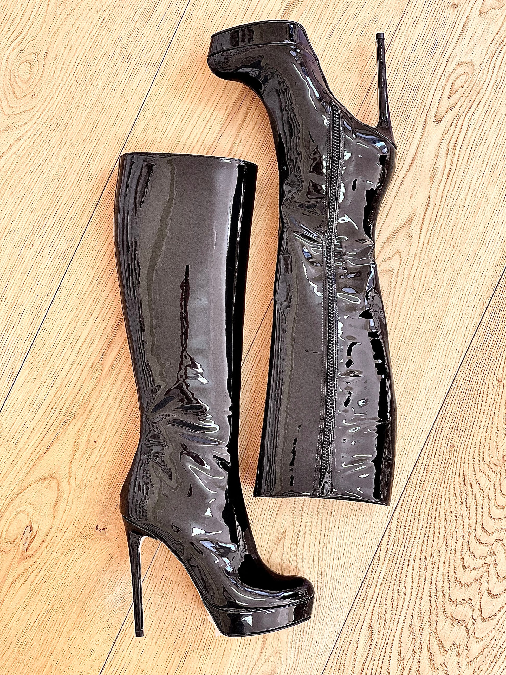 Hoge laarzen met ronde neus in lakleer met plateau en naaldhak.
