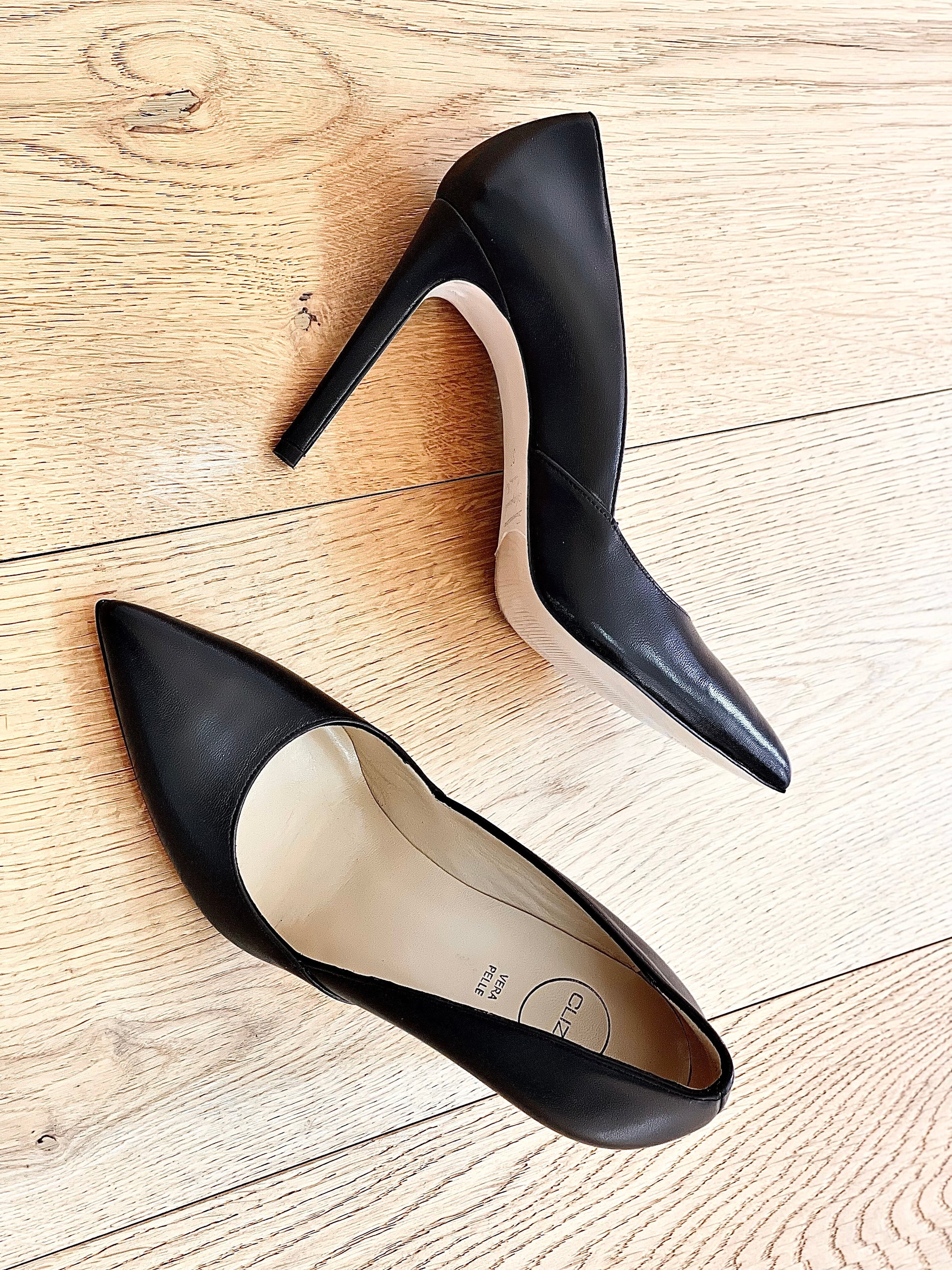 Hoog uitgesneden decolleté met een spitse leren naaldhak.