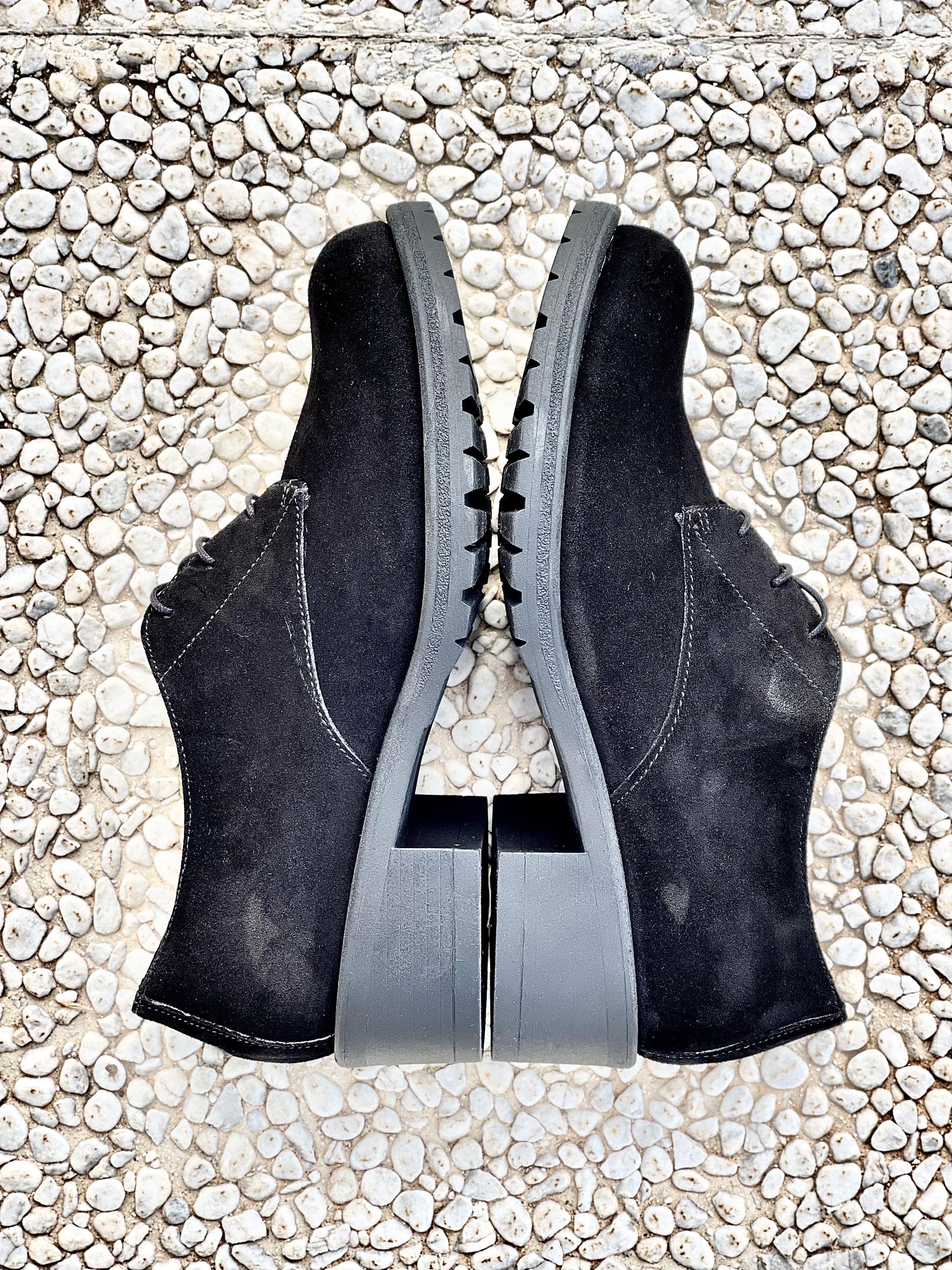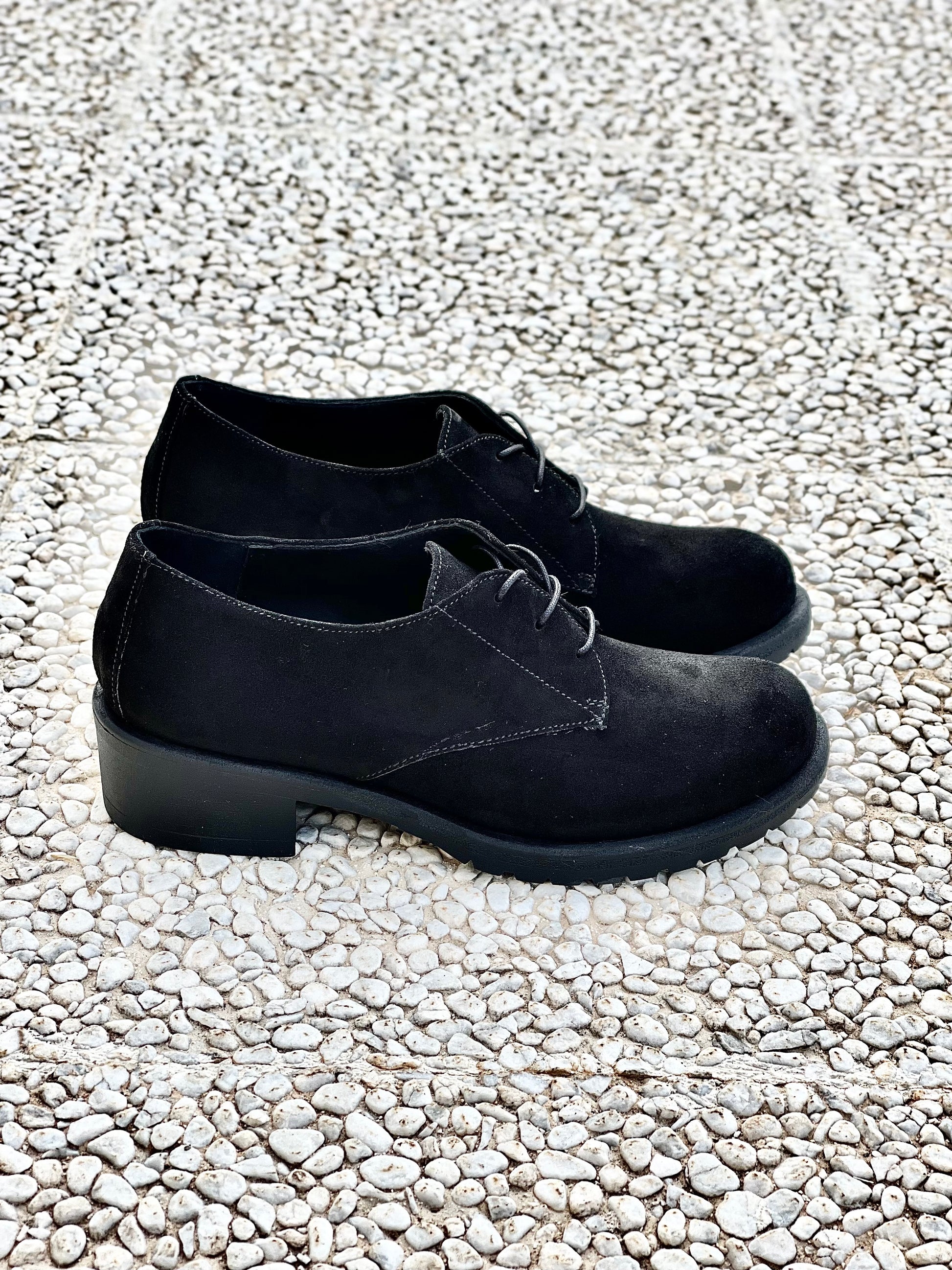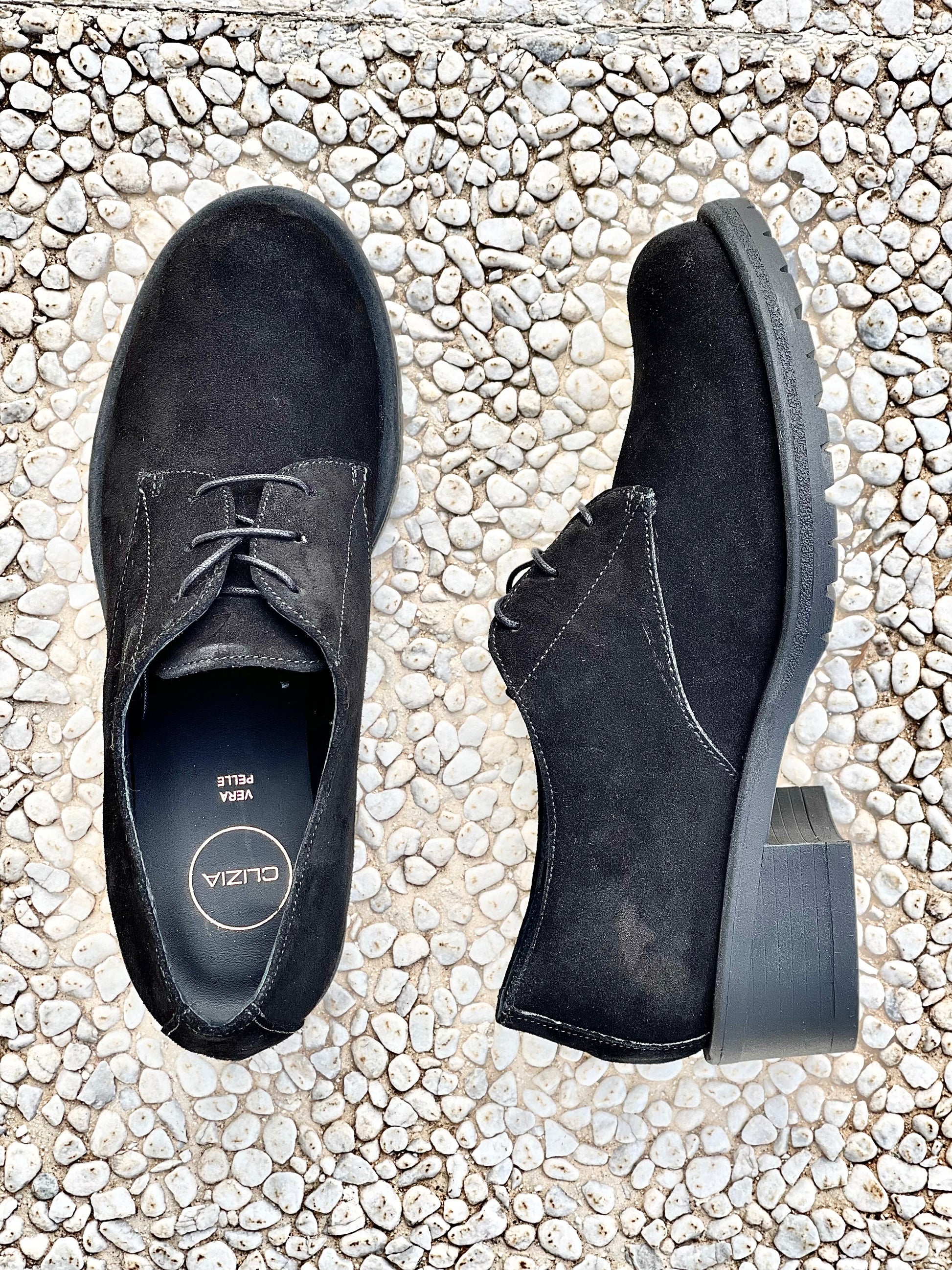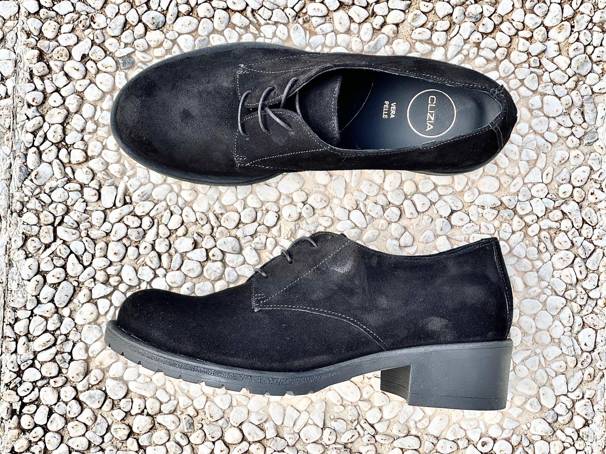 Damesderby met suède vetersluiting en hak van 3 cm.