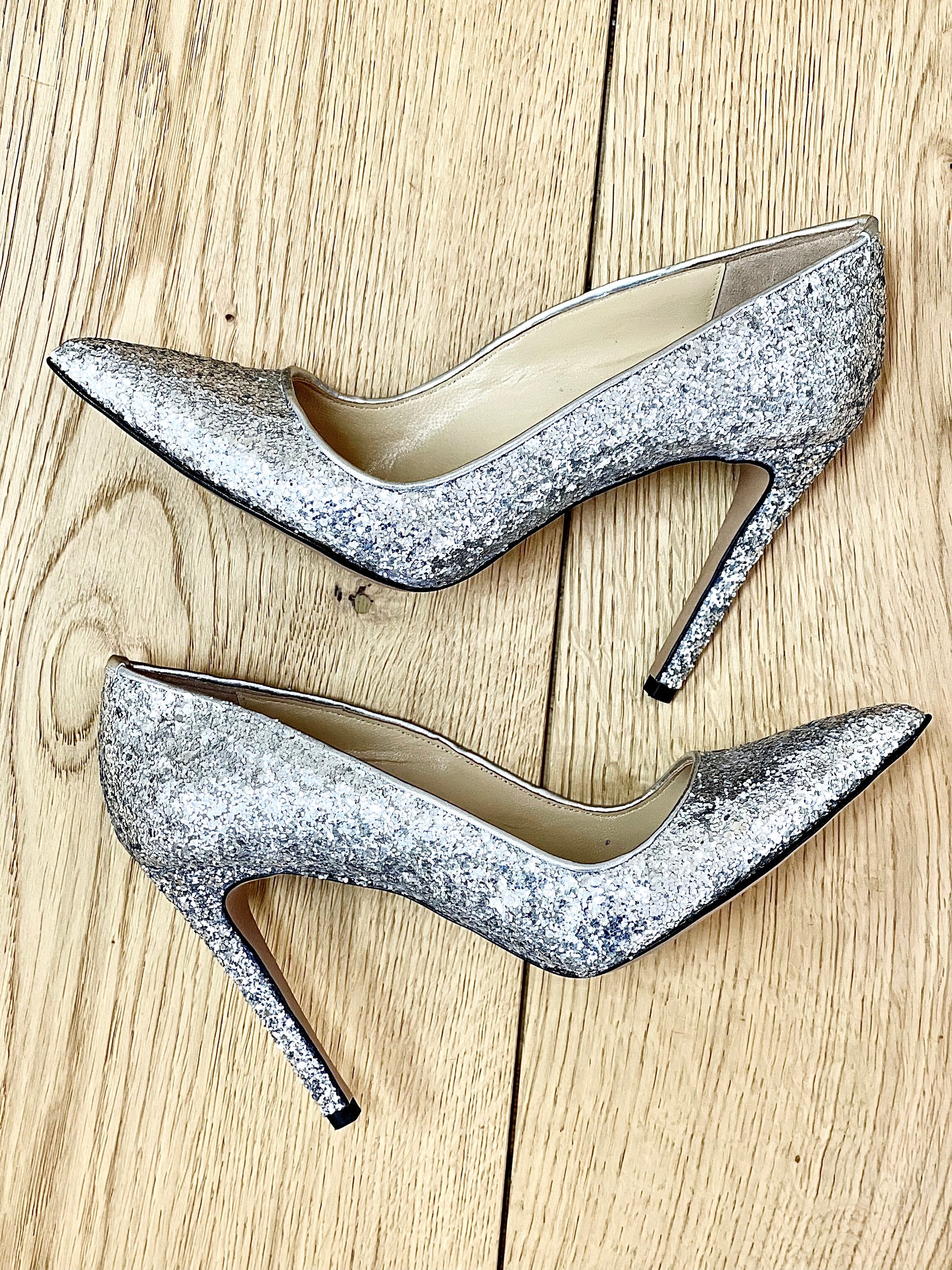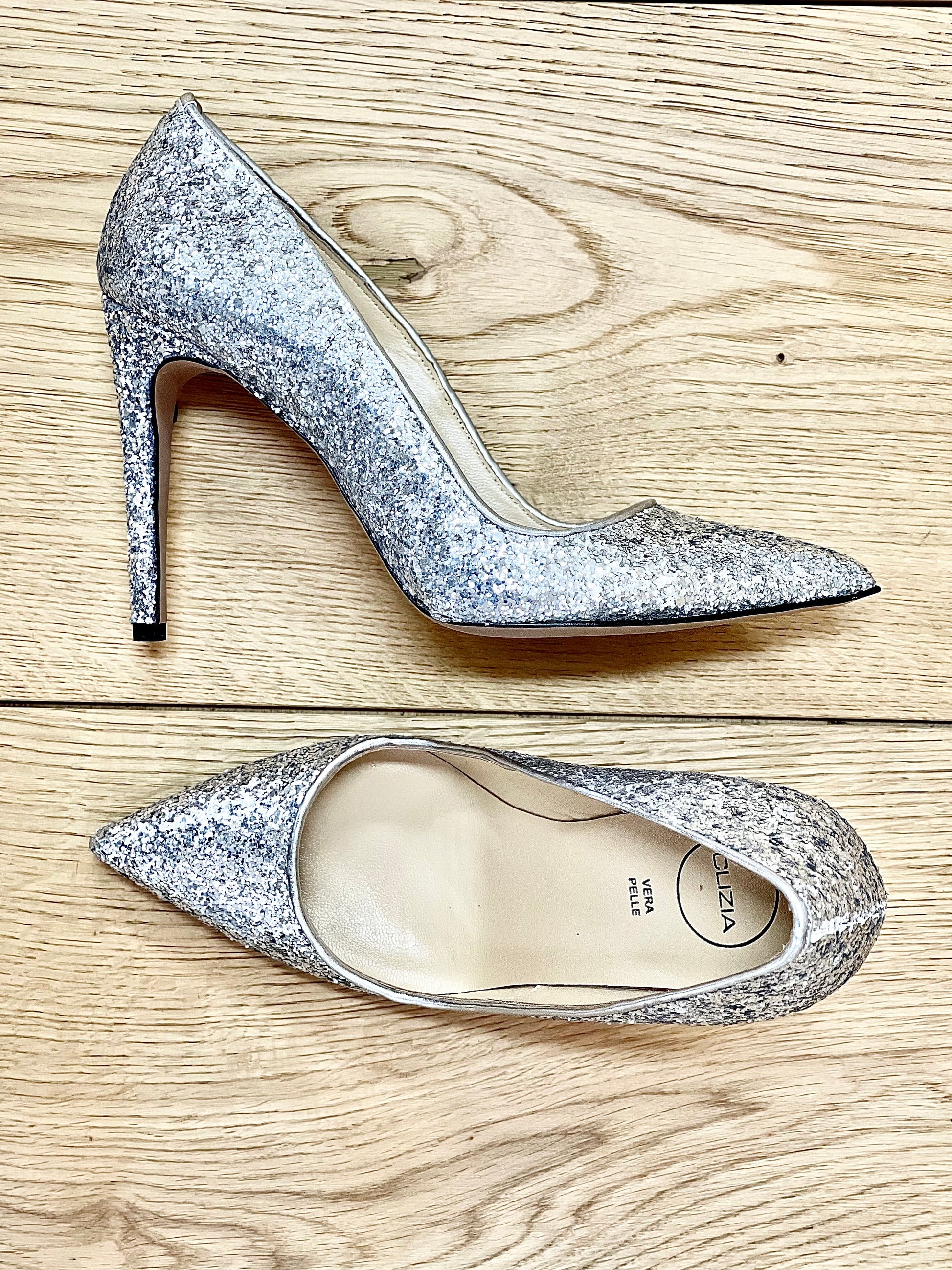 Pump met spitse teen in glitter met 10 cm hoge naaldhak.