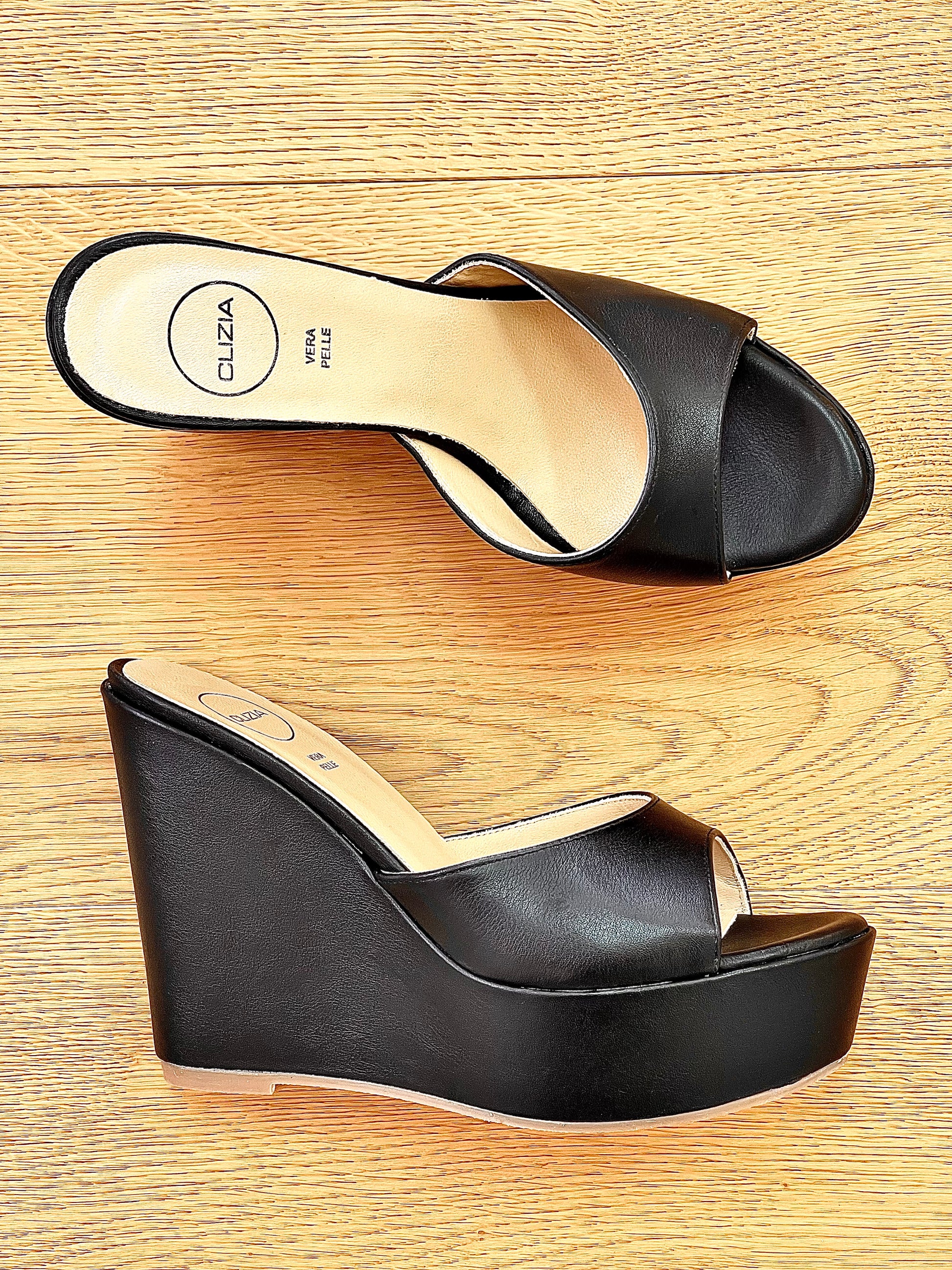 Wysokie skórzane sandały na 11-centymetrowym klinie.