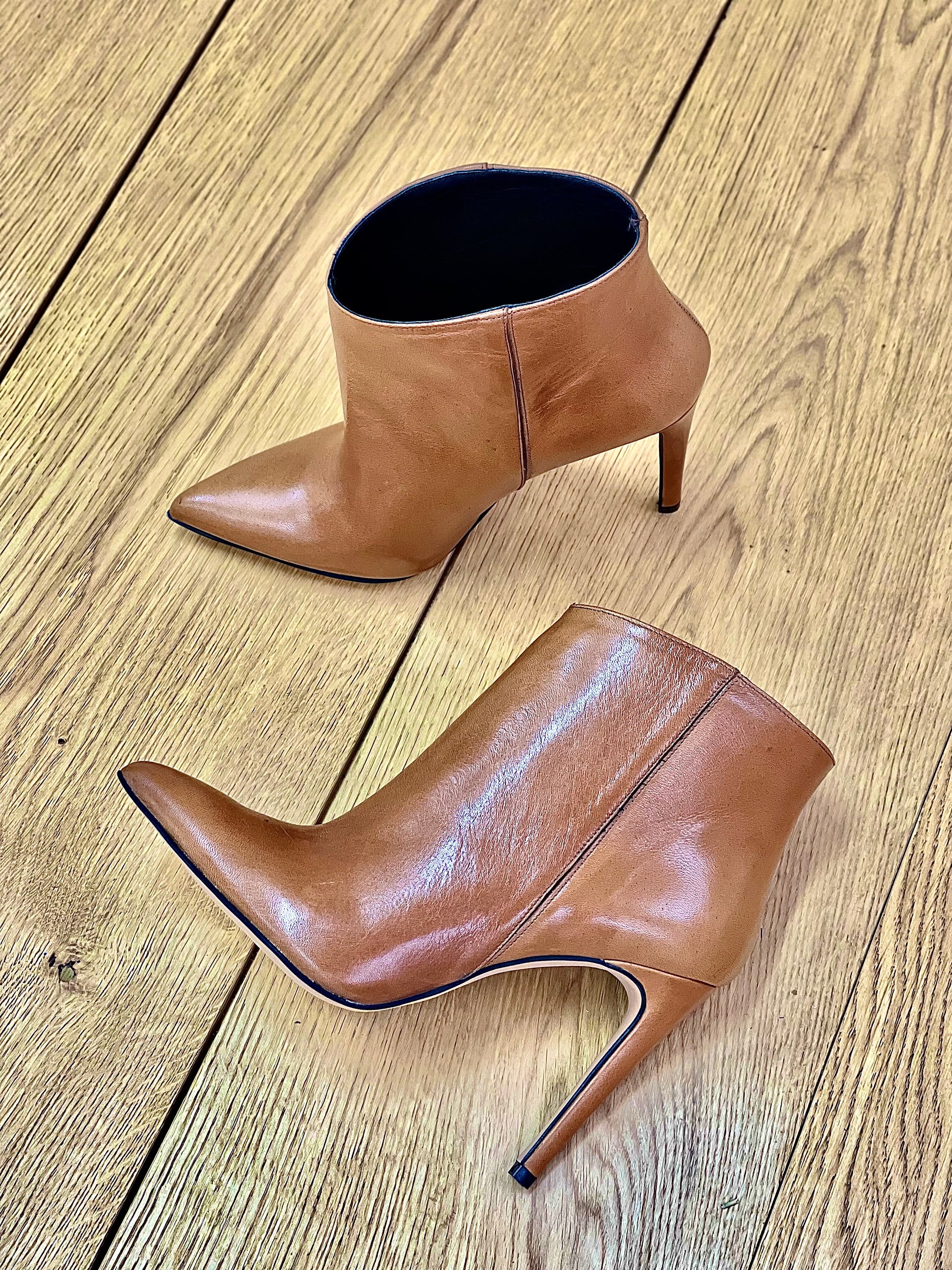 Eleganckie teksańskie buty za kostkę z 10-centymetrowym obcasem w szpic.