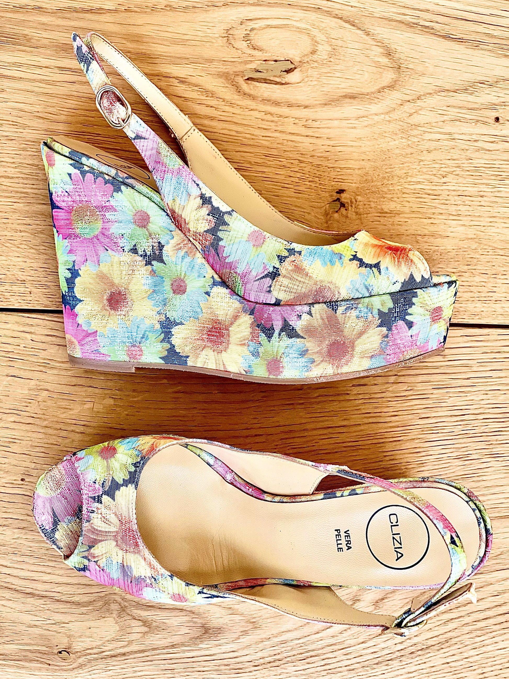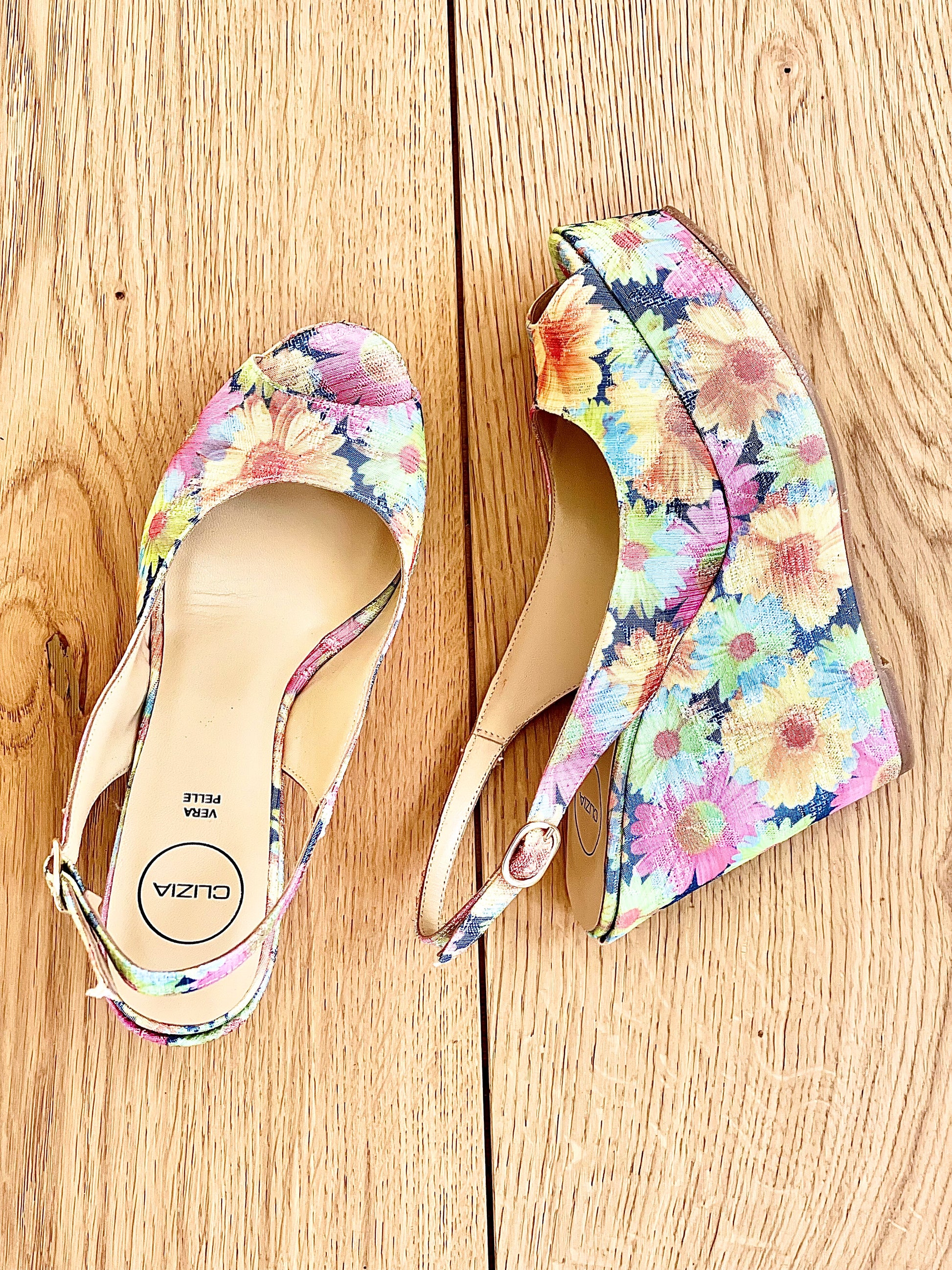 Wielokolorowe kwiatowe czółenka slingback na wysokim klinie.