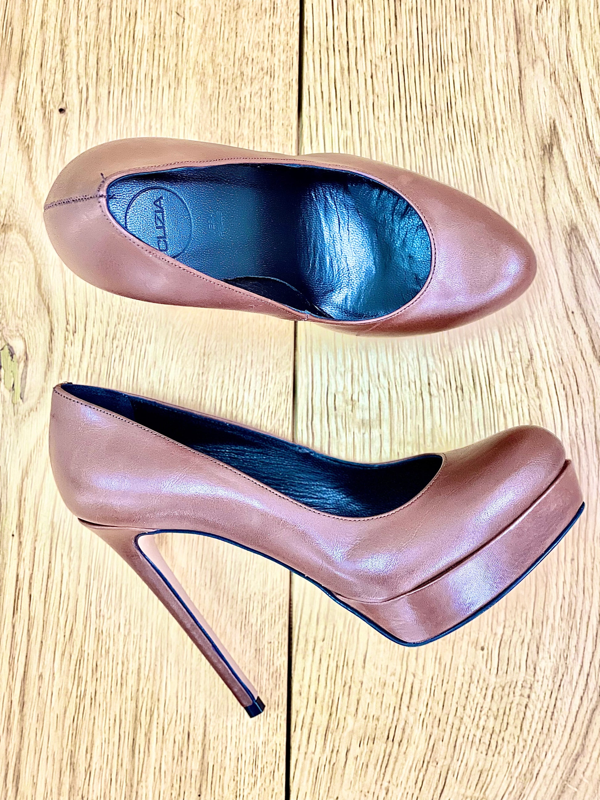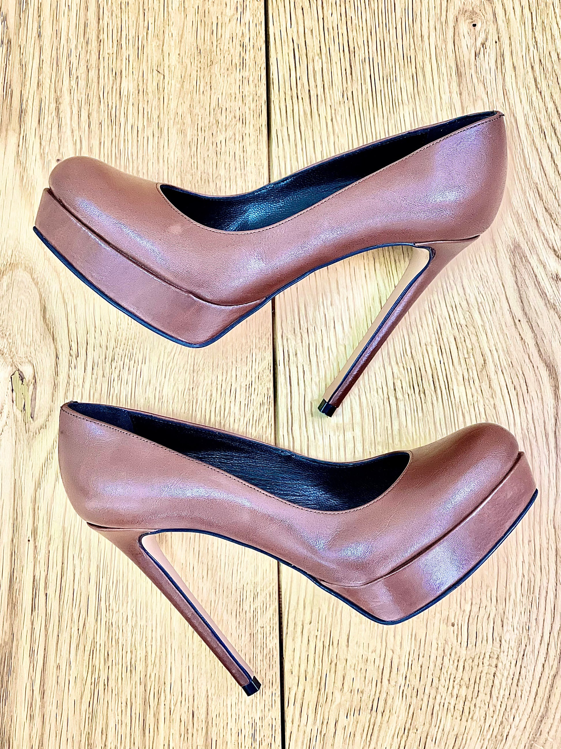 Okrągły nosek, skórzany dekolt, 12 cm obcas i 2 cm platforma.