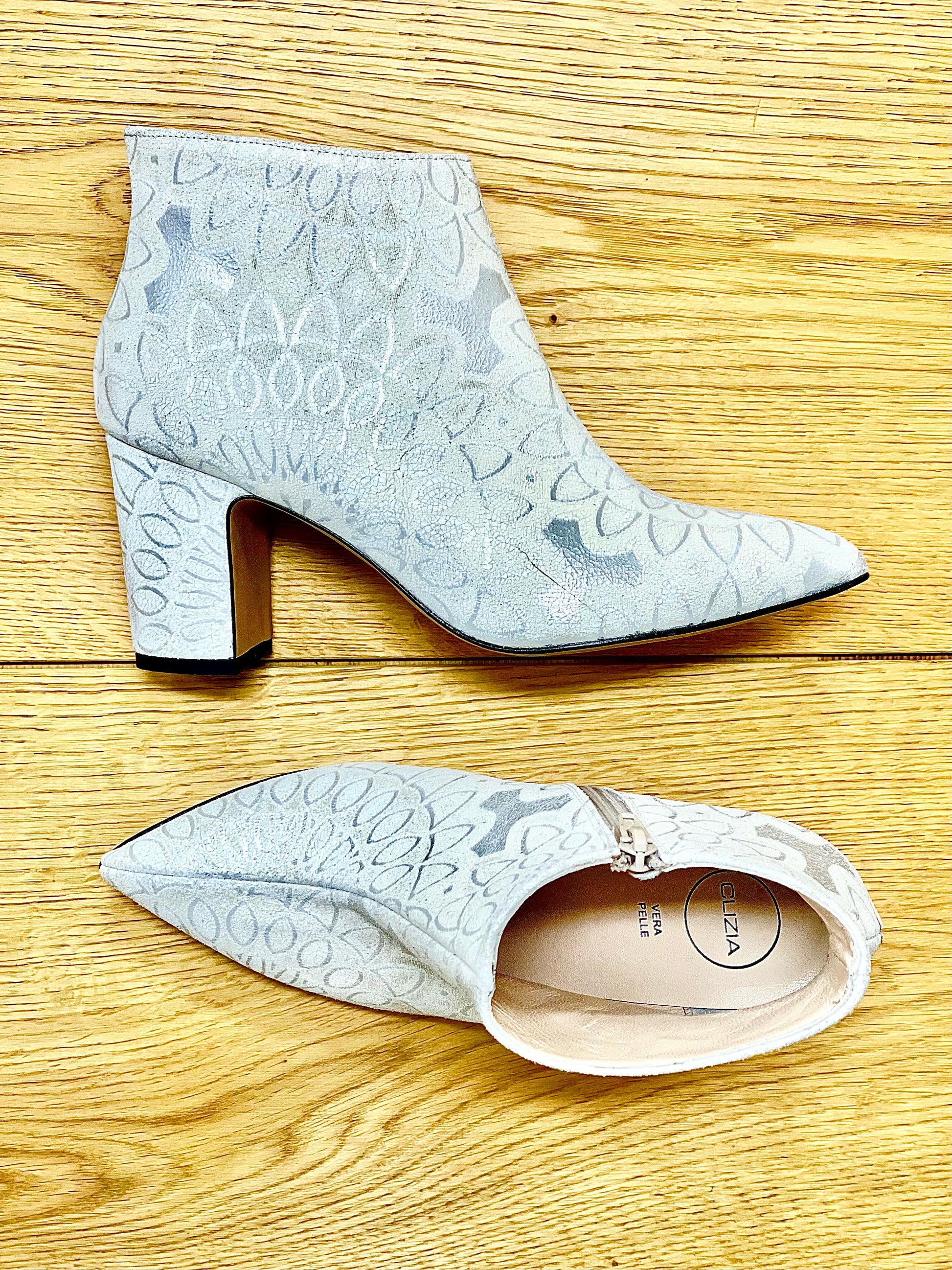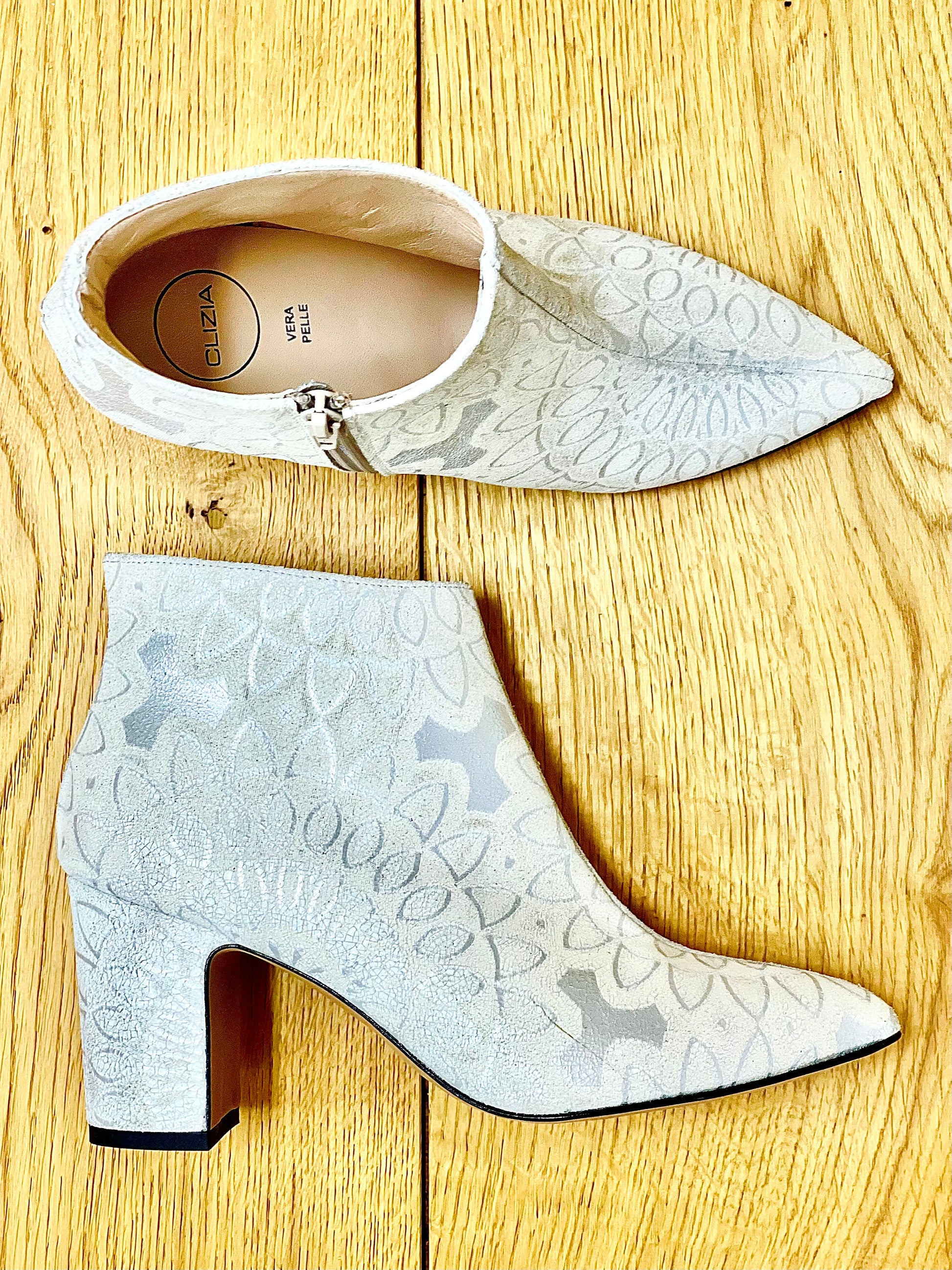 Botki z odkrytymi palcami na szerokim obcasie z etnicznym motywem z trzeszczącej skóry.