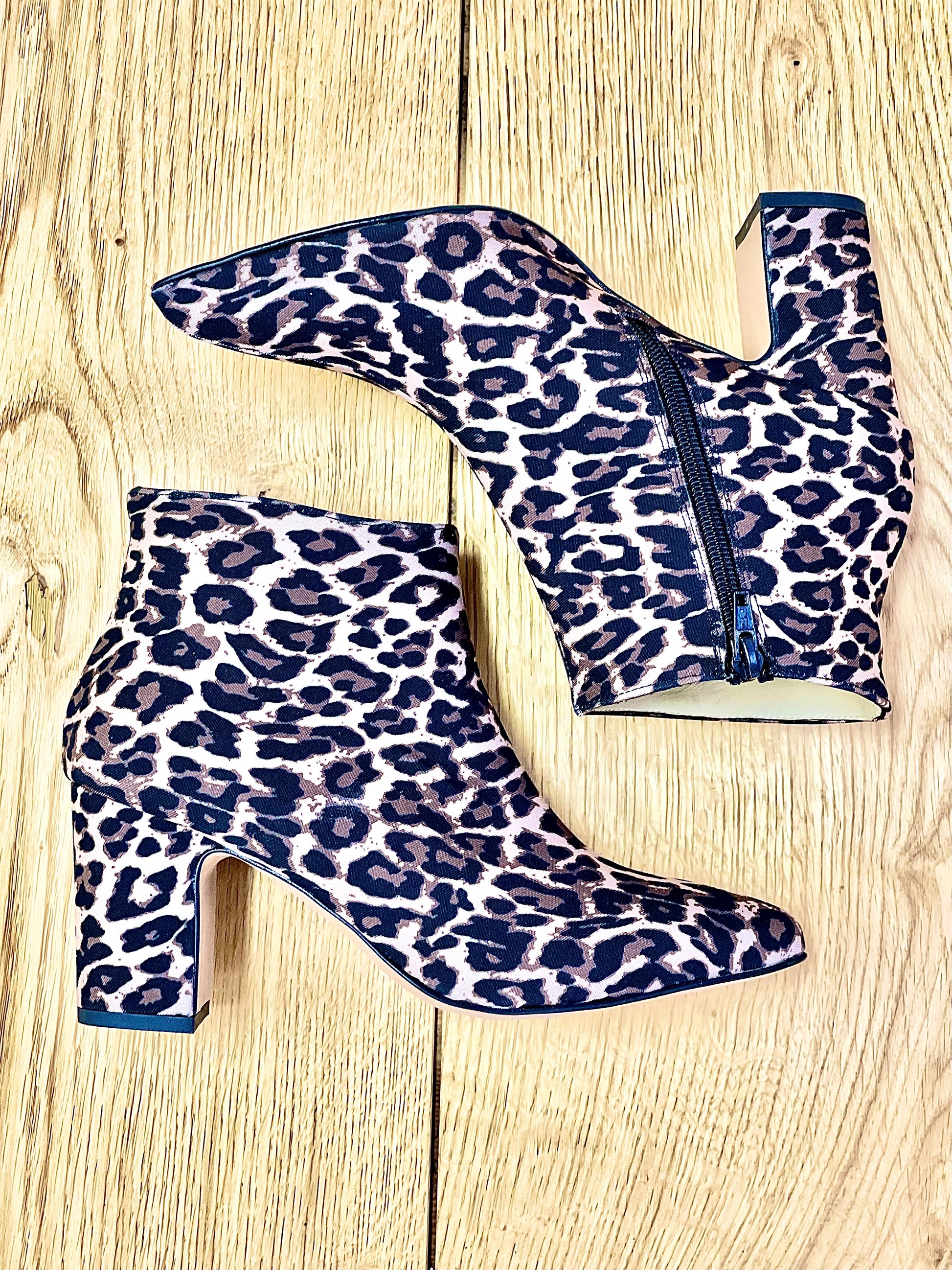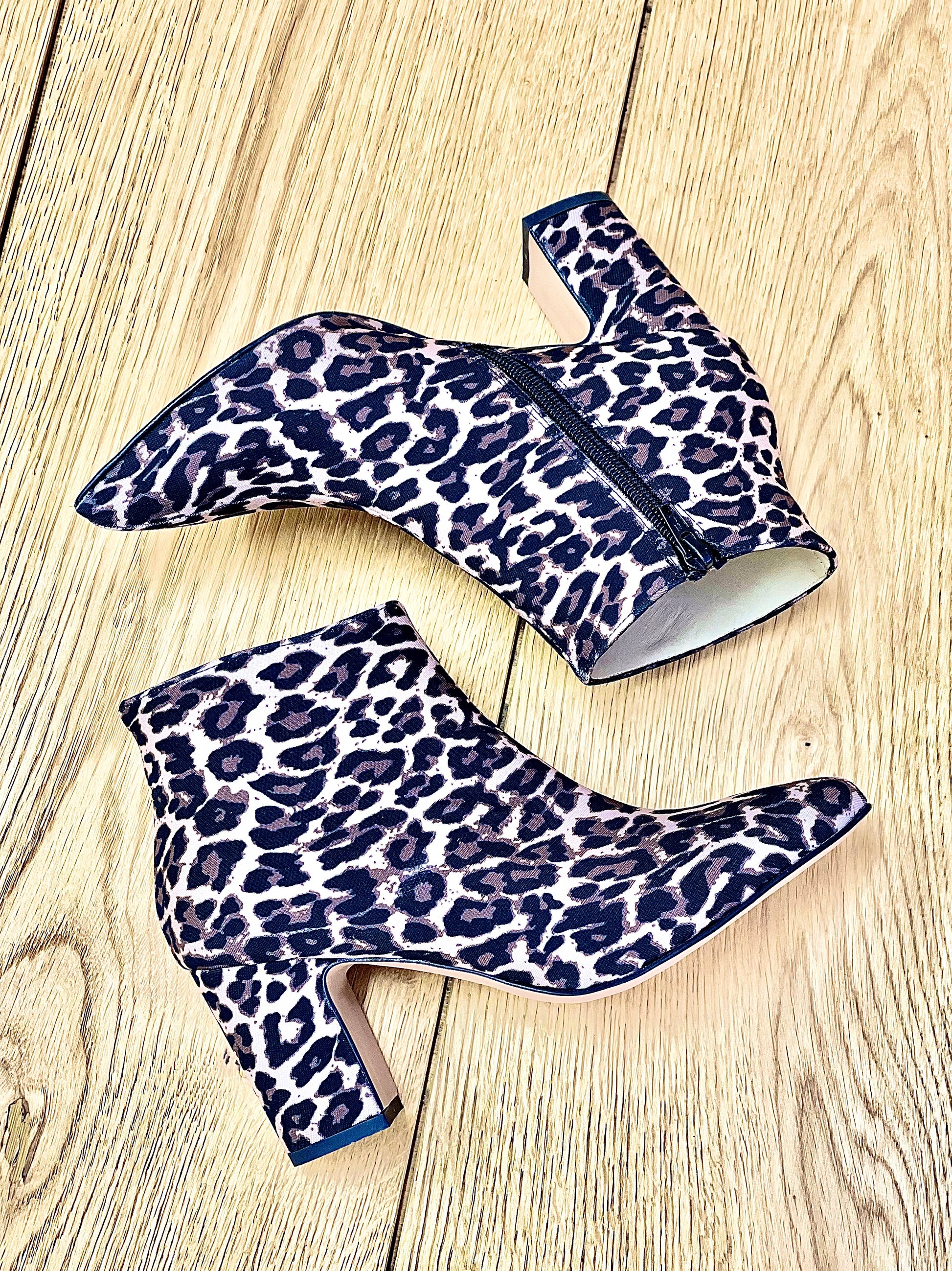 Buty za kostkę z szerokim obcasem z materiału w panterkę.