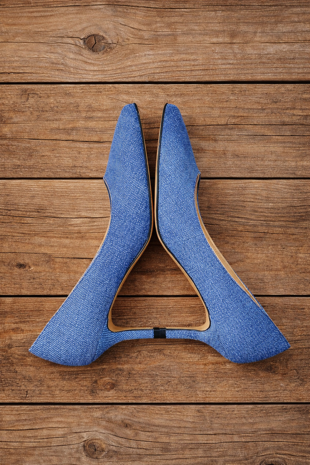 Szpilki z wydłużonym czubkiem z dżinsu, obcas 6 cm.