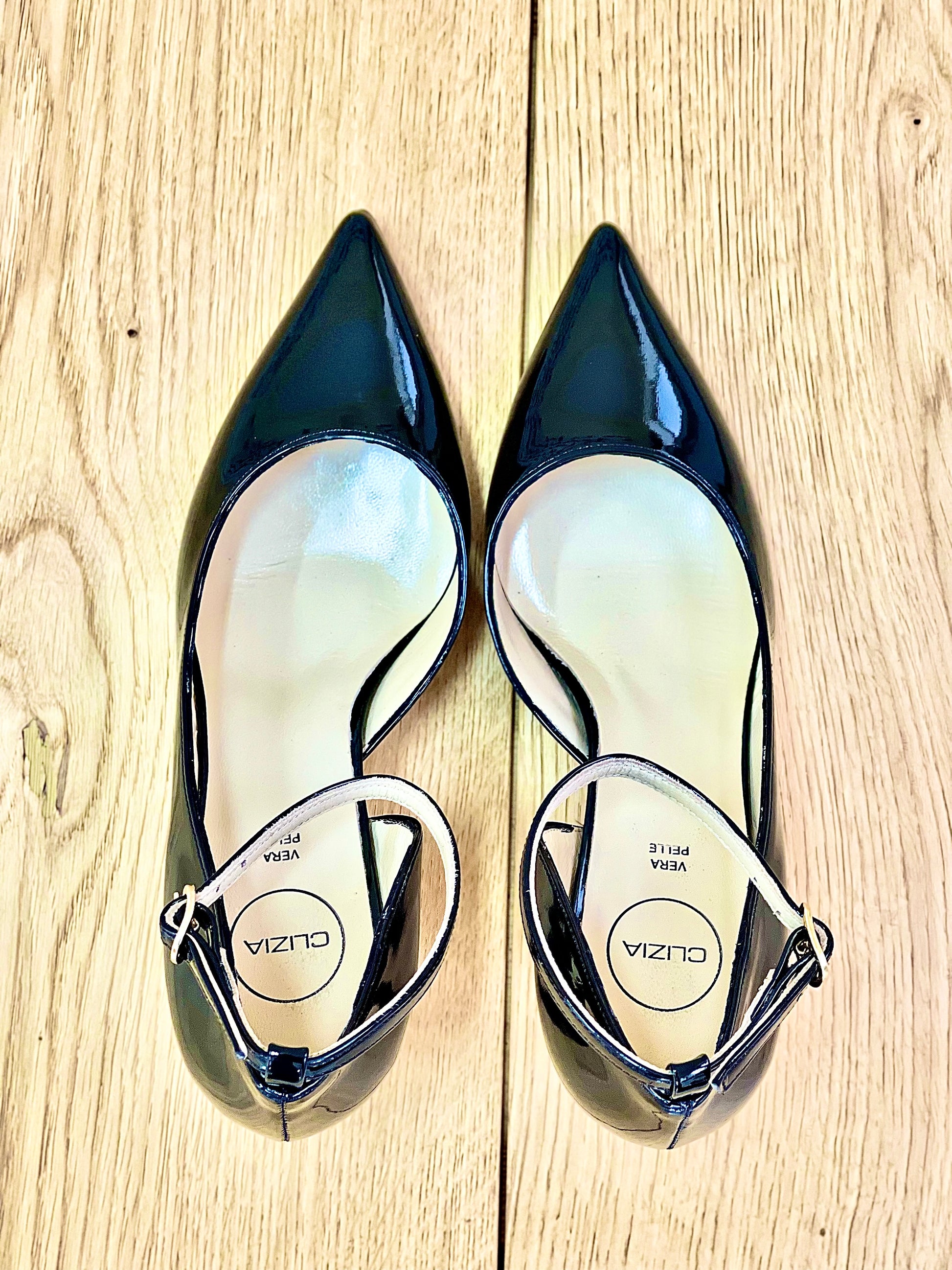 Szpiczasty dekolt z odkrytymi palcami z lakierowanej skóry, 7,5 cm szpilka.