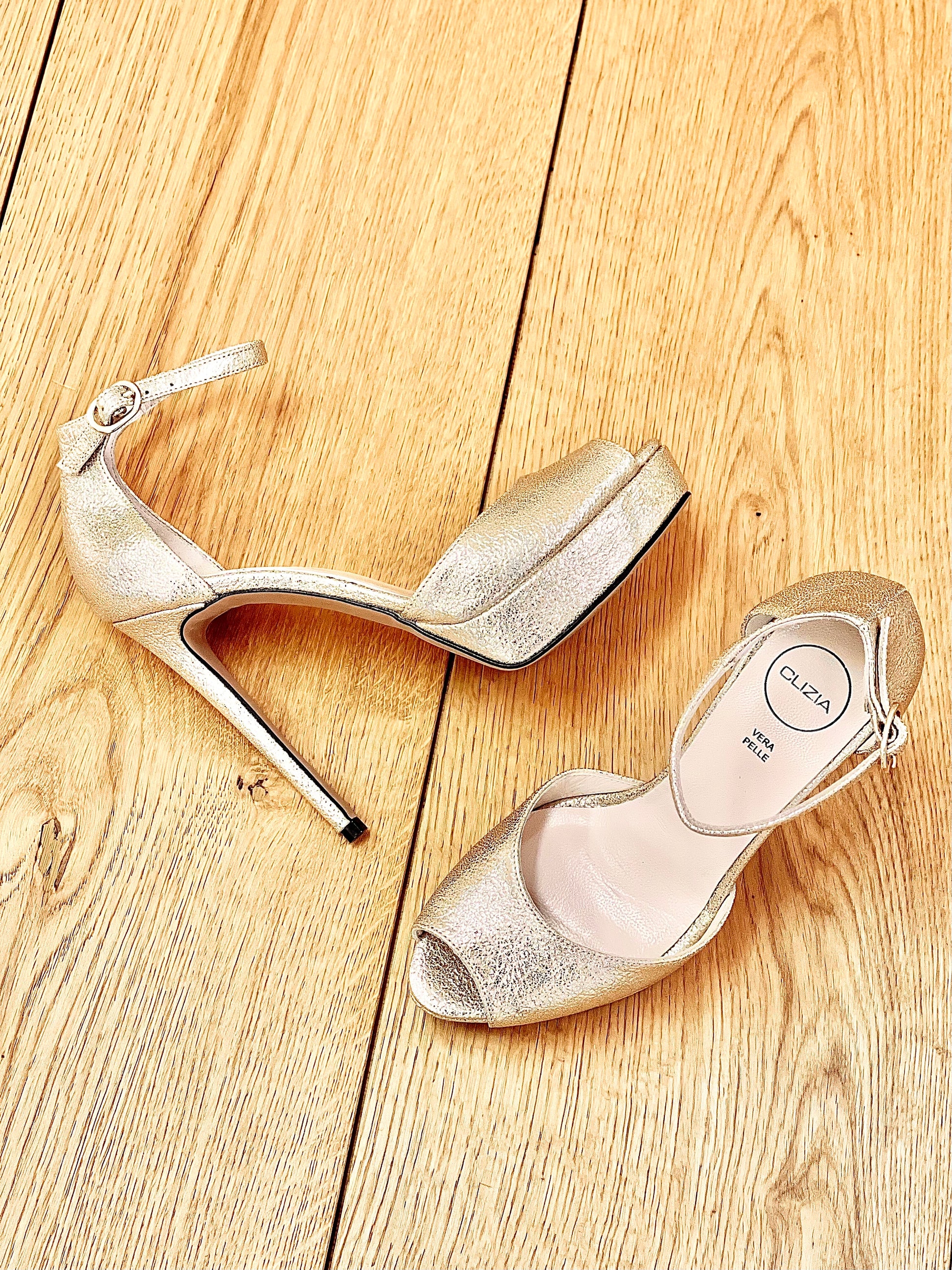 Laminowane sandały na obcasie 12 cm i platformie 2 cm.