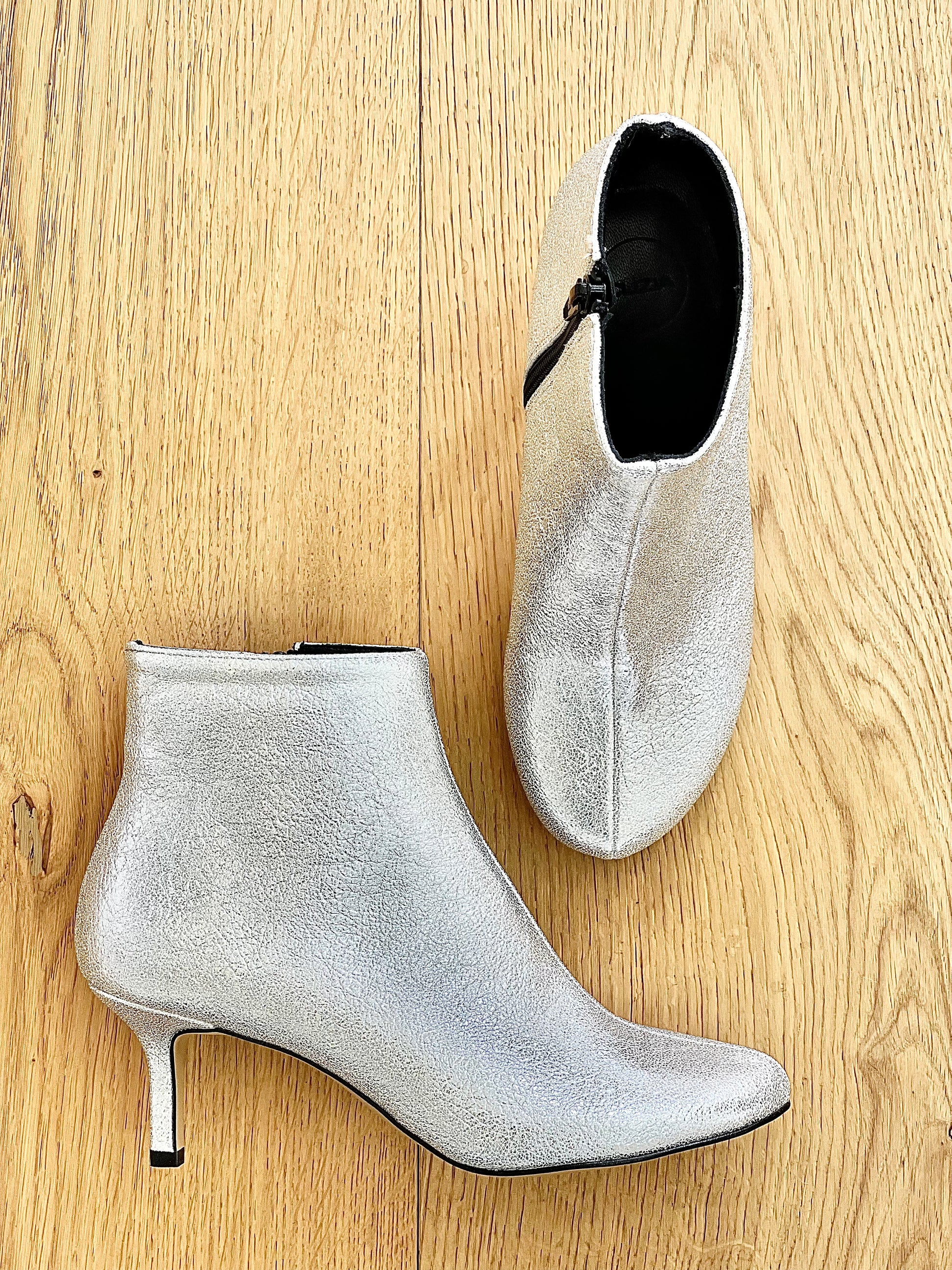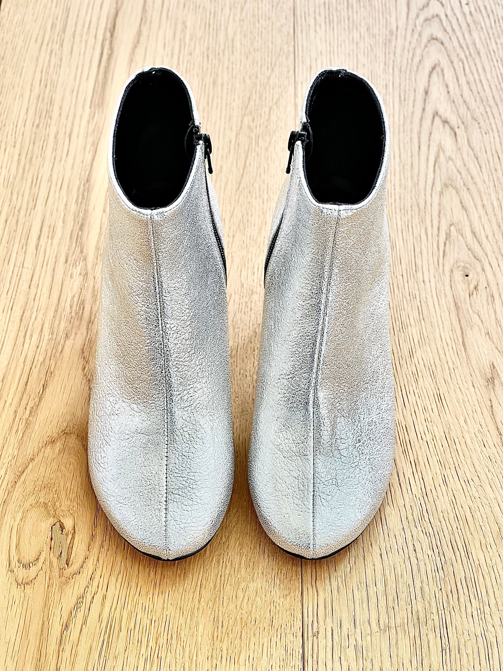 Laminowane botki z okrągłym noskiem i 6-centymetrowym obcasem.