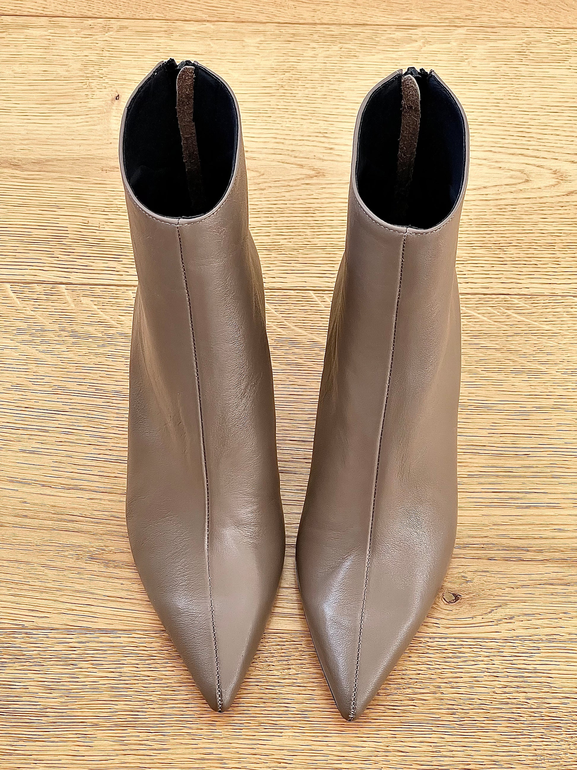 Botki na szpilce z zamkiem błyskawicznym z tyłu.