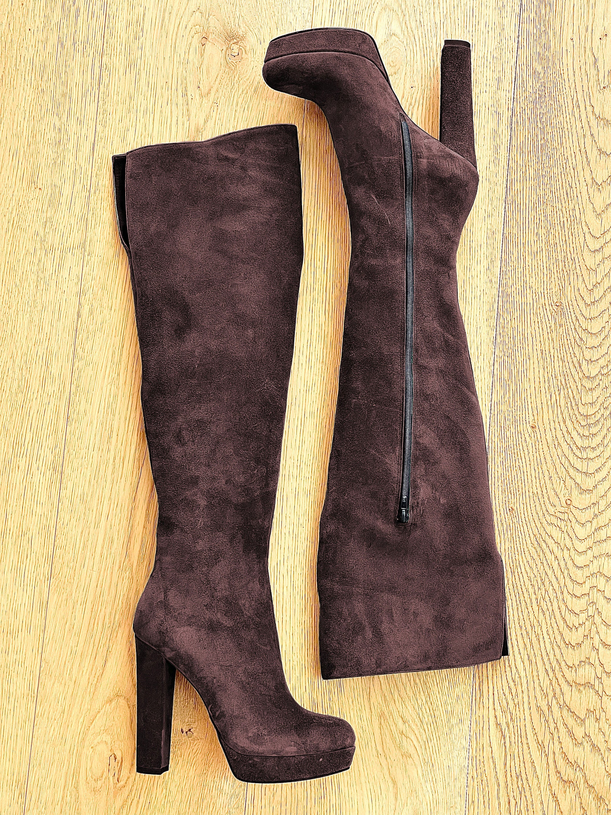 Kozaki za kolano z okrągłym noskiem, zamszowym szerokim obcasem i platformą.