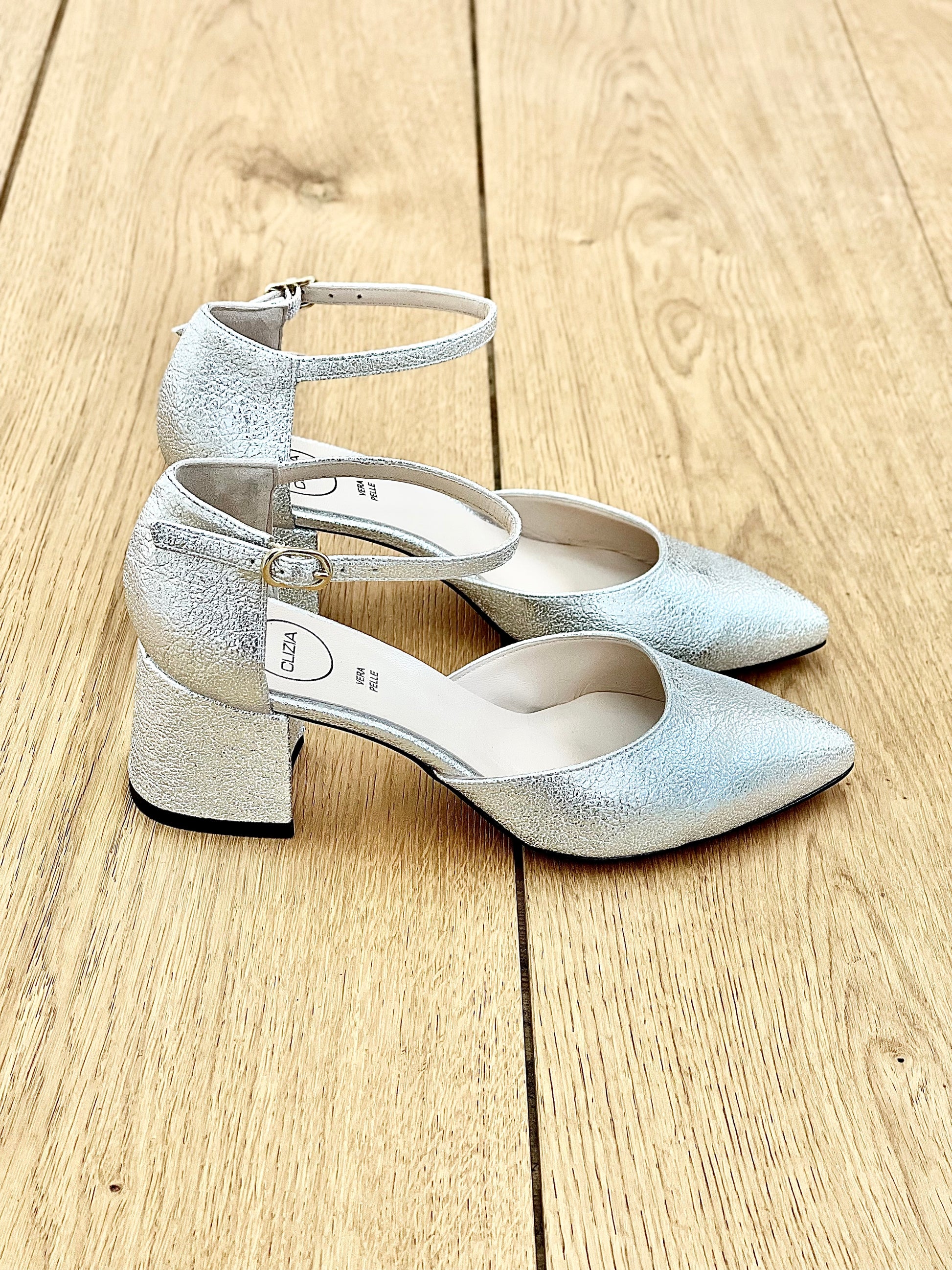 Szpiczasty nosek i dekolt w szpic z laminowanym szerokim obcasem.