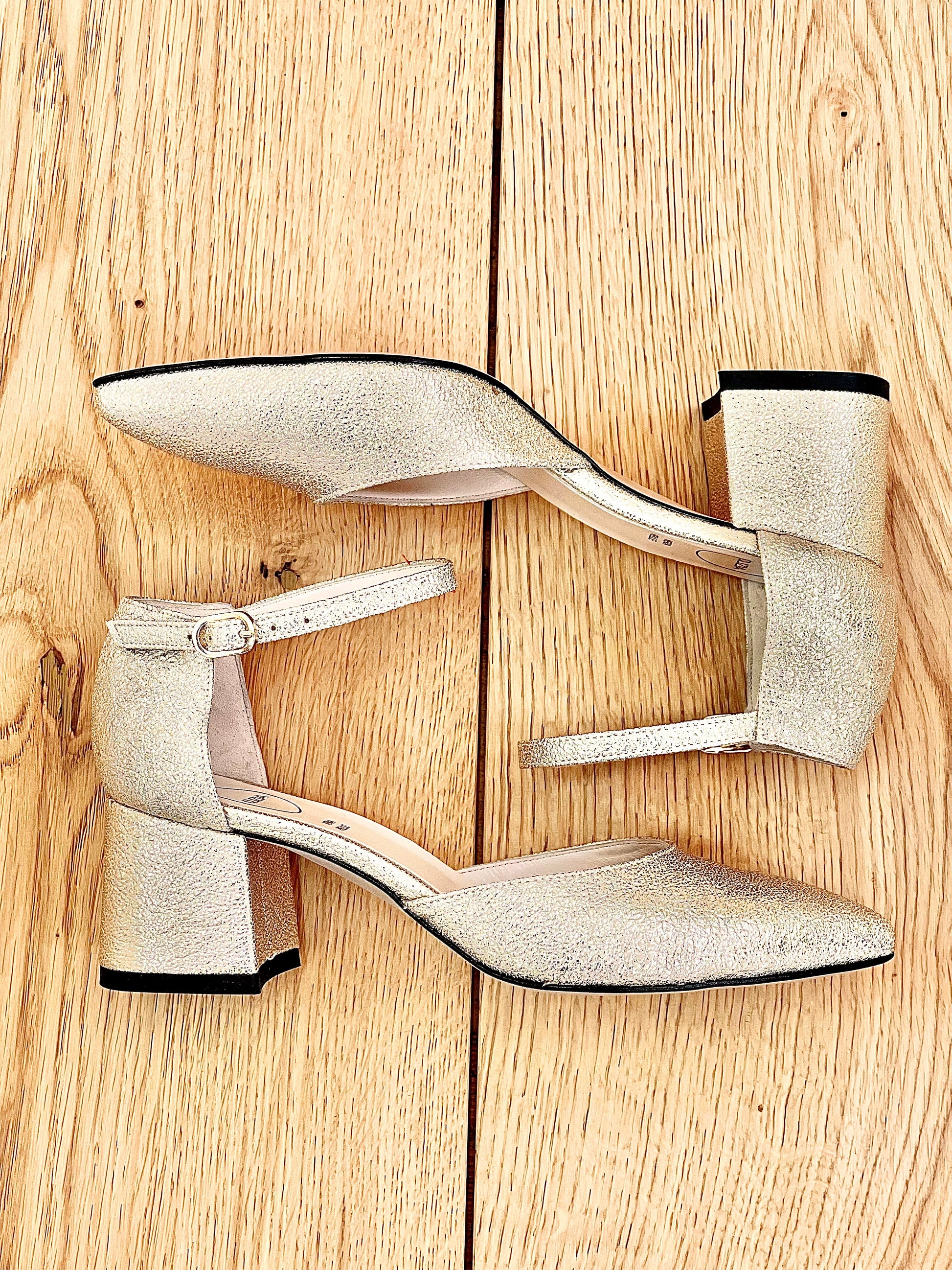 Szpiczasty nosek i dekolt w szpic z laminowanym szerokim obcasem.
