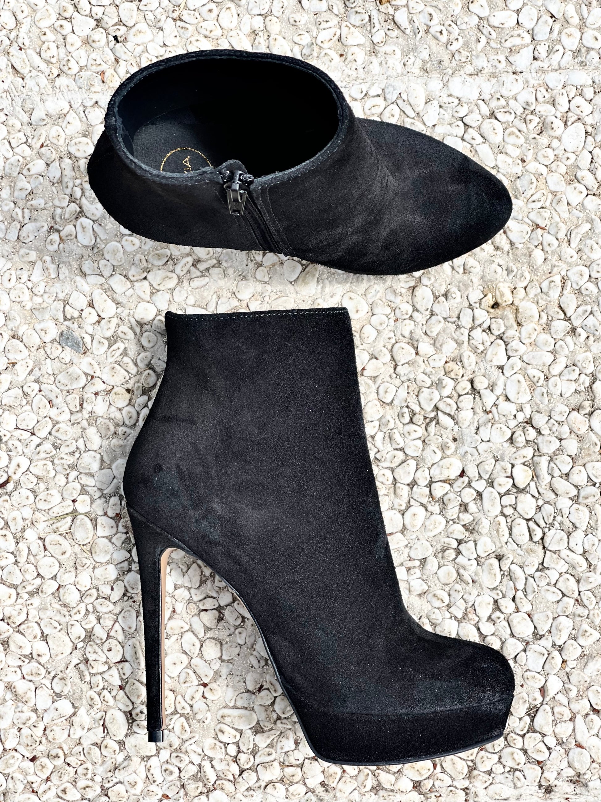Zamszowe buty za kostkę na 12-centymetrowym obcasie i 2-centymetrowej platformie z wewnętrznym zamkiem błyskawicznym.