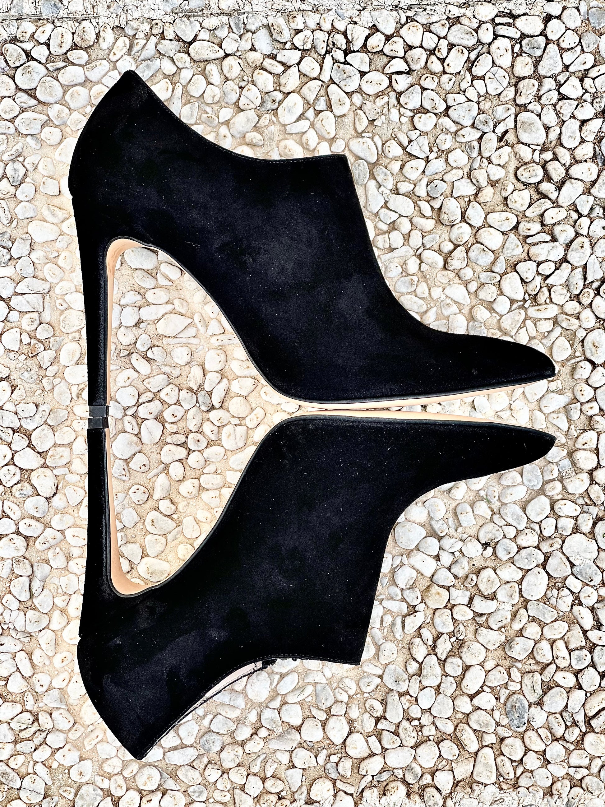 Szpiczasty palec u nogi, zamszowe szpilki na 10-centymetrowym obcasie.