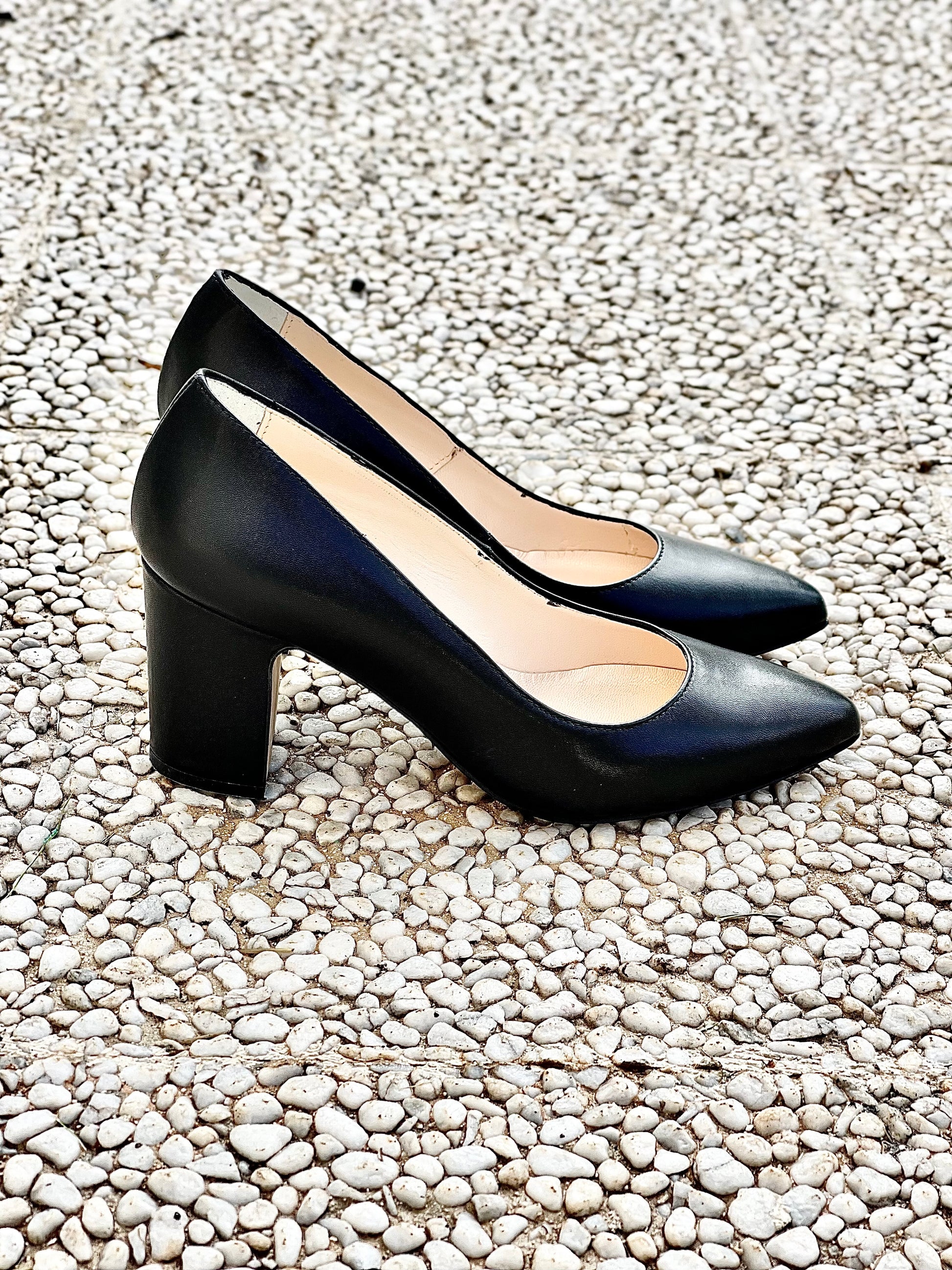 Szpiczaste czółenka na skórzanym obcasie o szerokości 75 mm.