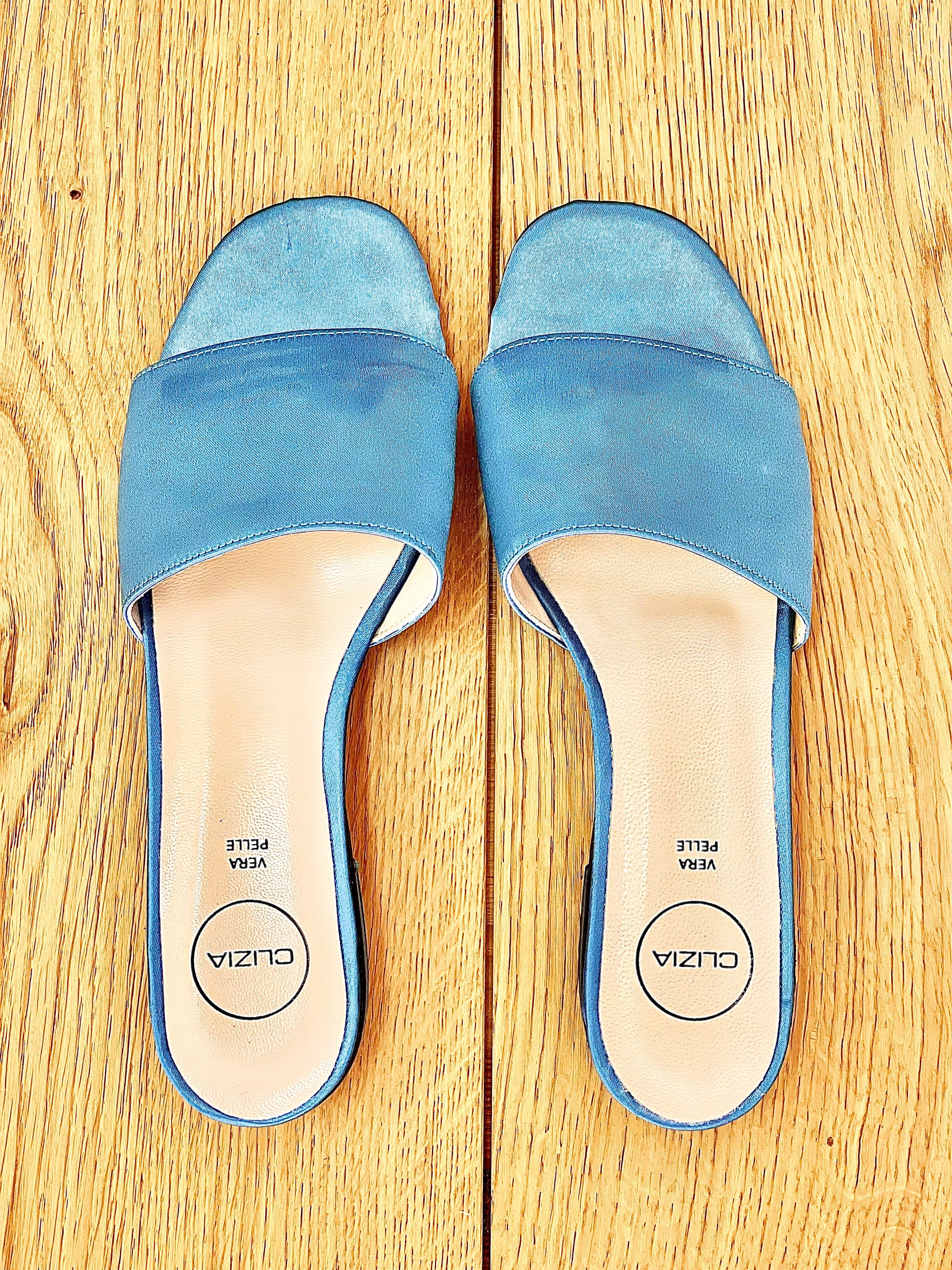 Niskie sandały mules z satynowym szerokim obcasem 2cm.