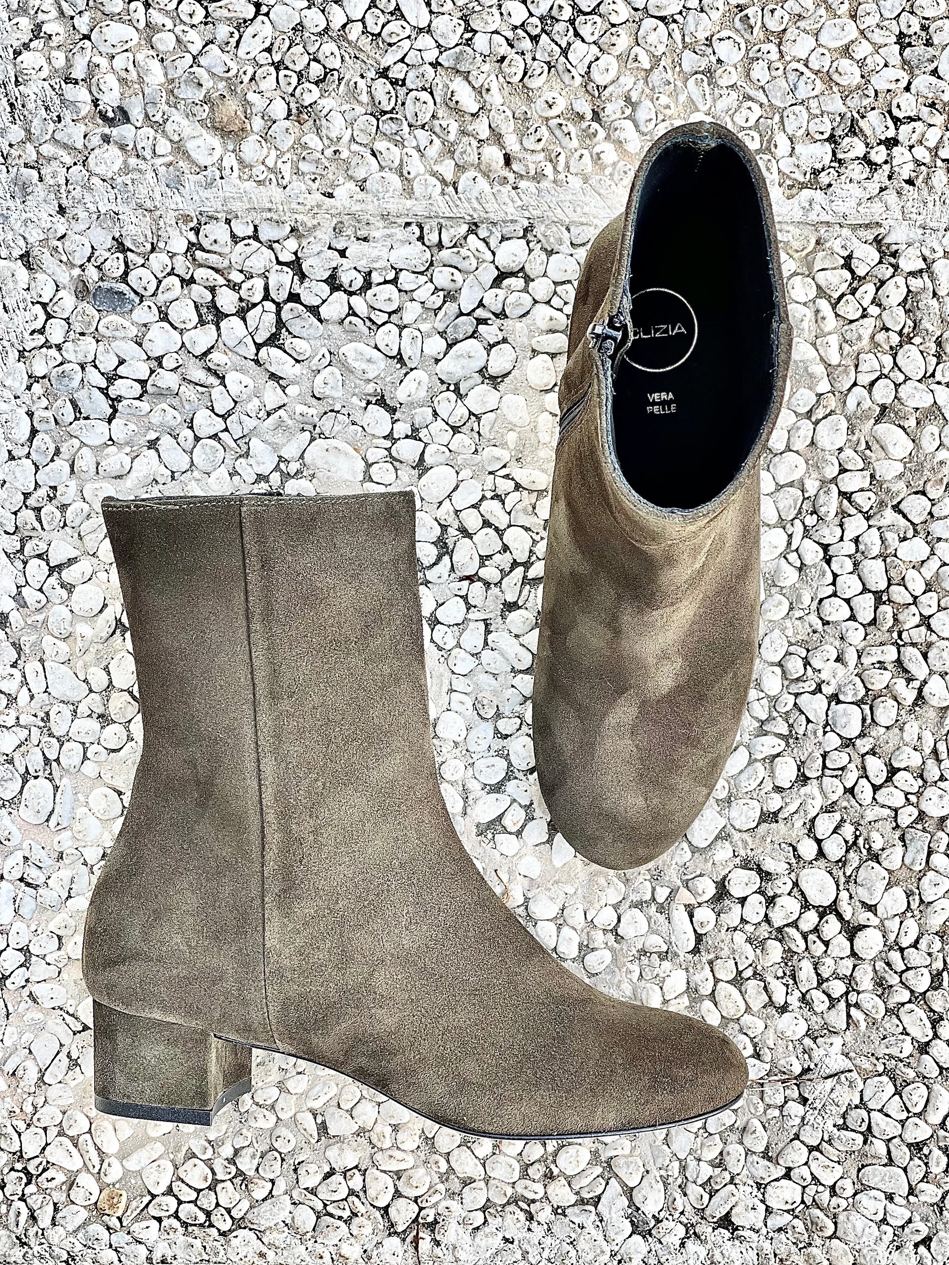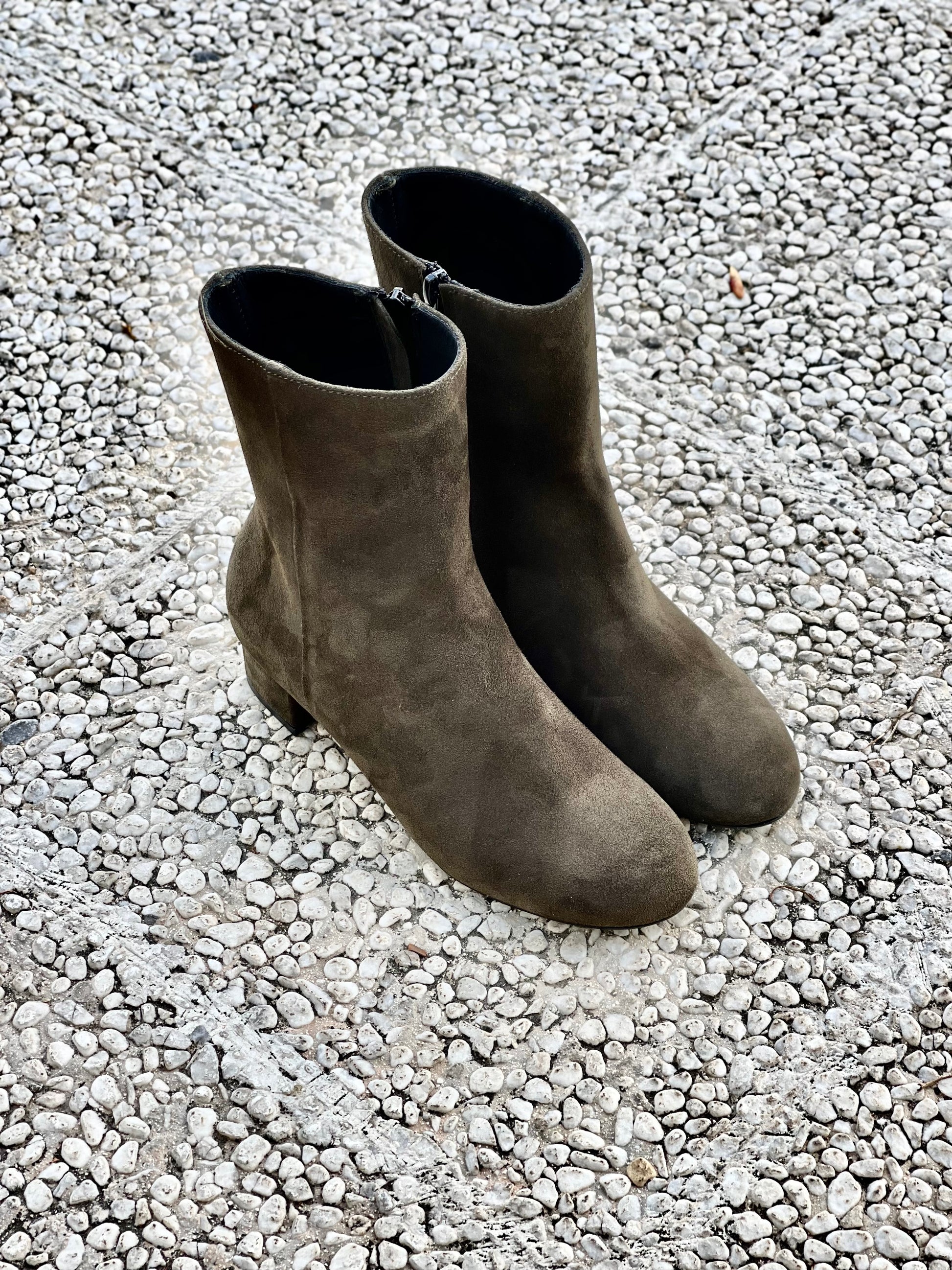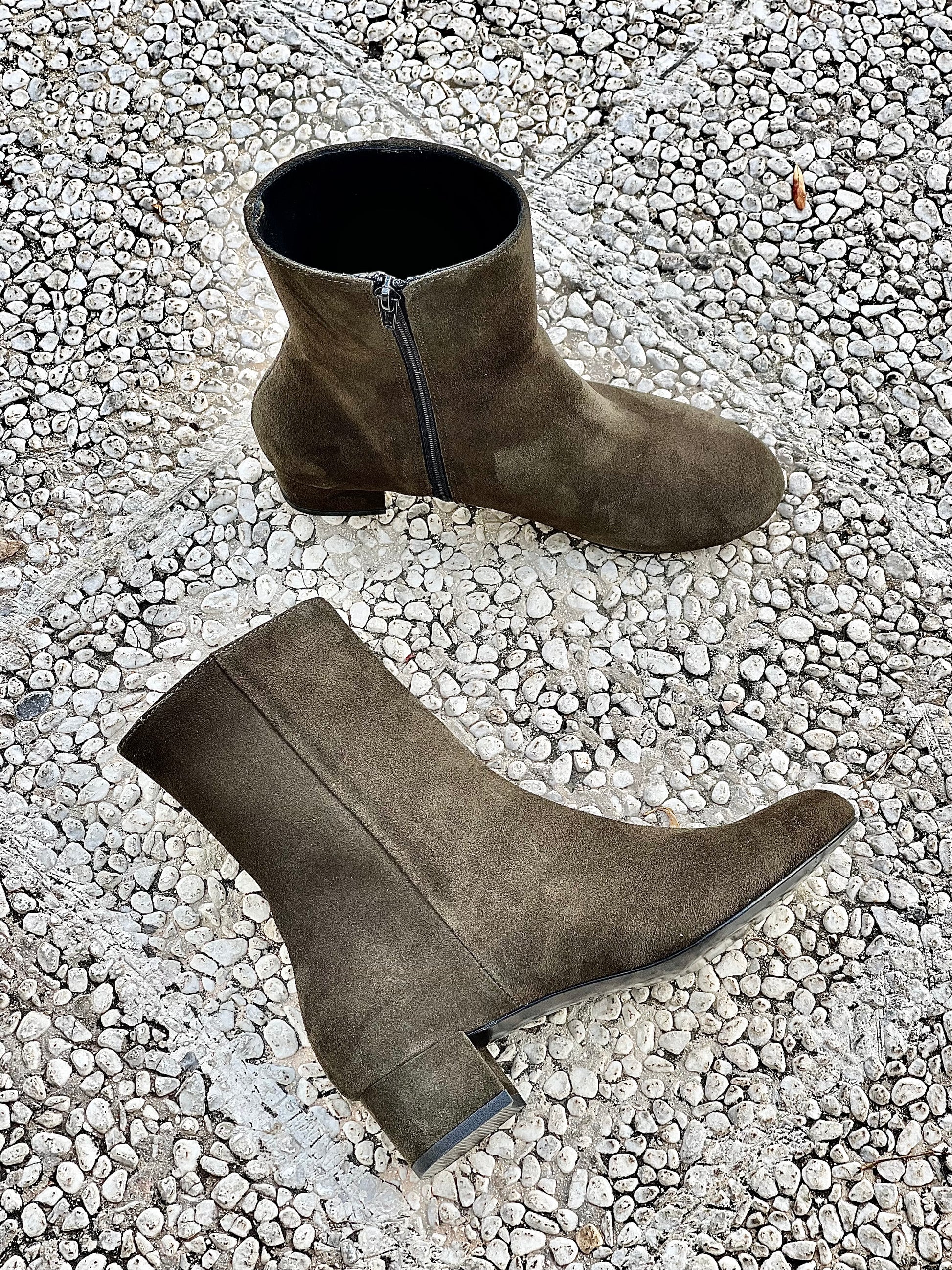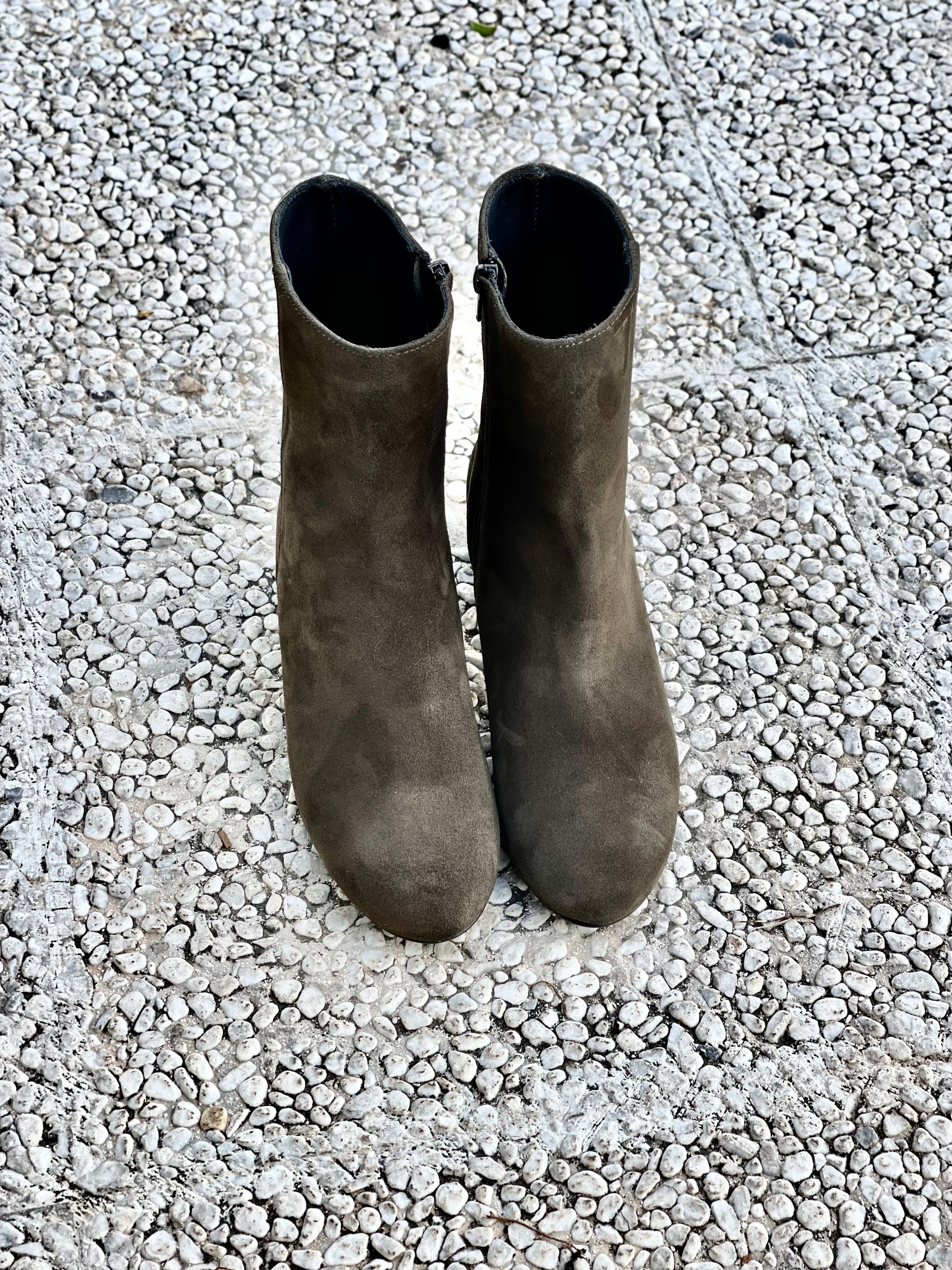 Zamszowe botki z okrągłym noskiem i 4 cm szerokim obcasem.