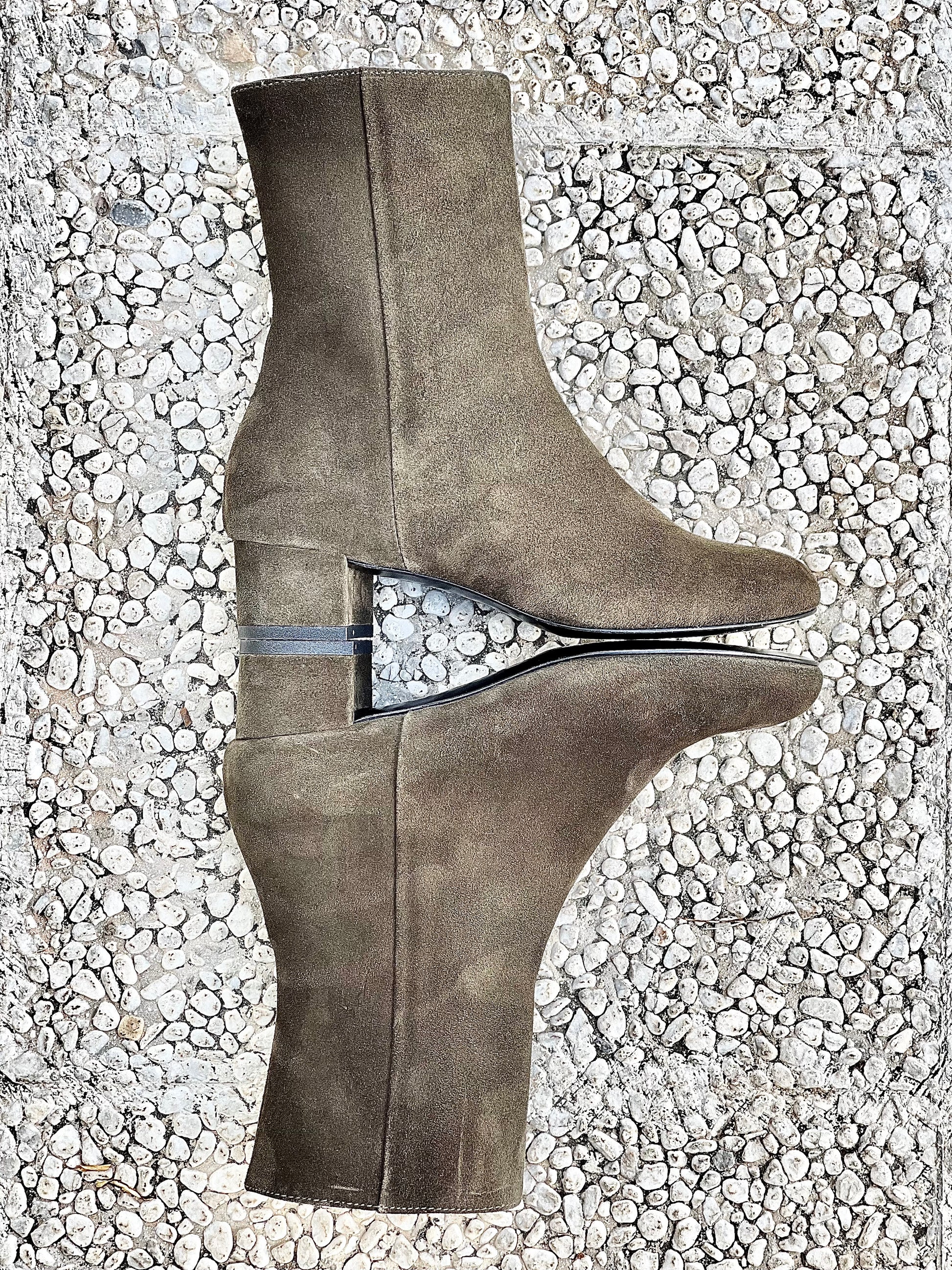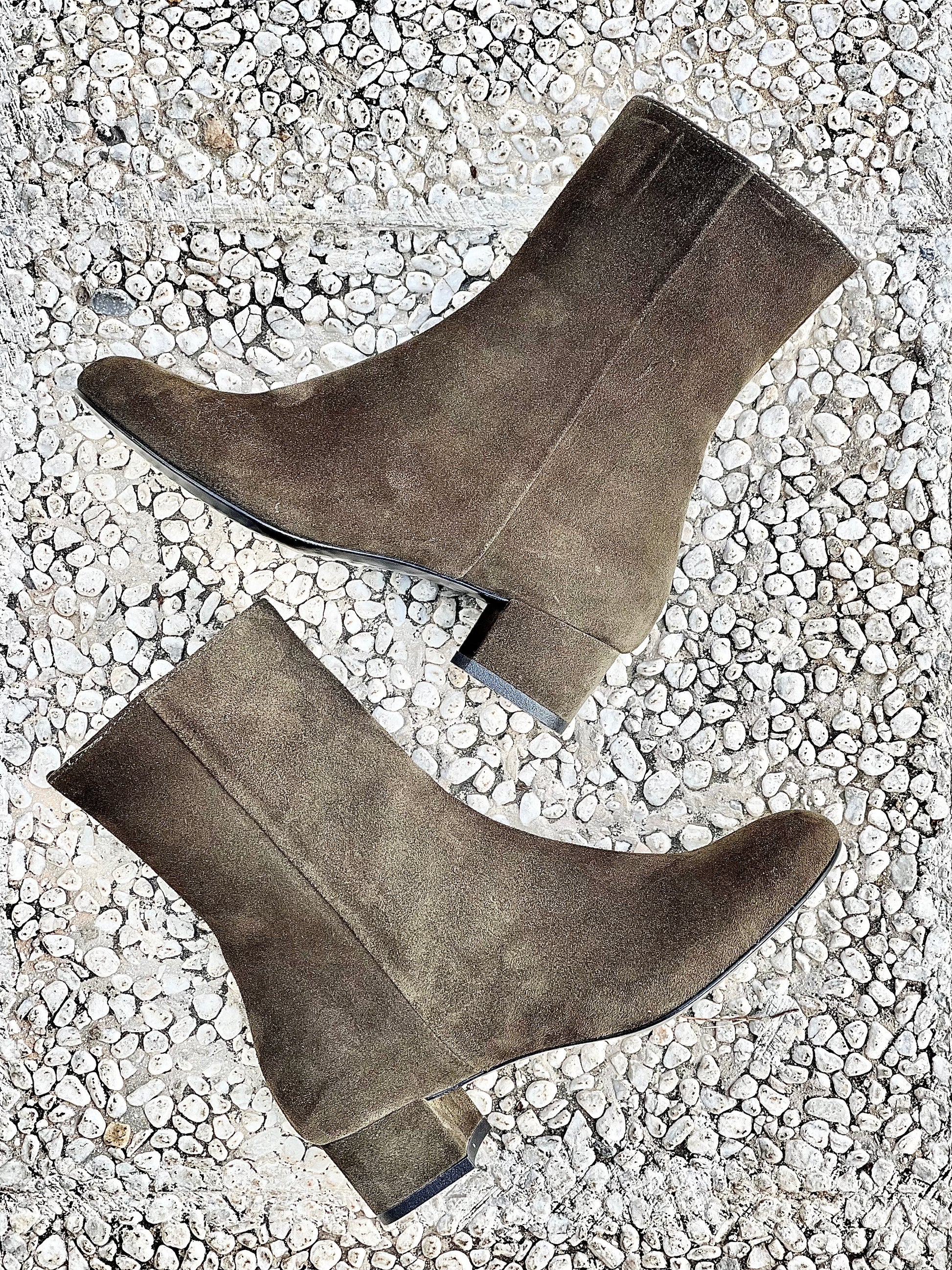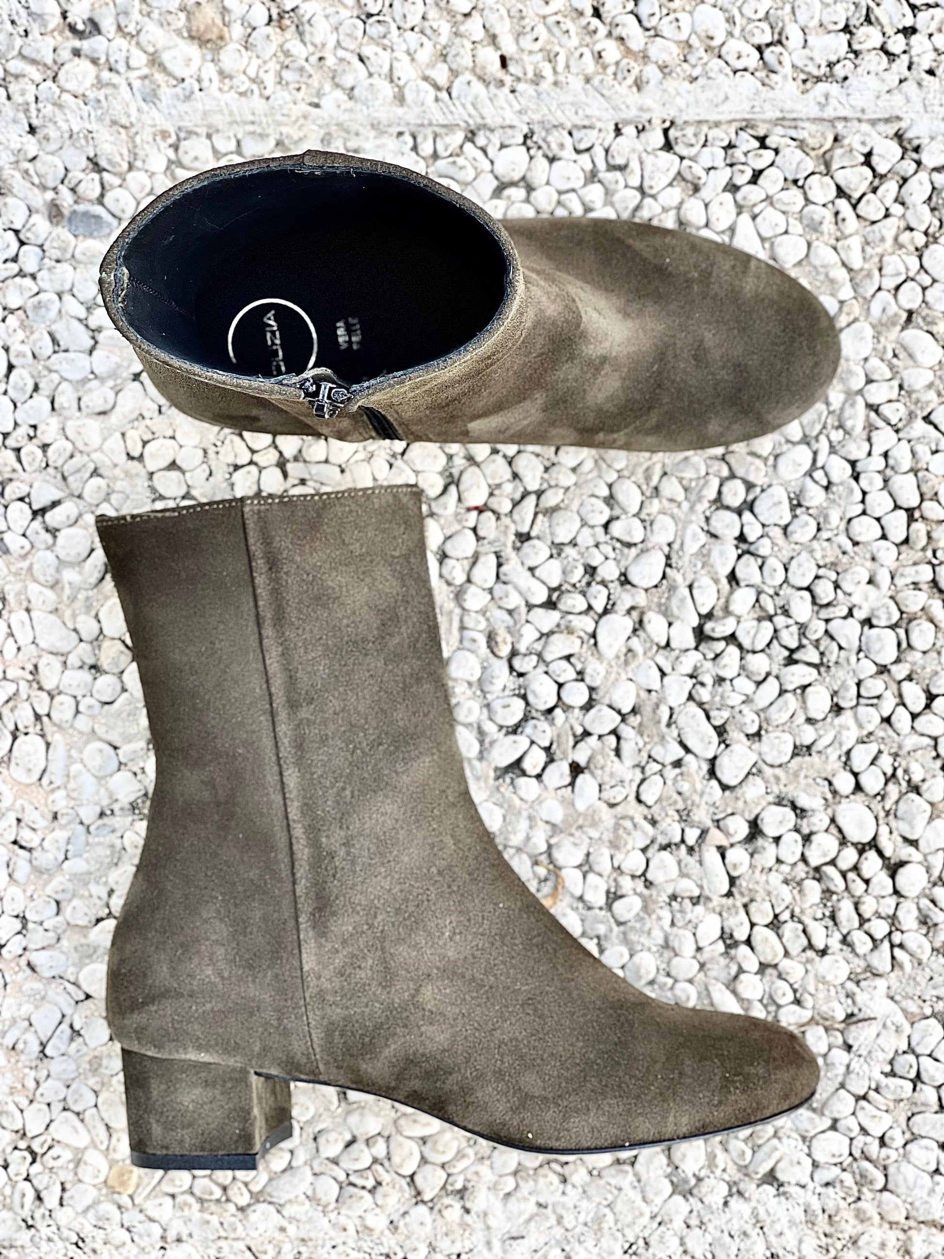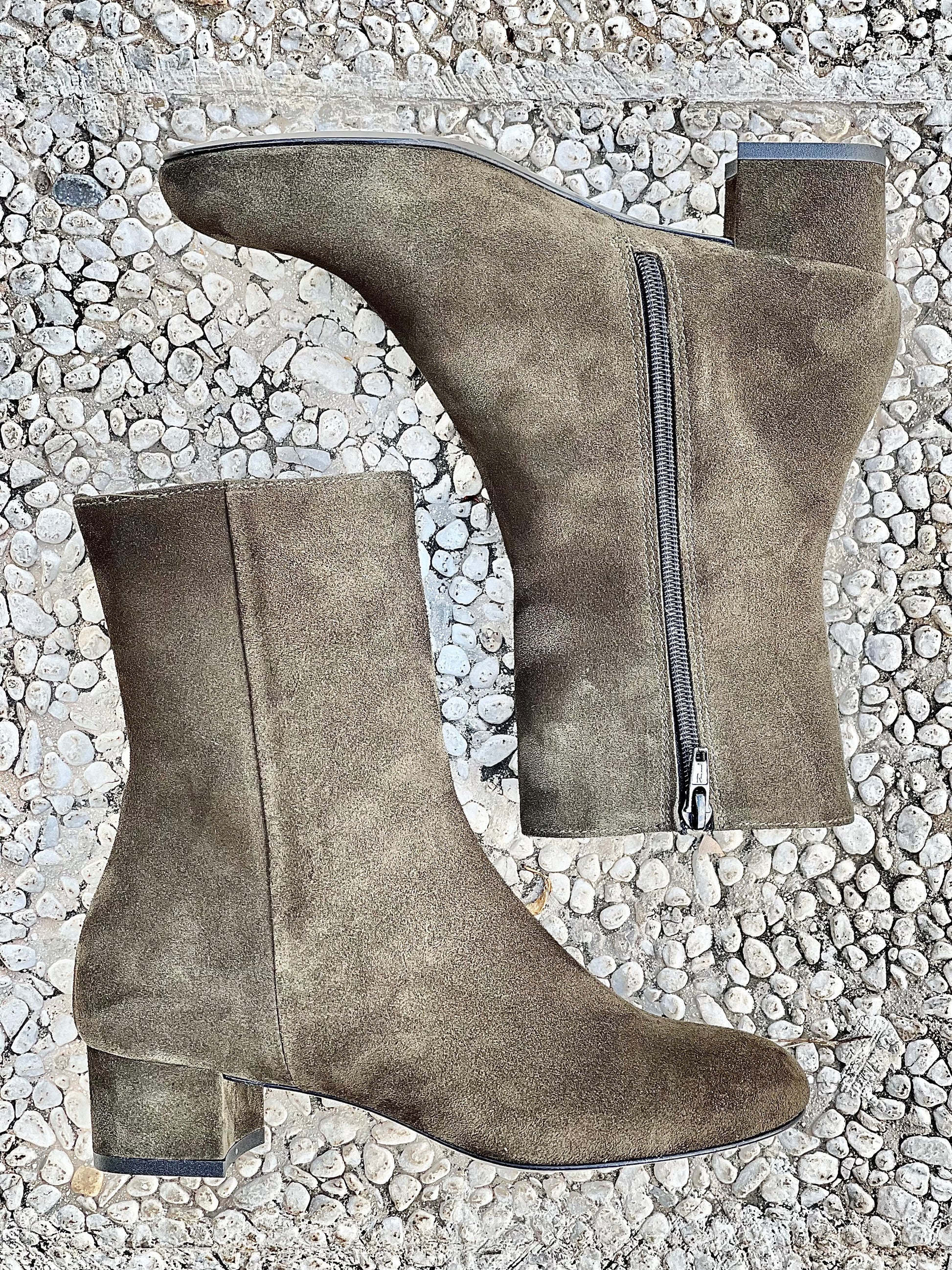 Zamszowe botki z okrągłym noskiem i 4 cm szerokim obcasem.