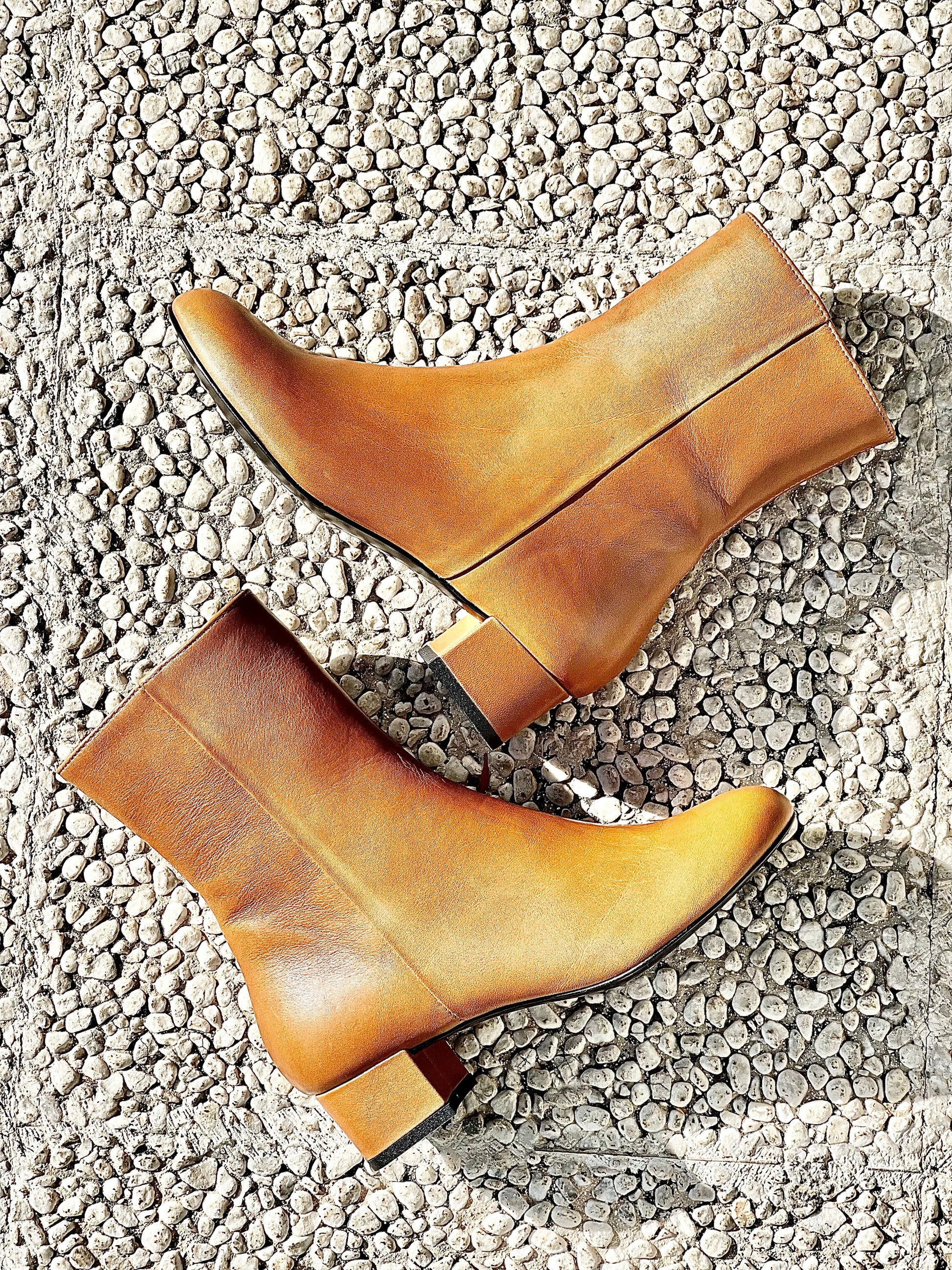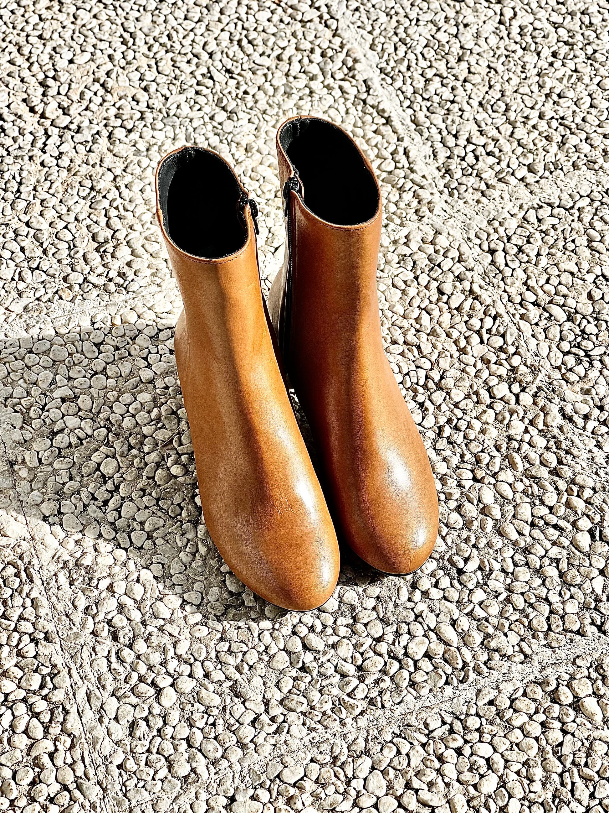 Skórzane botki z okrągłym noskiem i szerokim obcasem 4 cm.