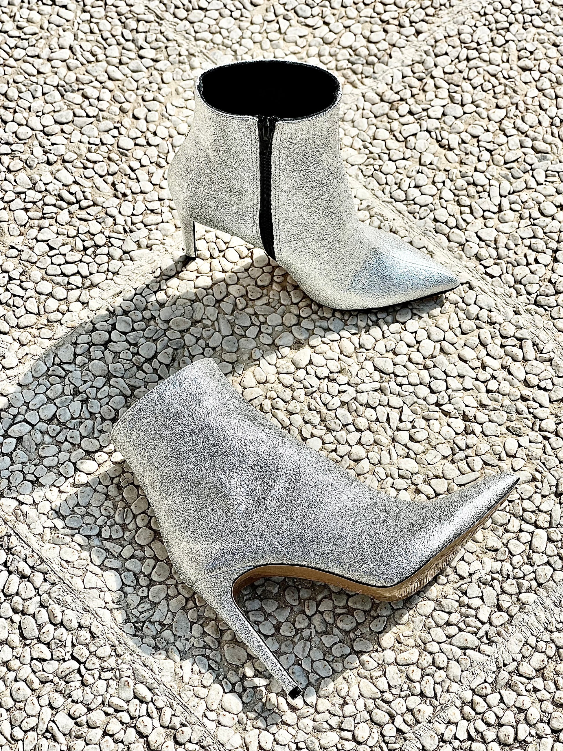 Szpiczaste botki na wysokim obcasie z laminatu.