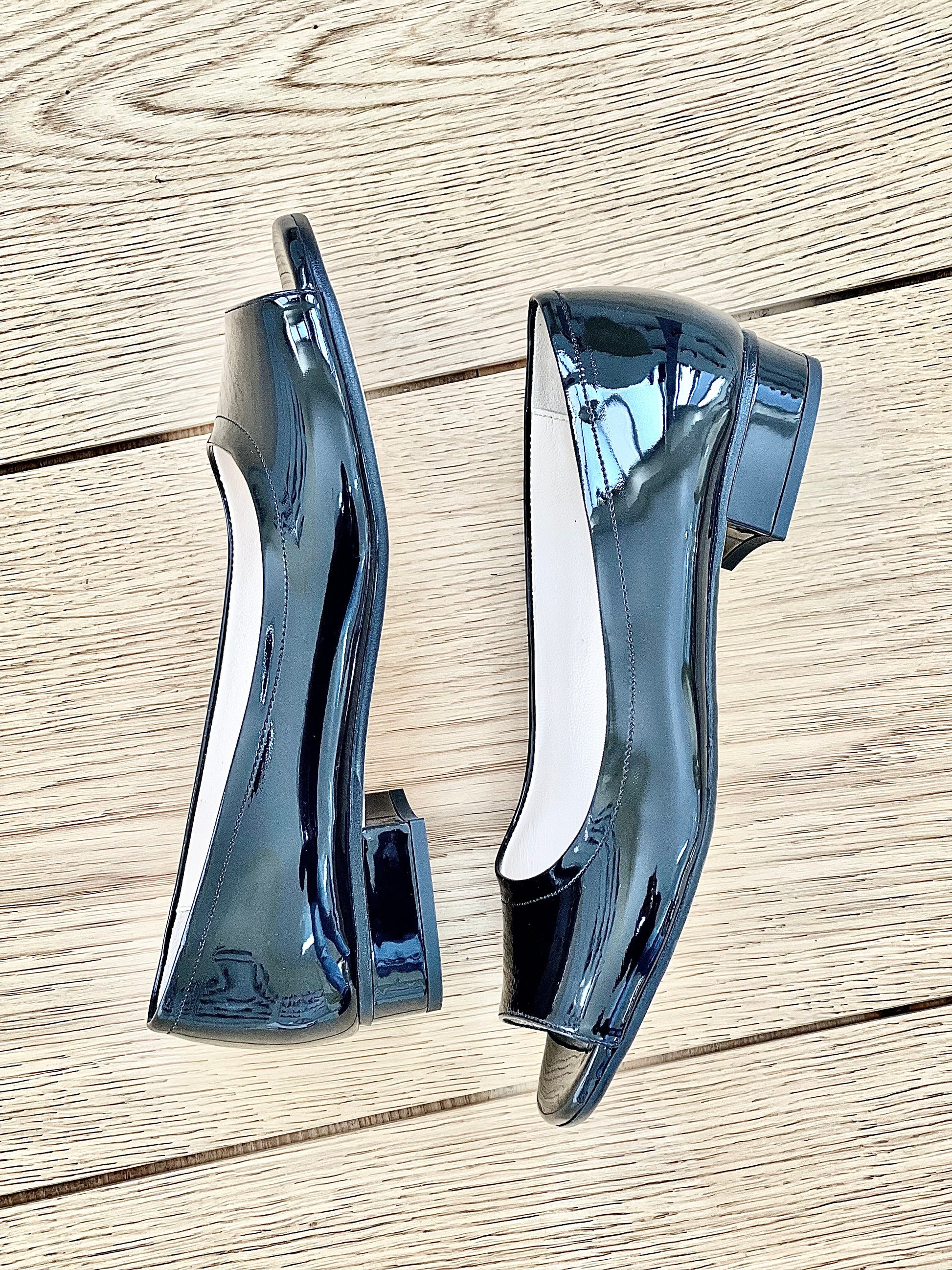 Niskie czółenka peep toe z lakierowanej skóry na obcasie o szerokości 2 cm.
