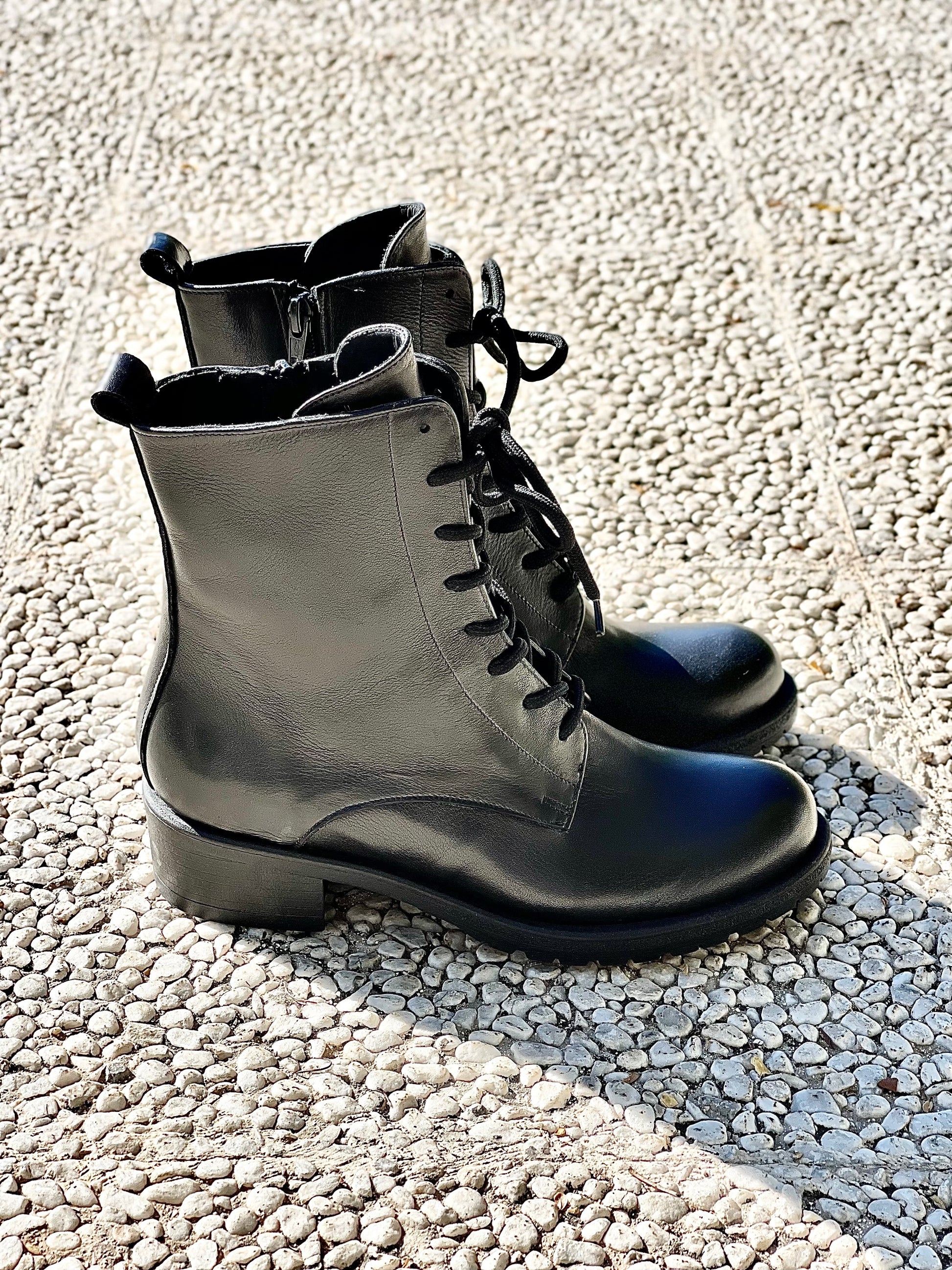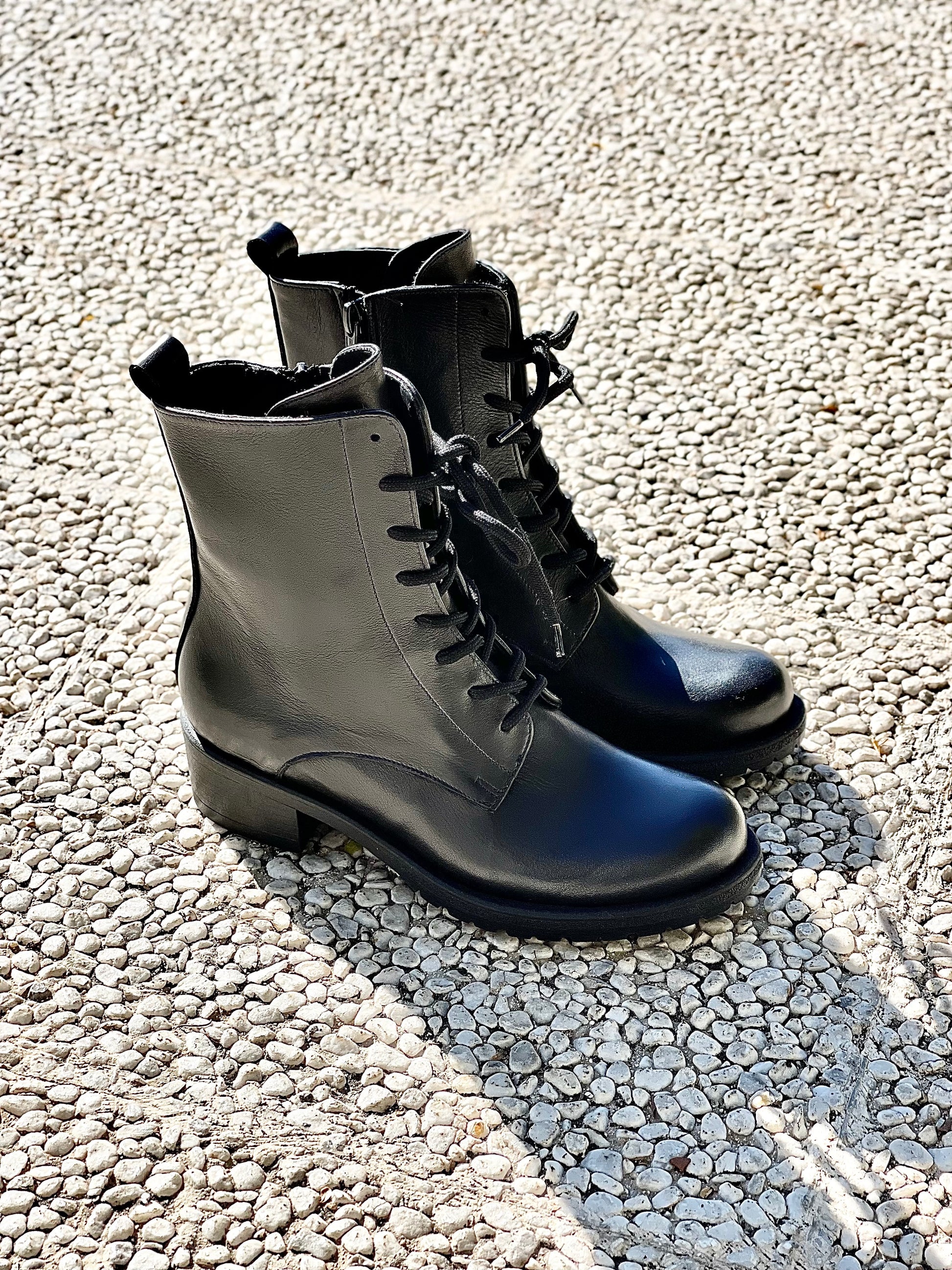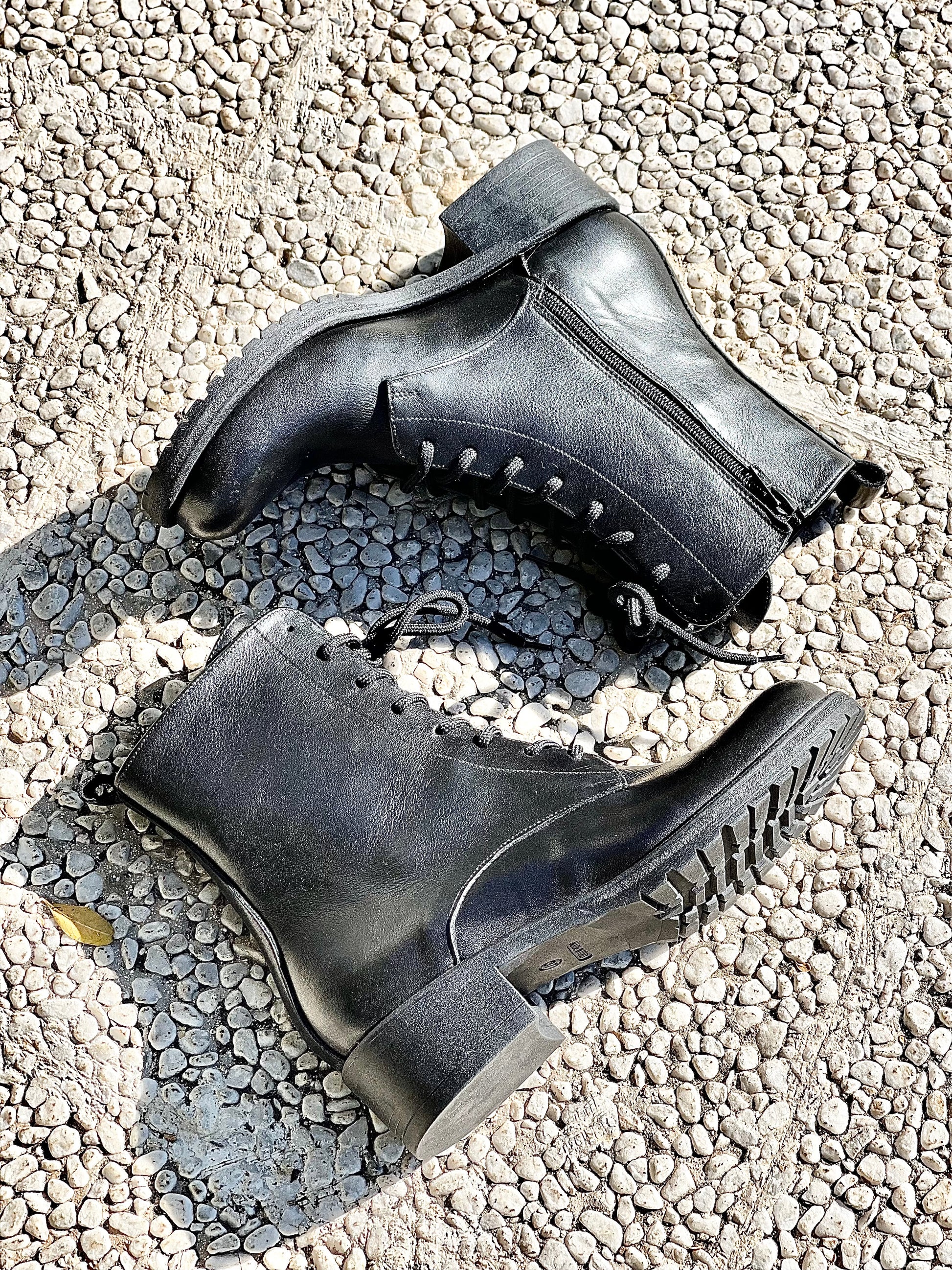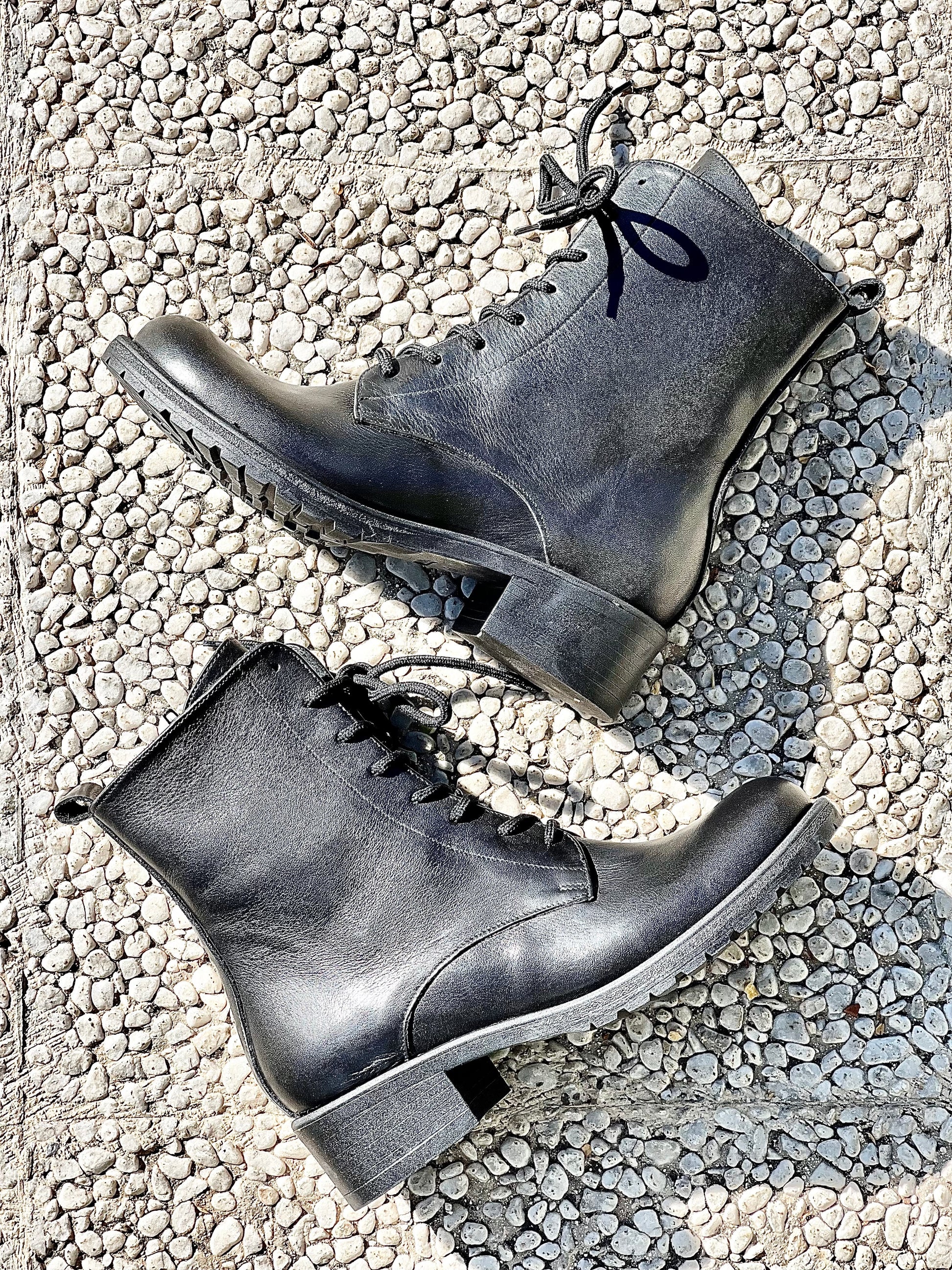 Skórzane buty amfibie na 3 cm obcasie.