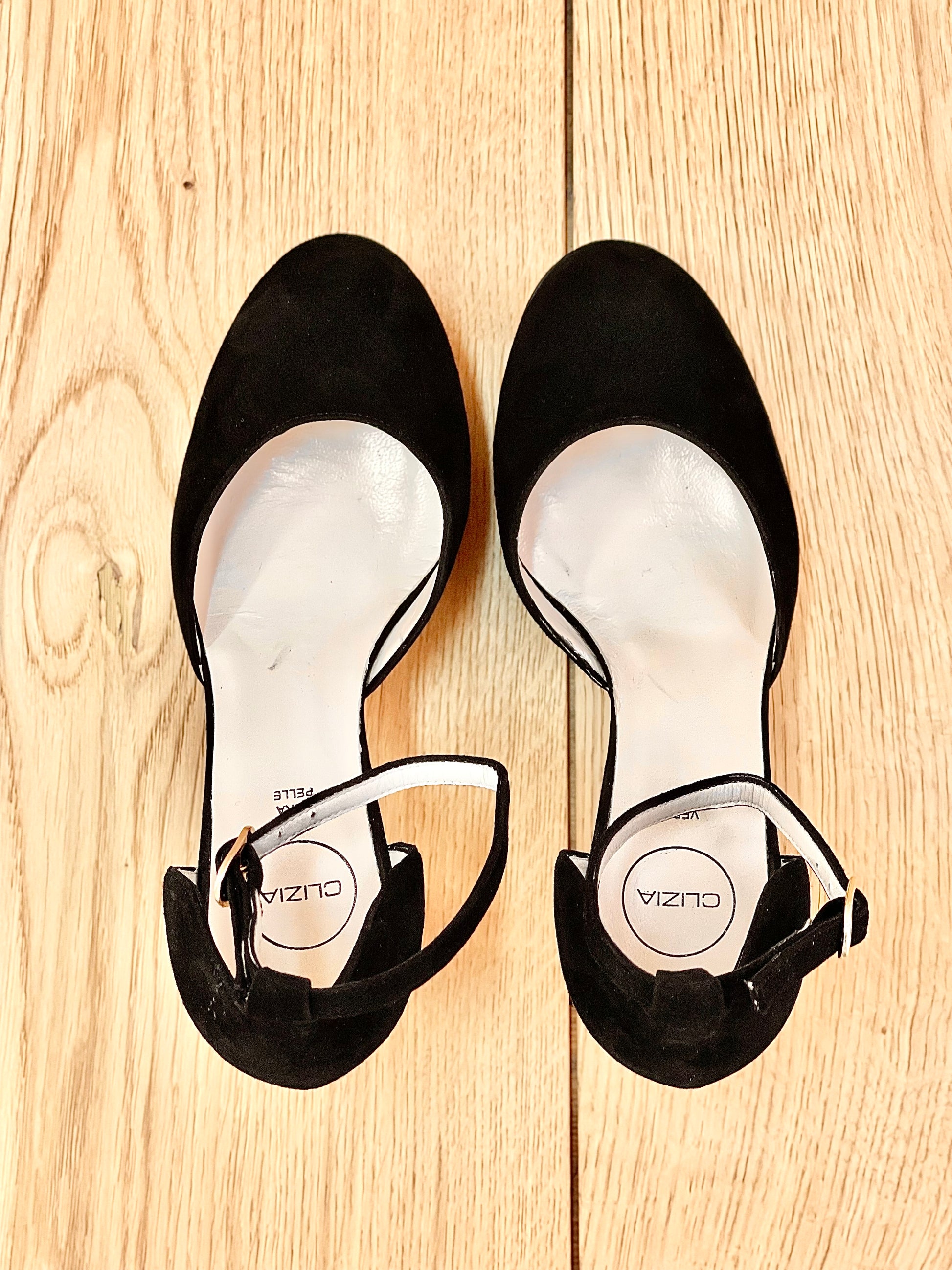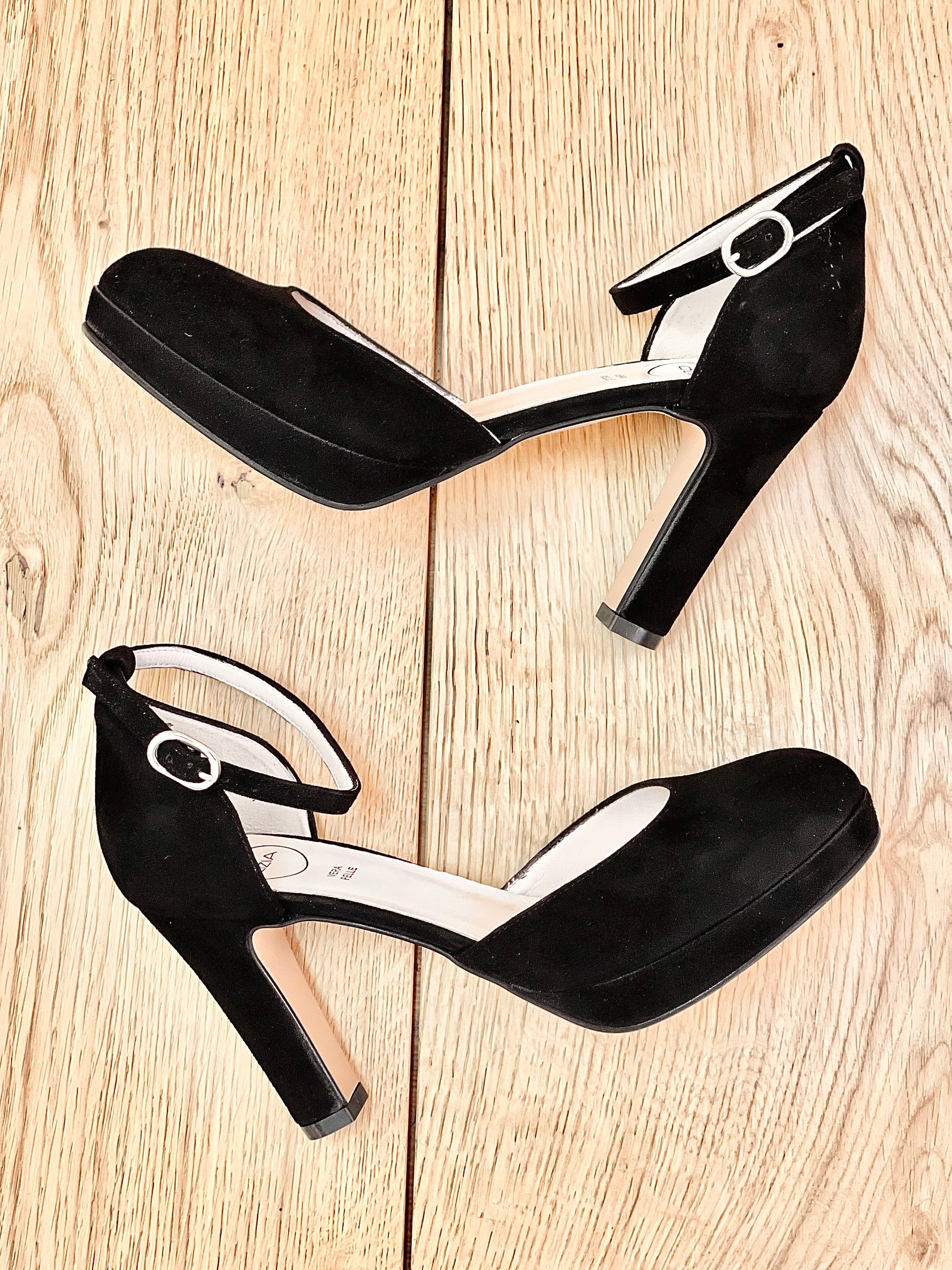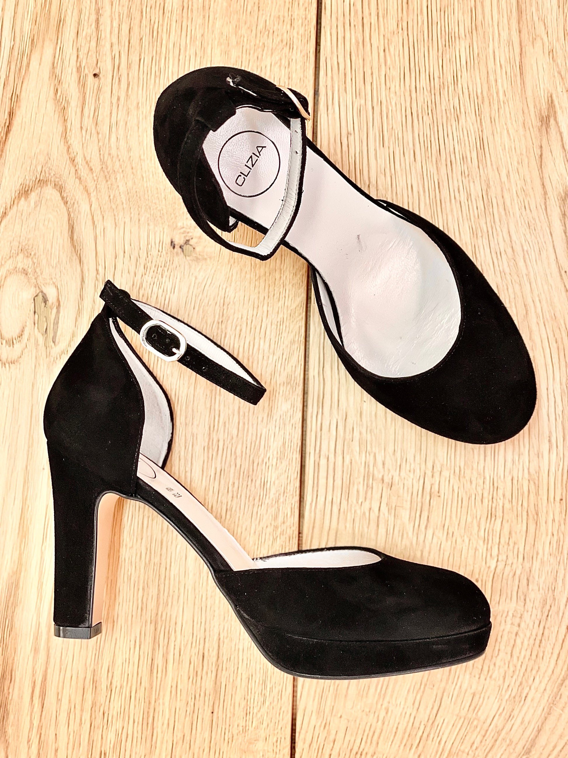 Zamszowy dekolt, okrągły nosek, obcas 9 cm i platforma 1 cm.