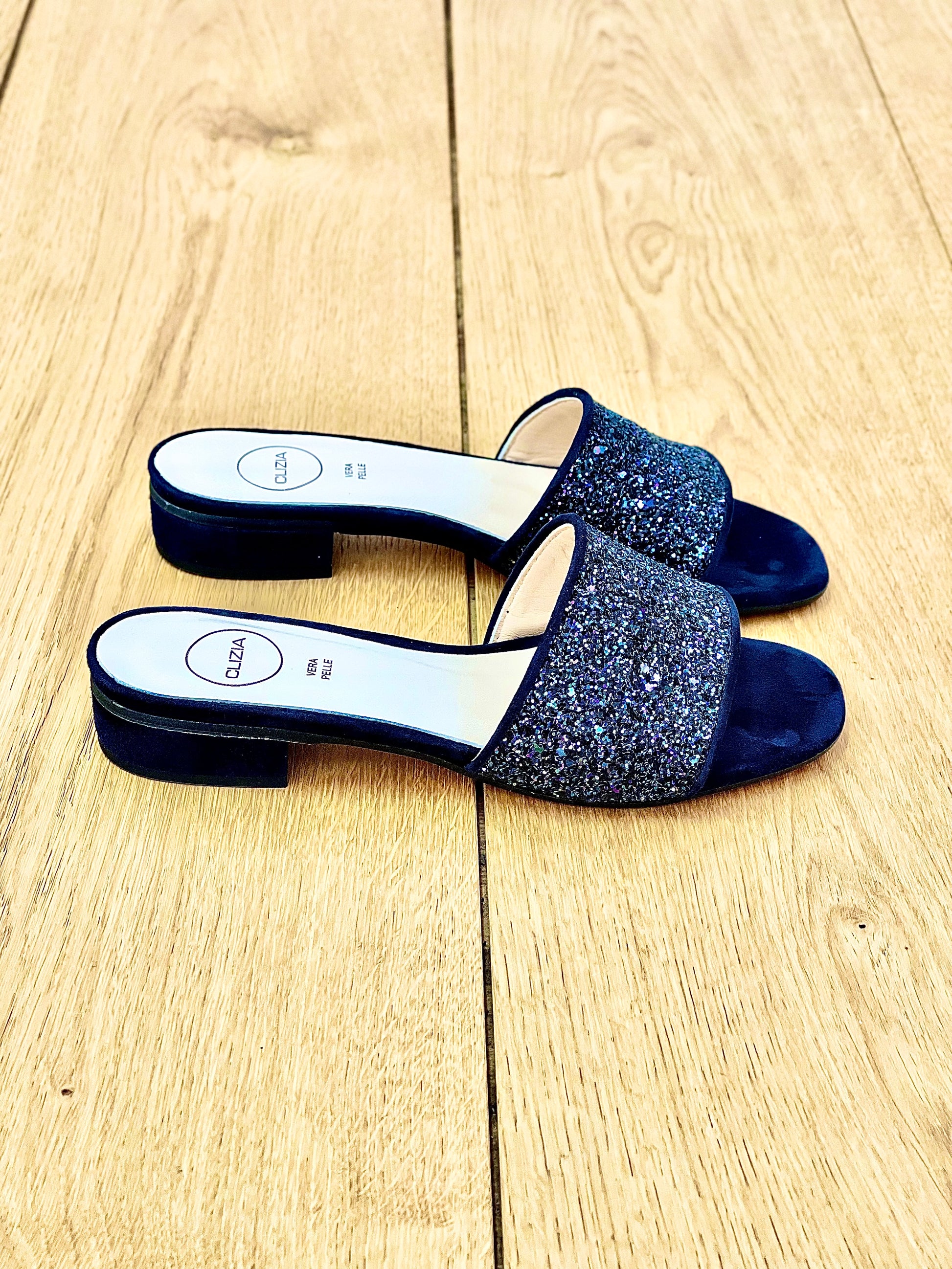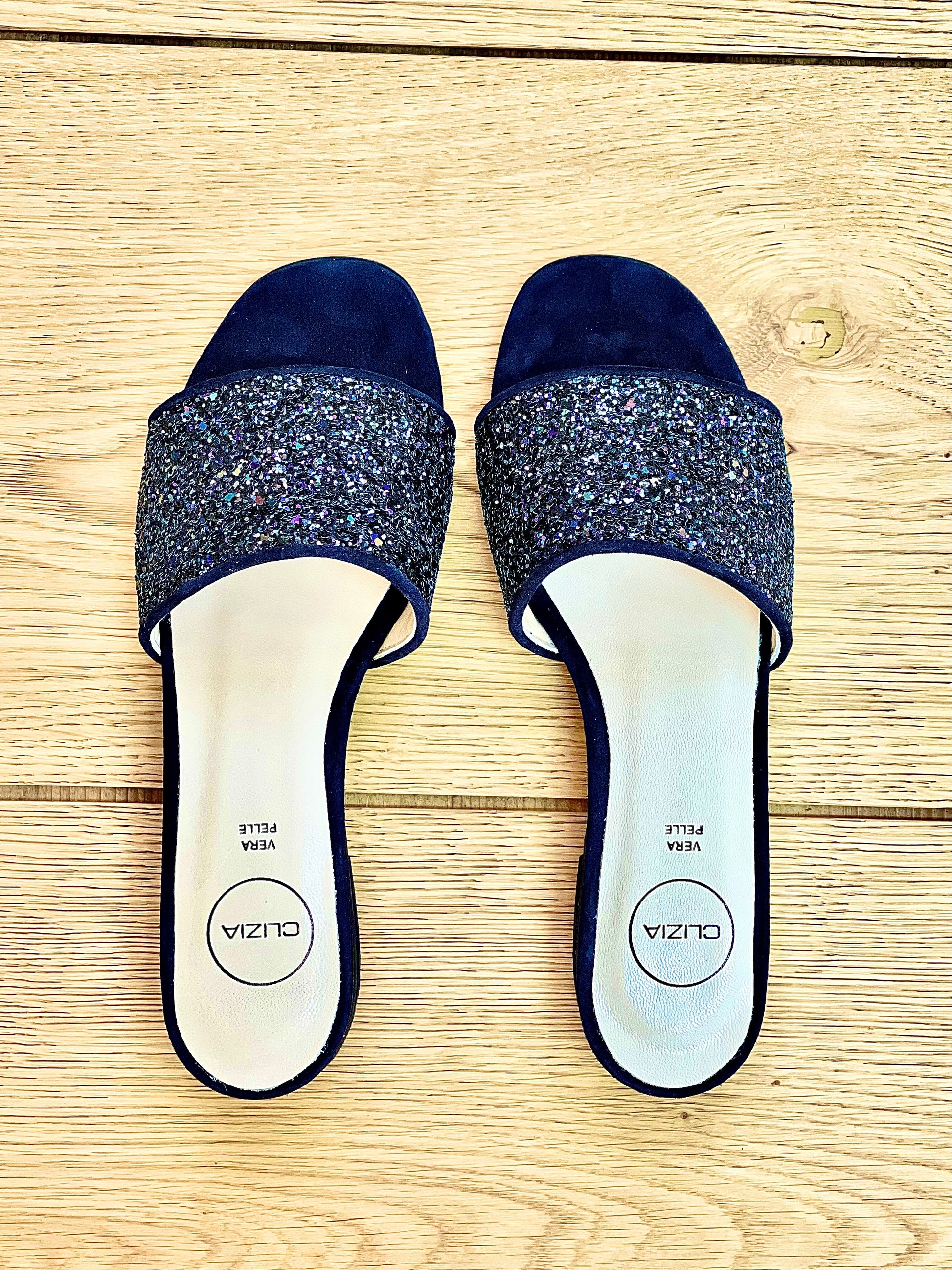 Niskie sandały mules z zamszu i brokatowym obcasem 2 cm.