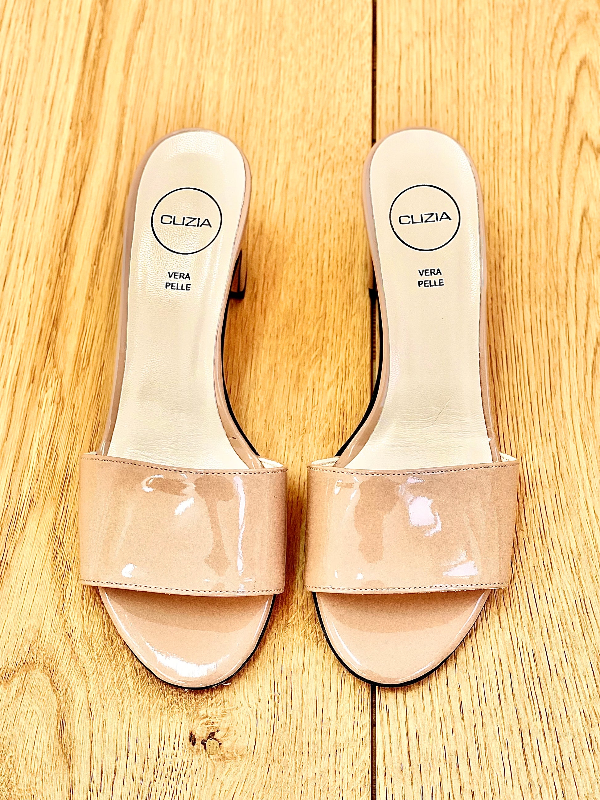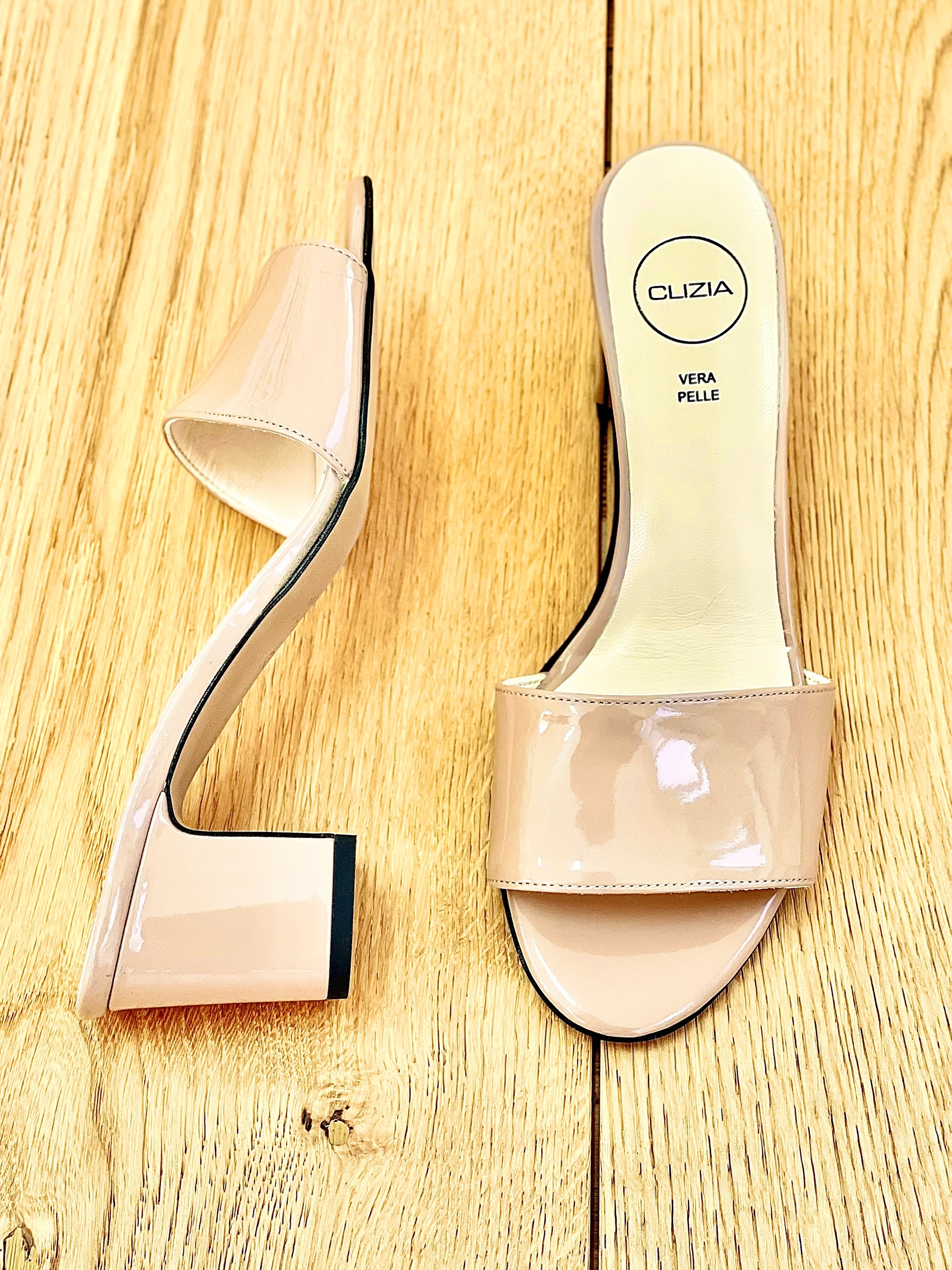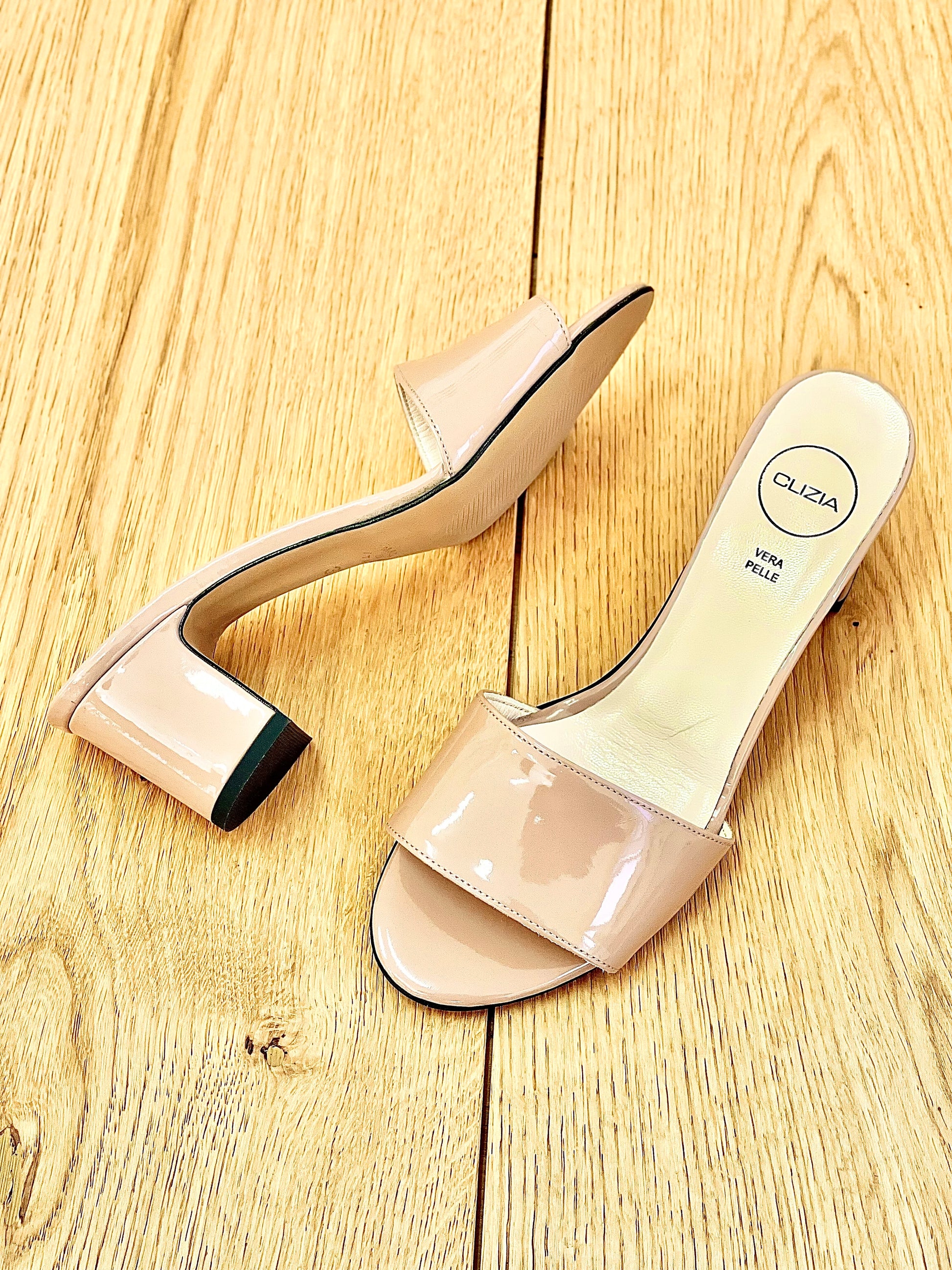 Niskie sandały z lakierowanej skóry na szerokim obcasie.