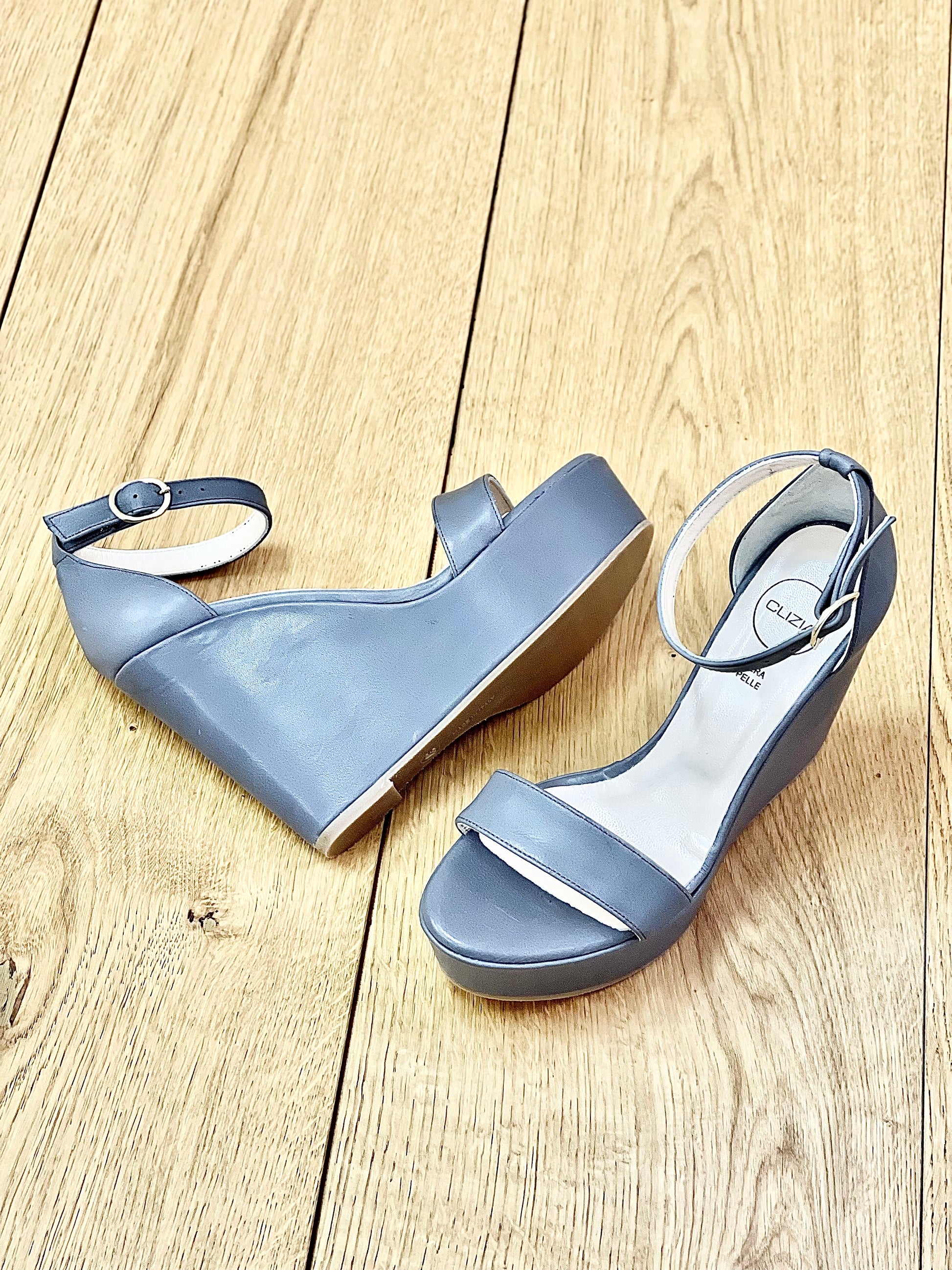 Wysokie skórzane sandały z paskiem i obcasem z 11-centymetrowym klinem.