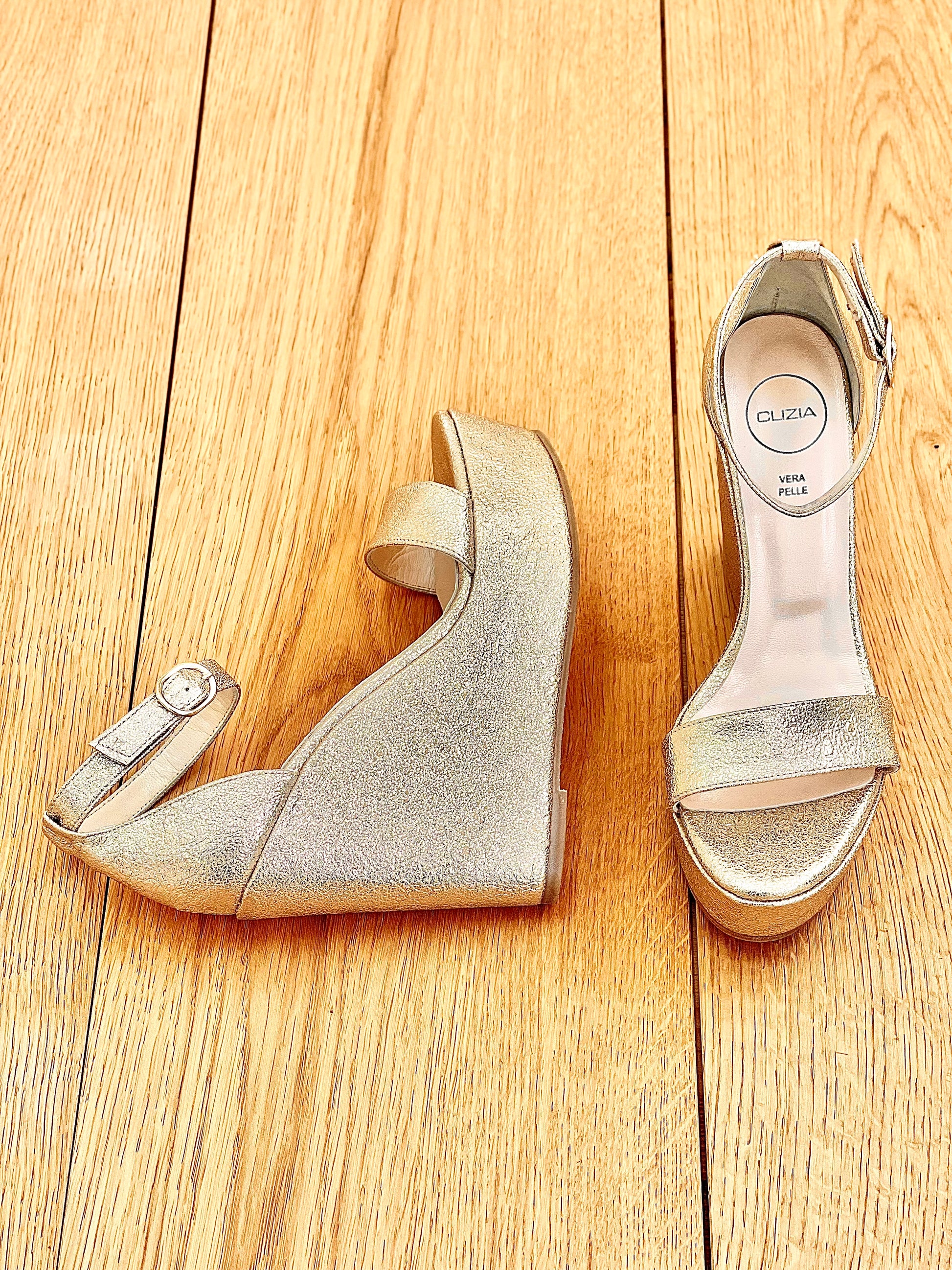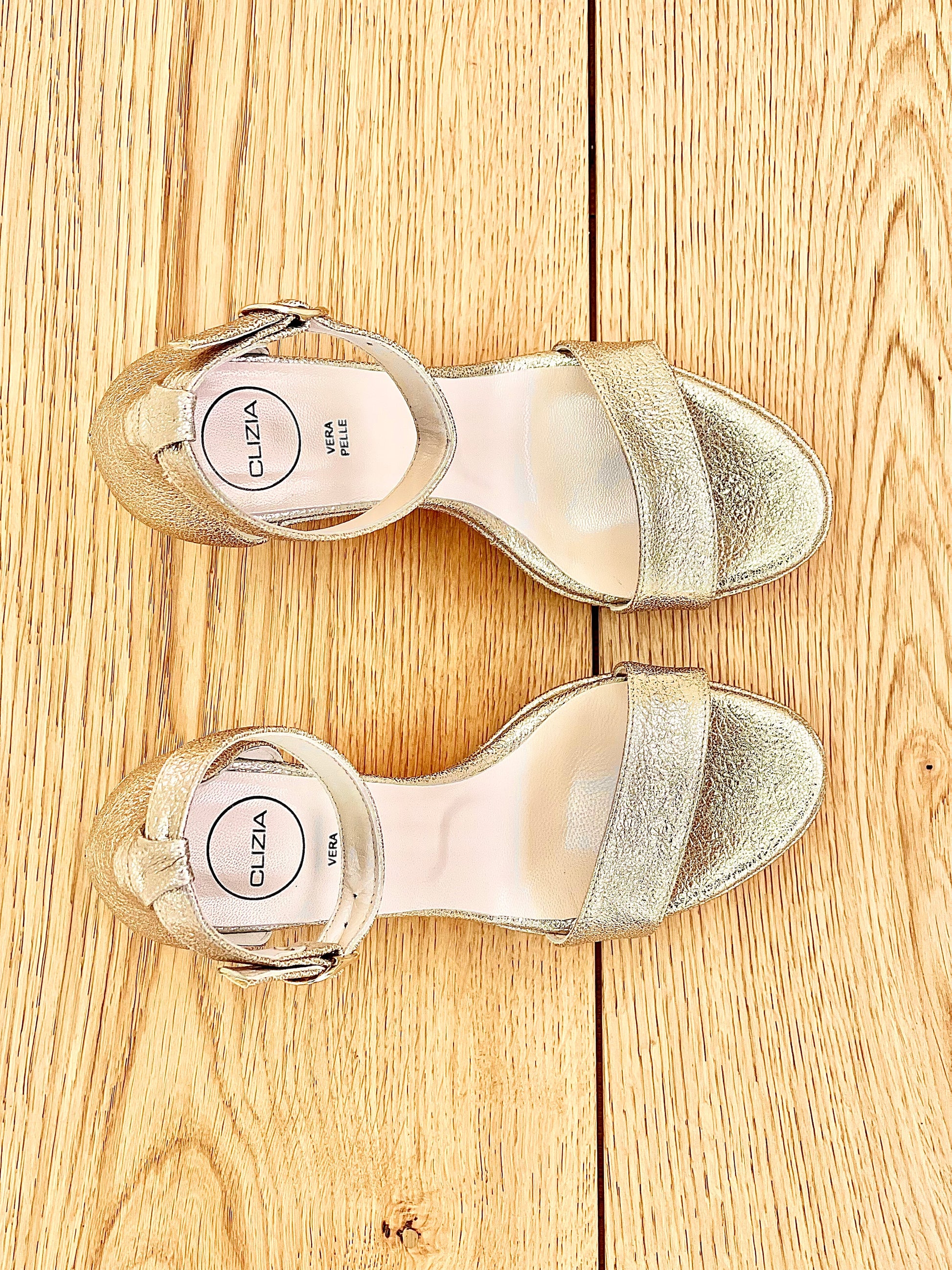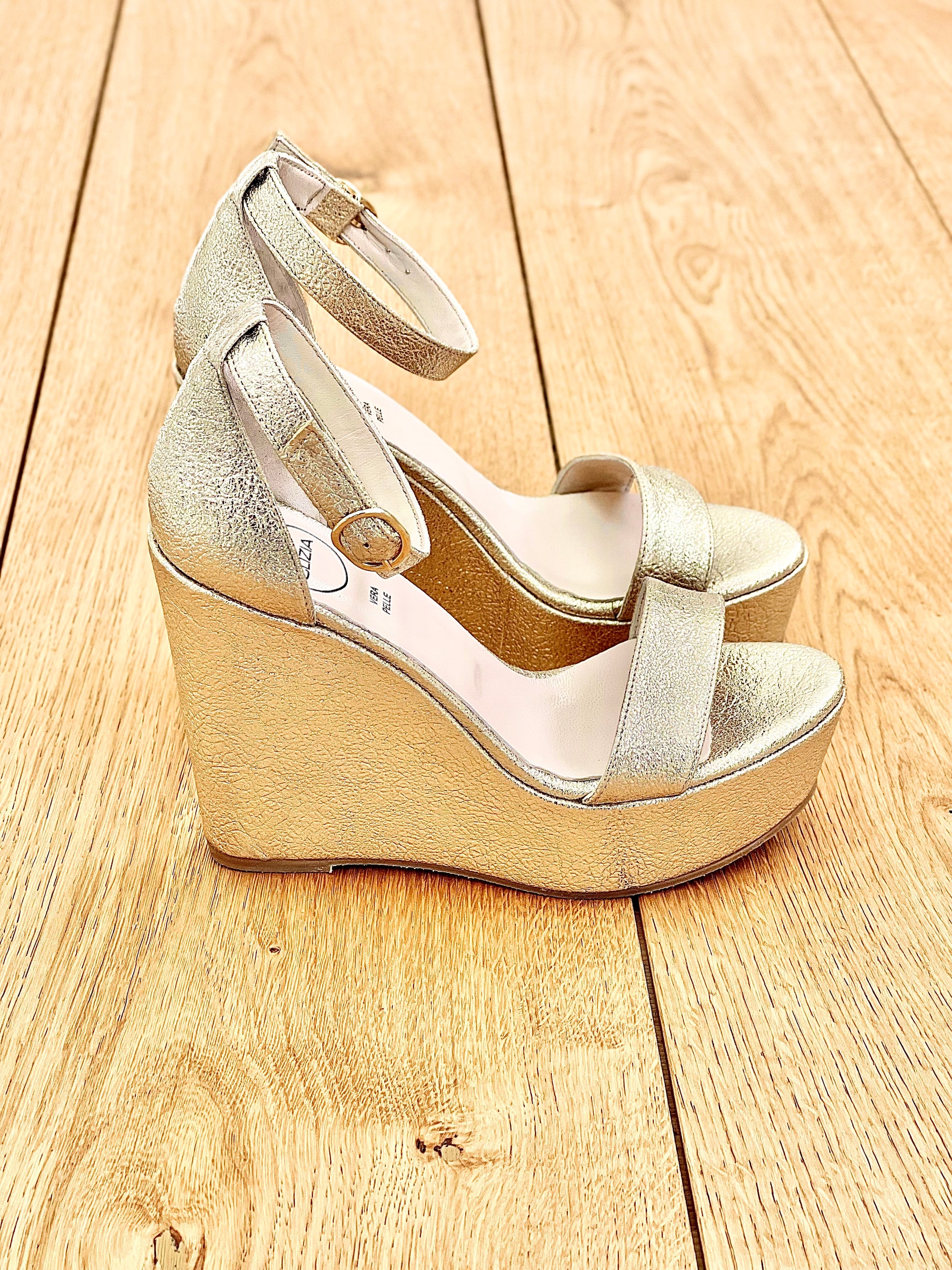 Laminowane sandały z wysokim paskiem i obcasem z 11-centymetrowym klinem.