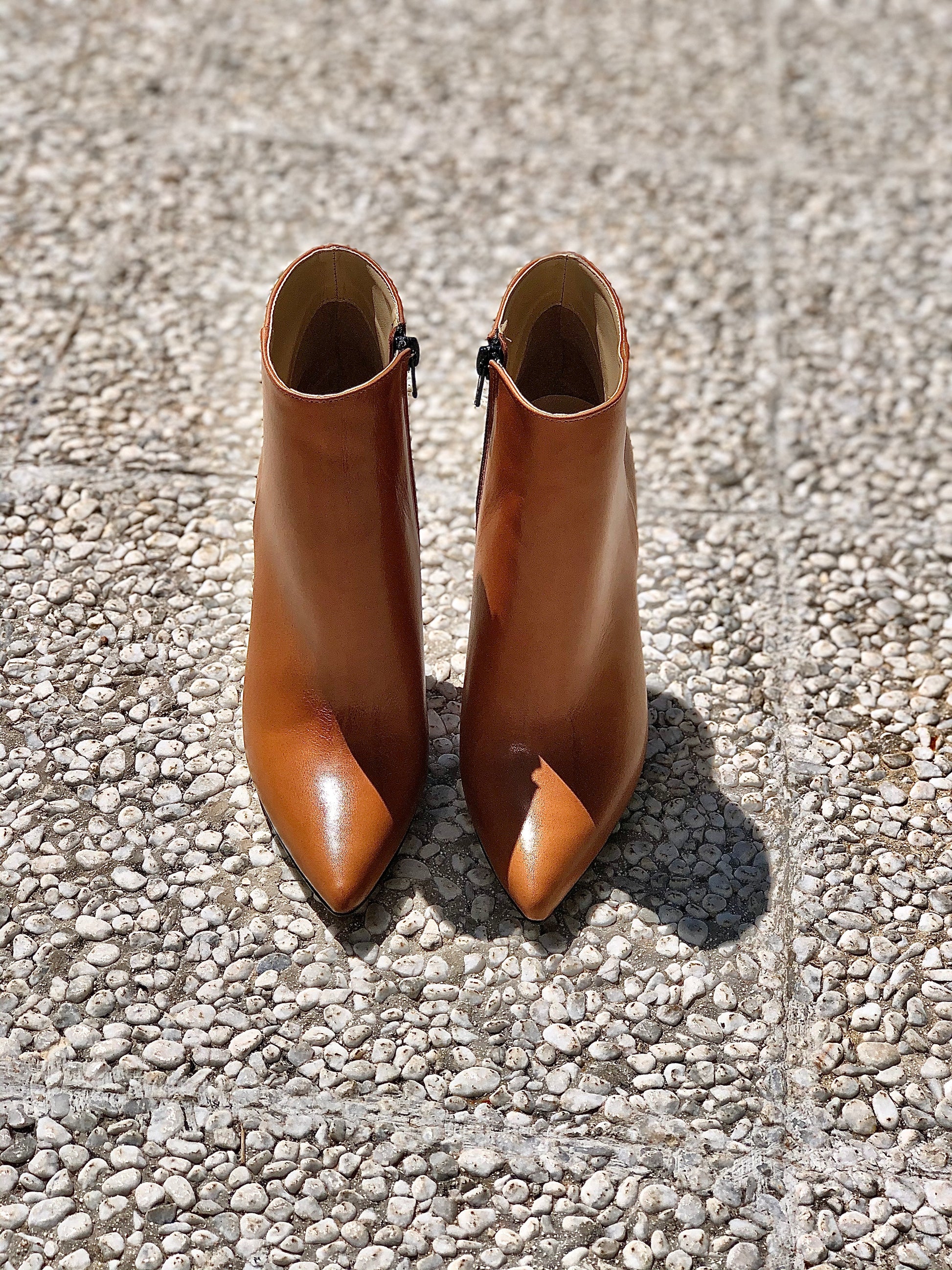 Skórzane buty za kostkę z odkrytymi palcami i 10-centymetrowym obcasem.