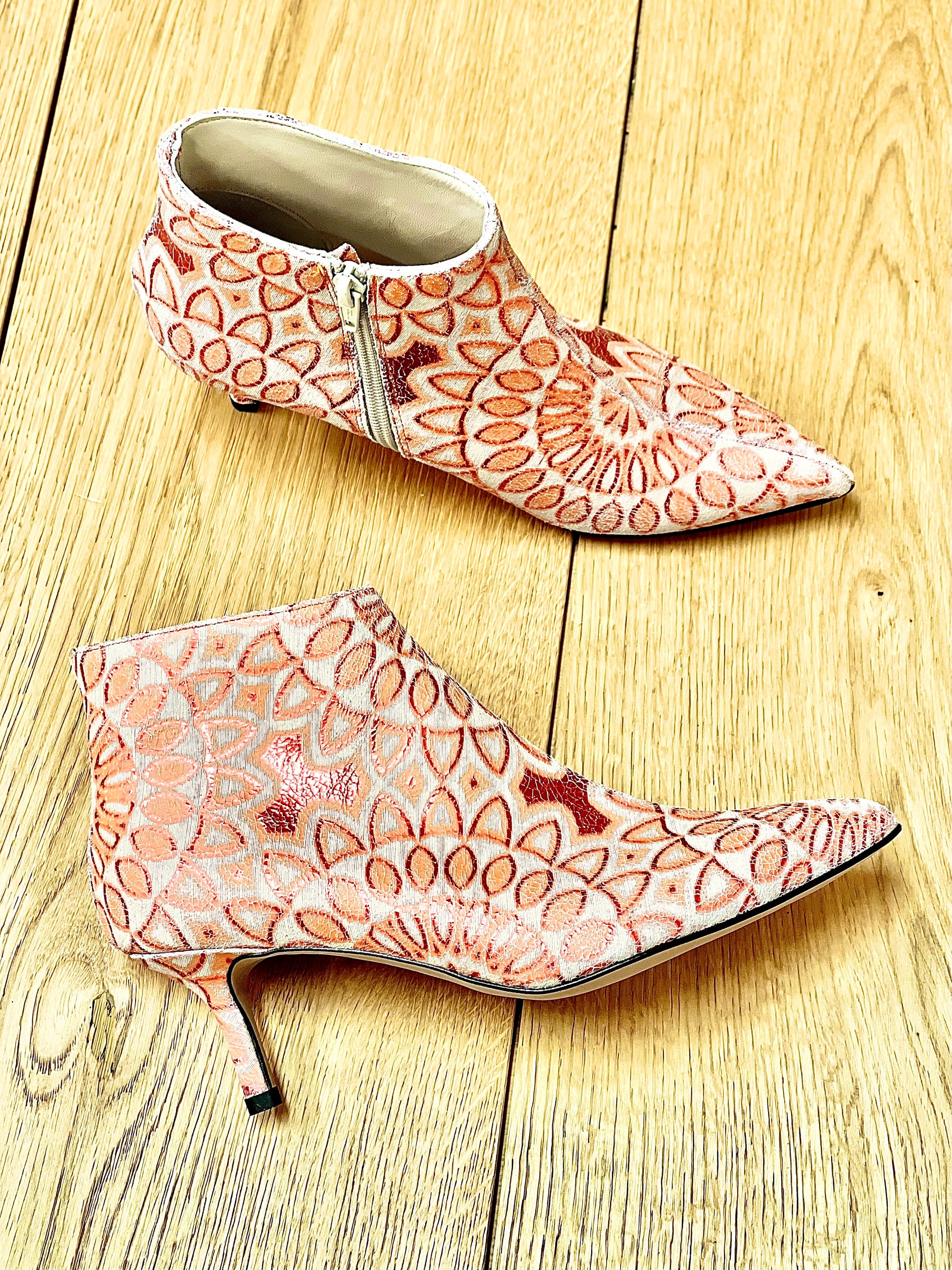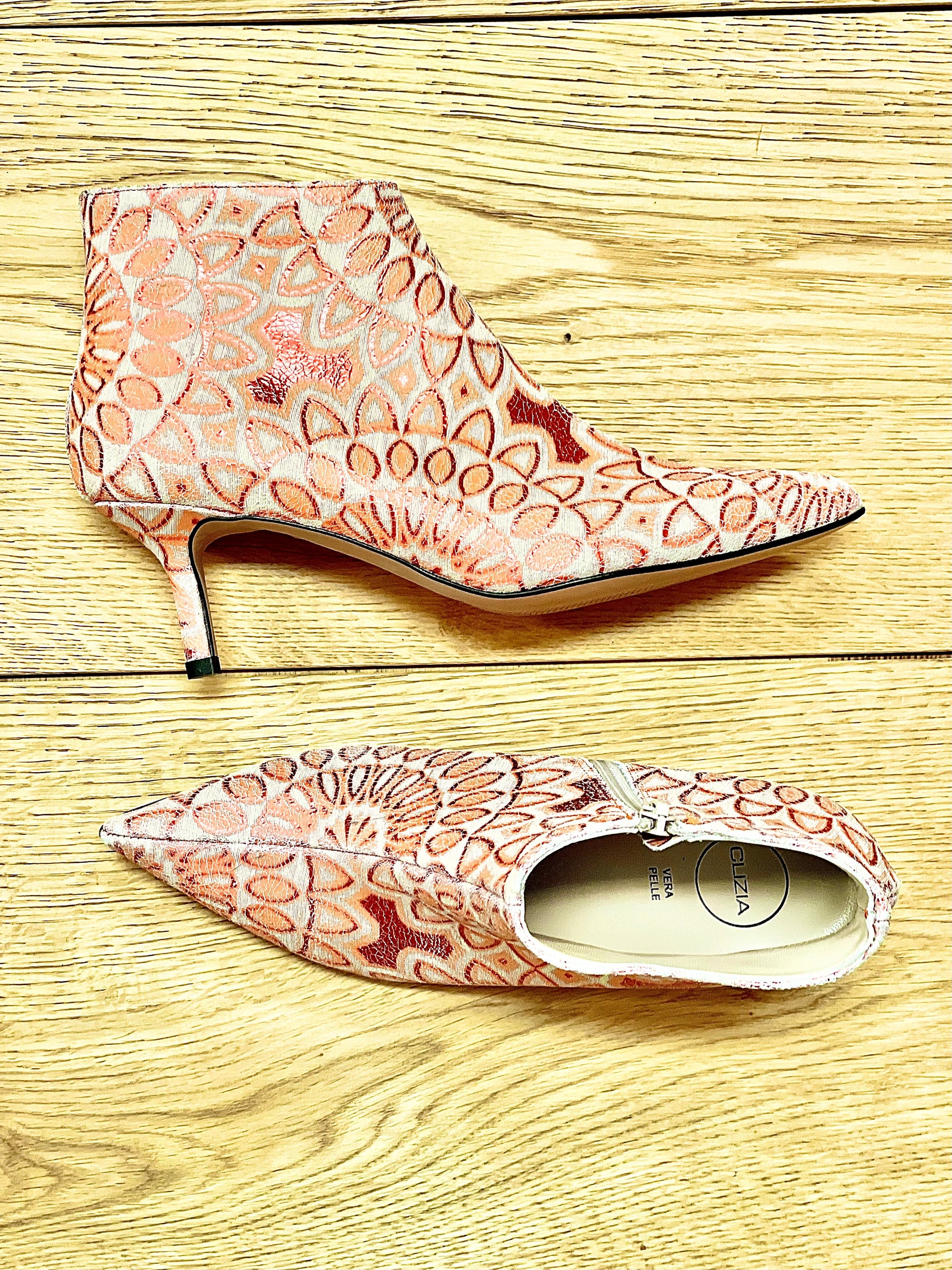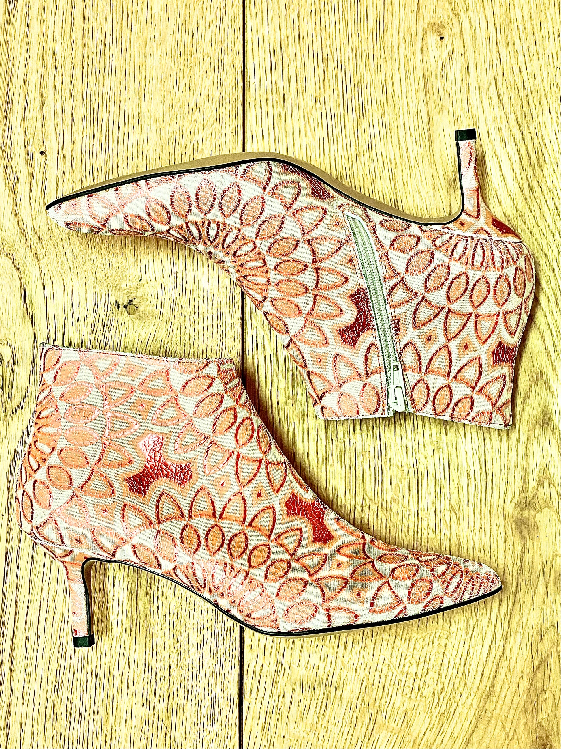 Botki z odkrytymi palcami z etnicznym motywem z trzeszczącej skóry, obcas 6 cm.