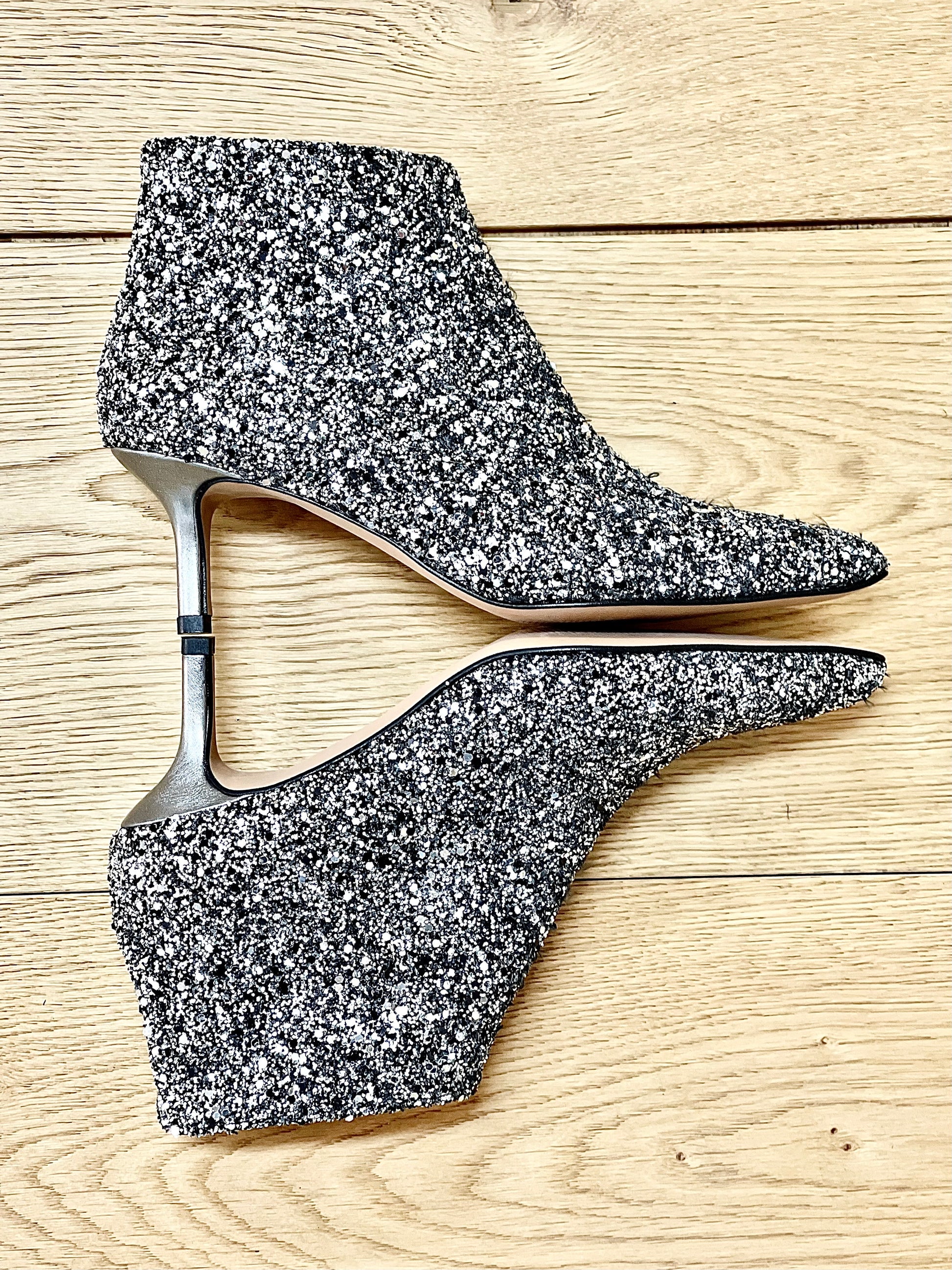 Brokatowe botki z czubkiem w szpic i 6-centymetrowym obcasem.