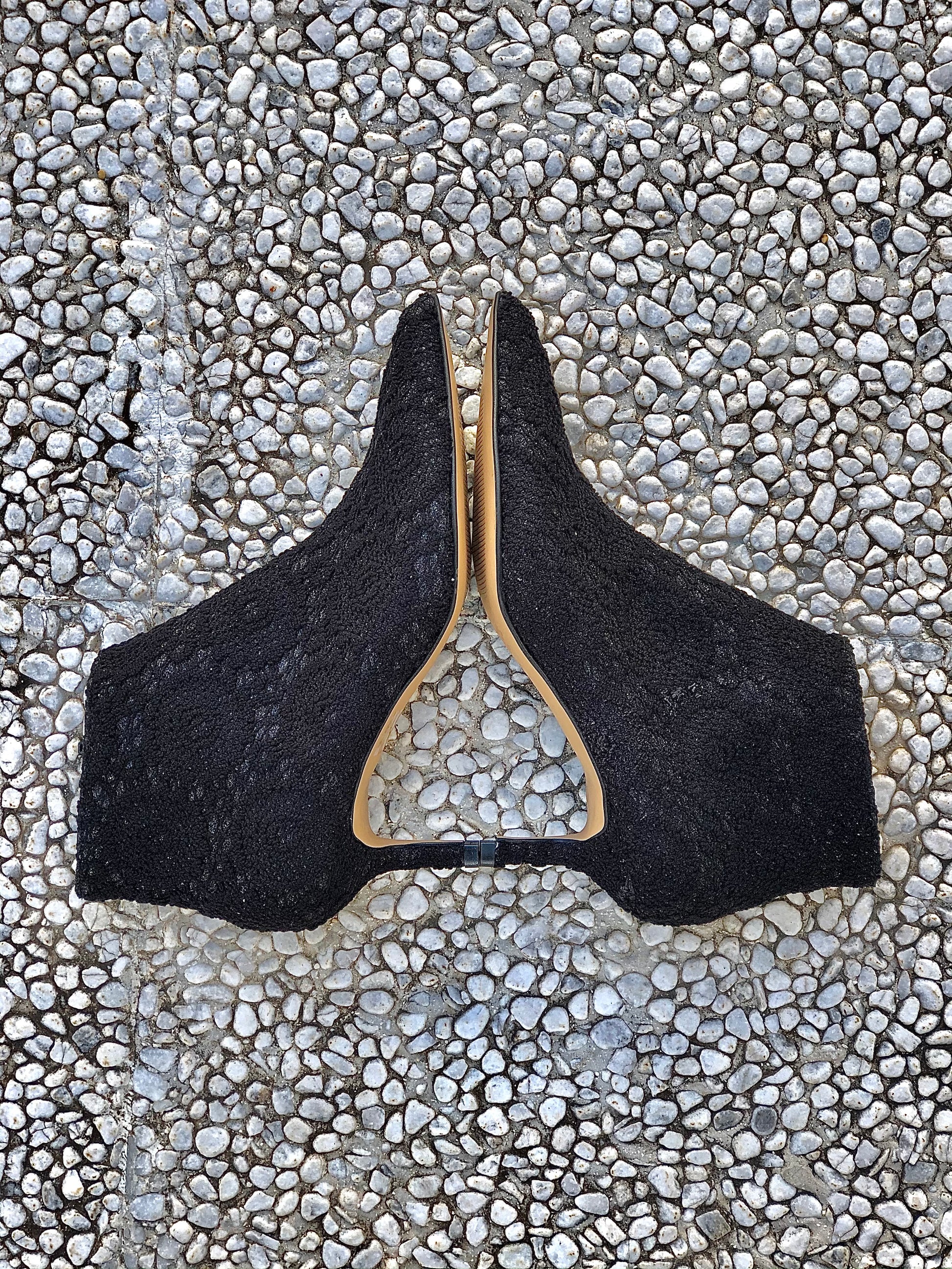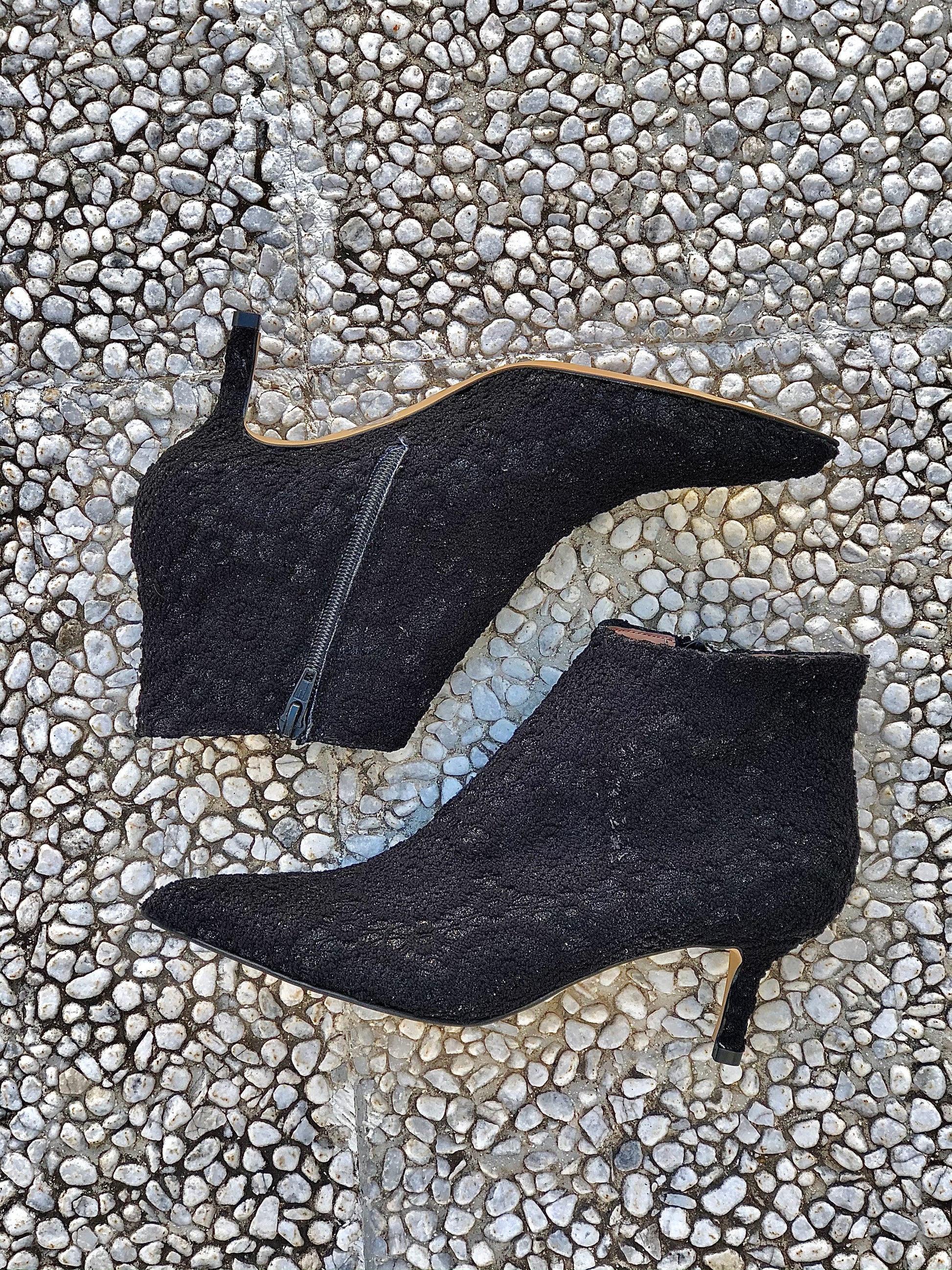 Pokryte makramą buty za kostkę z drobnym brokatem.