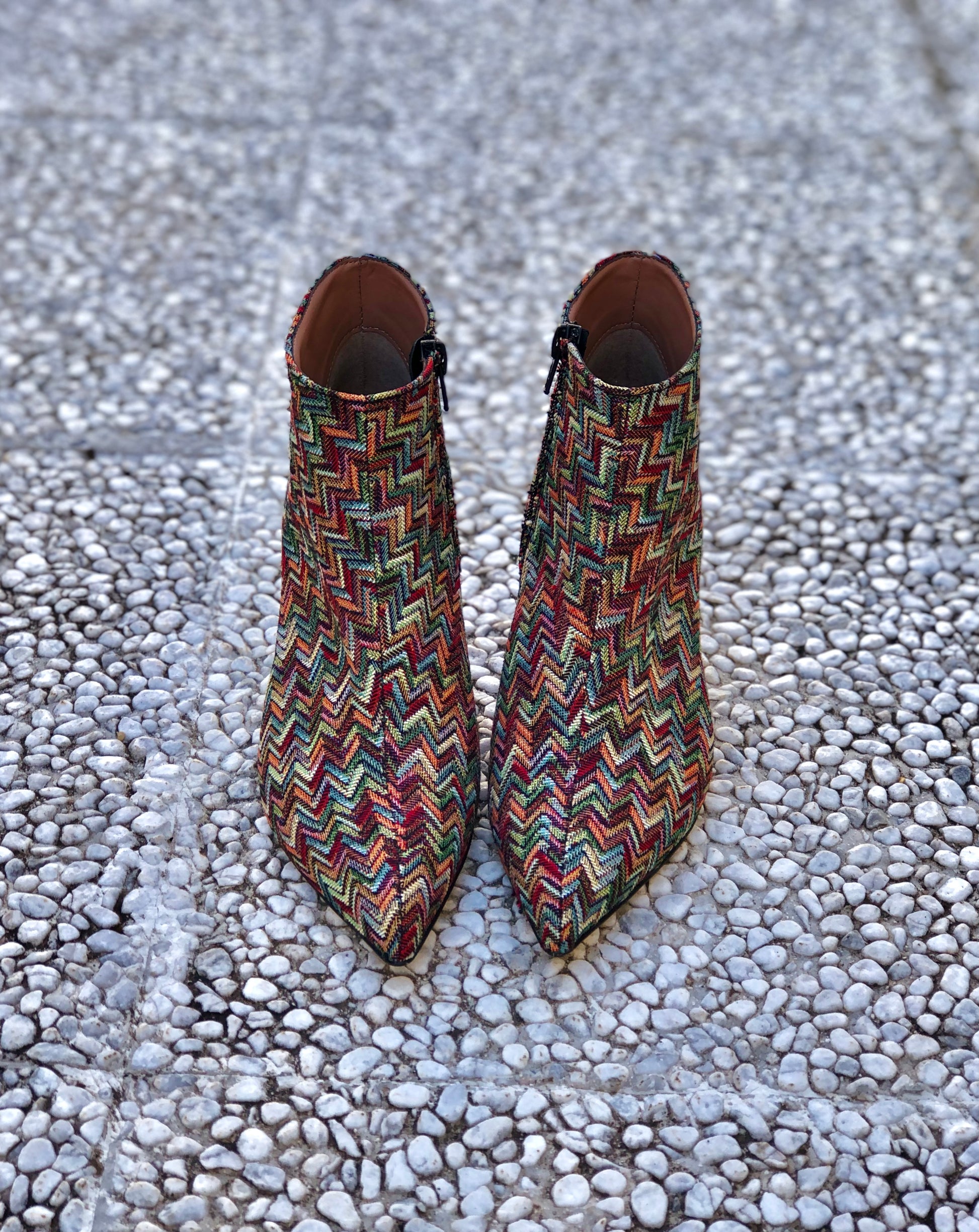 Buty za kostkę z odkrytymi palcami w żakardowy wzór zygzakowaty.