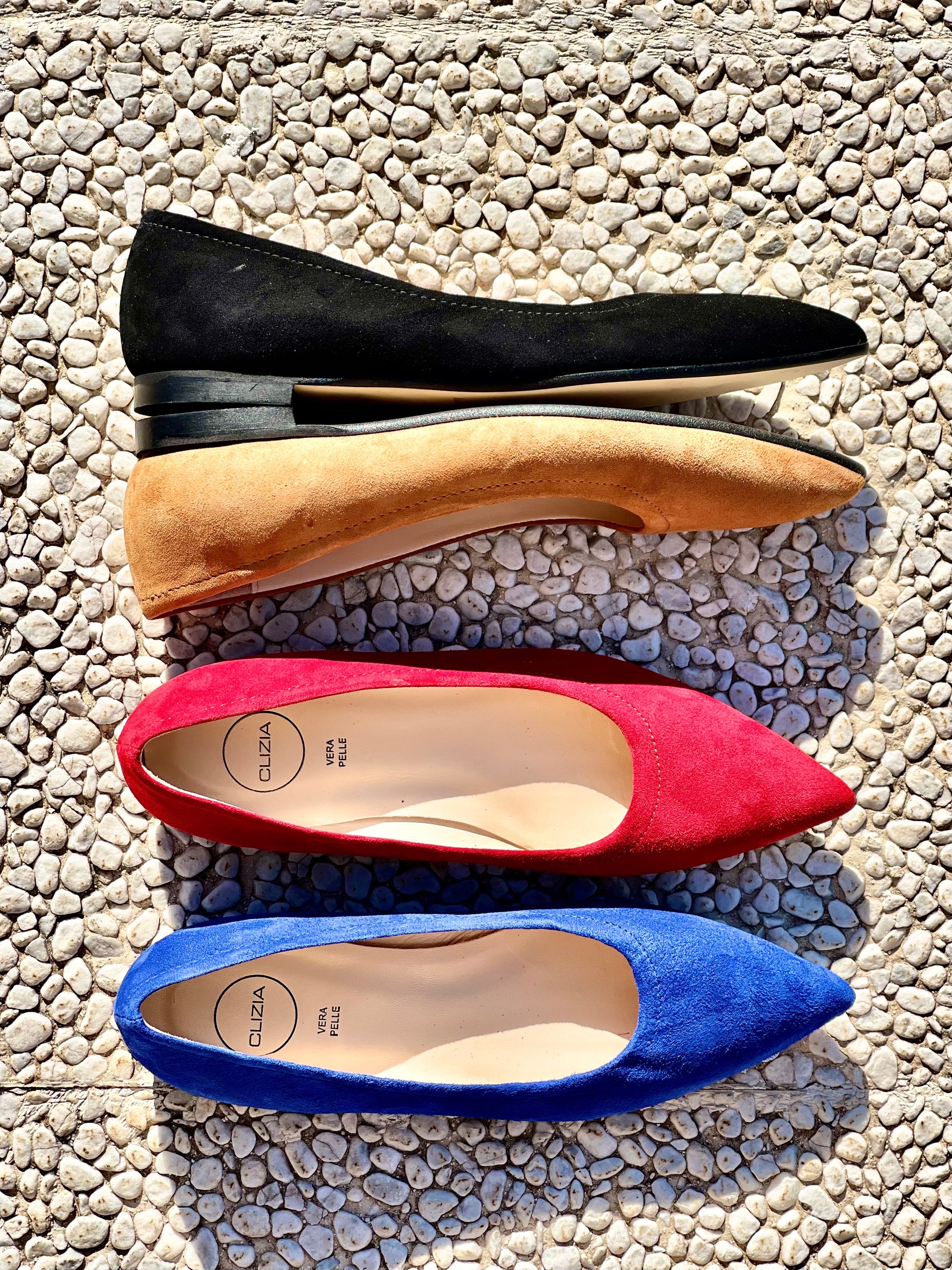 Baletki z odkrytymi palcami i zamszowym obcasem 1 cm.