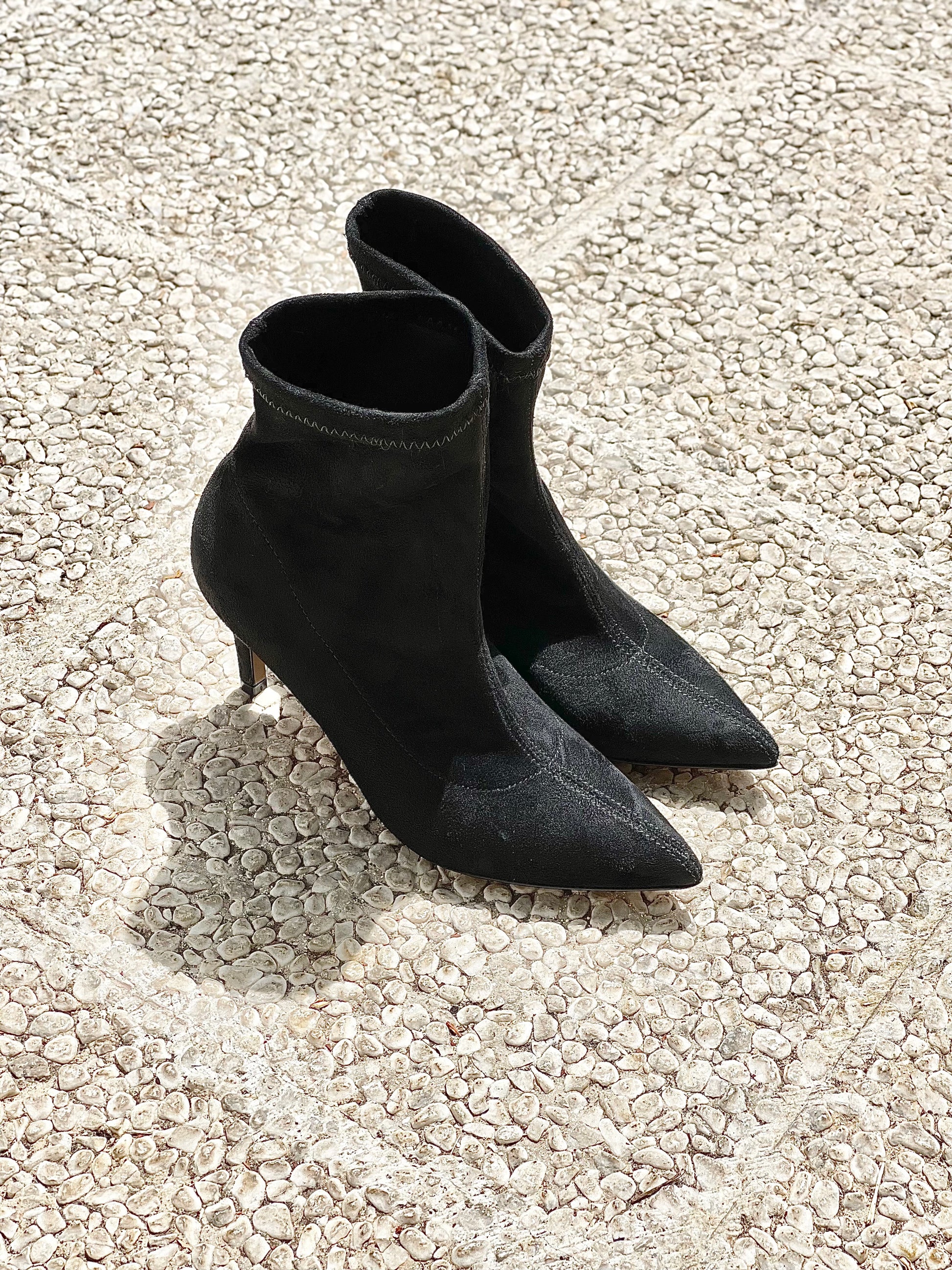 Elastyczne buty za kostkę z 75-milimetrowym obcasem.