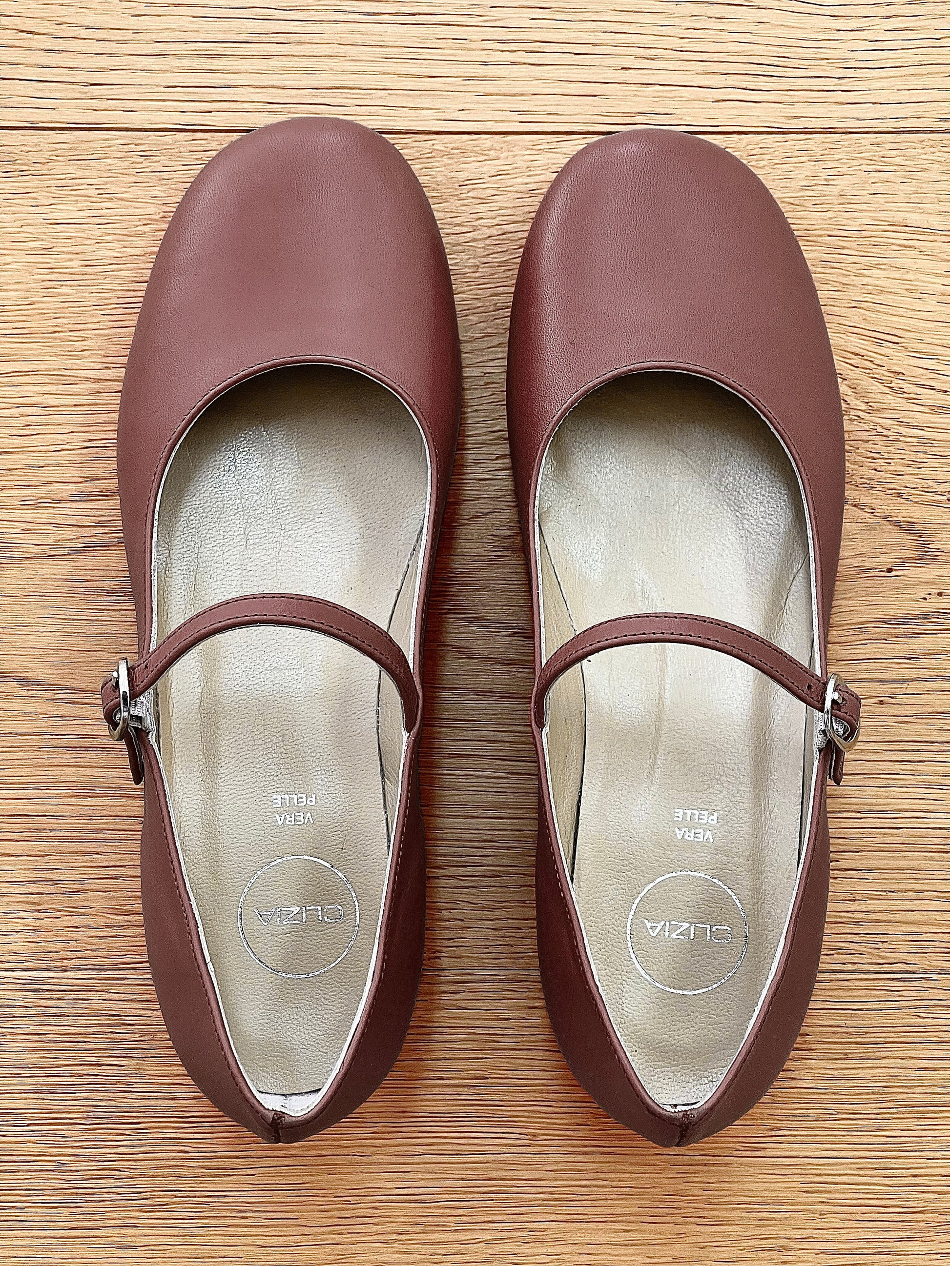 Niskie czółenka Mary Jane z półokrągłym noskiem.