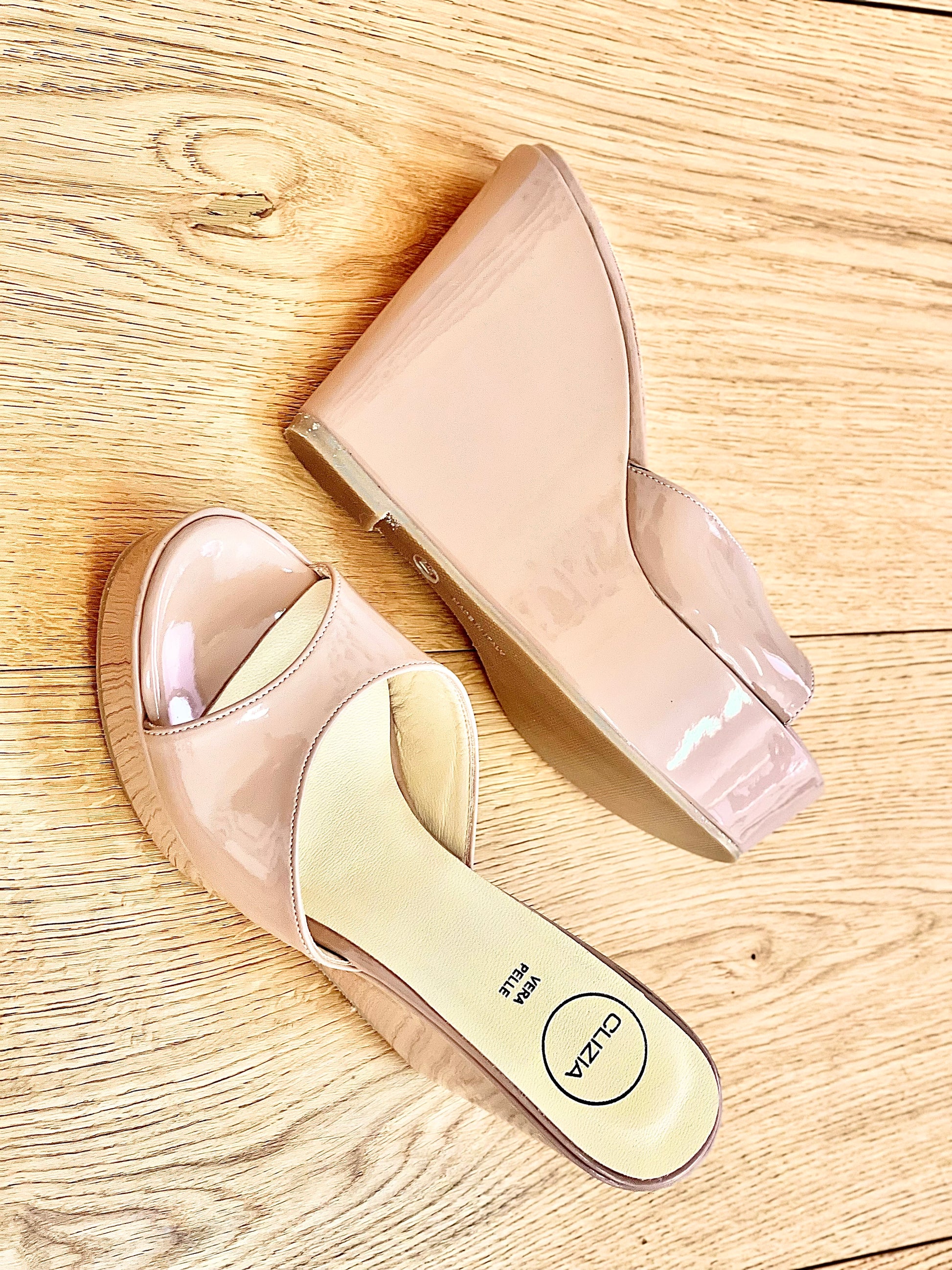 Sandálias mules de cunha alta em pele envernizada.