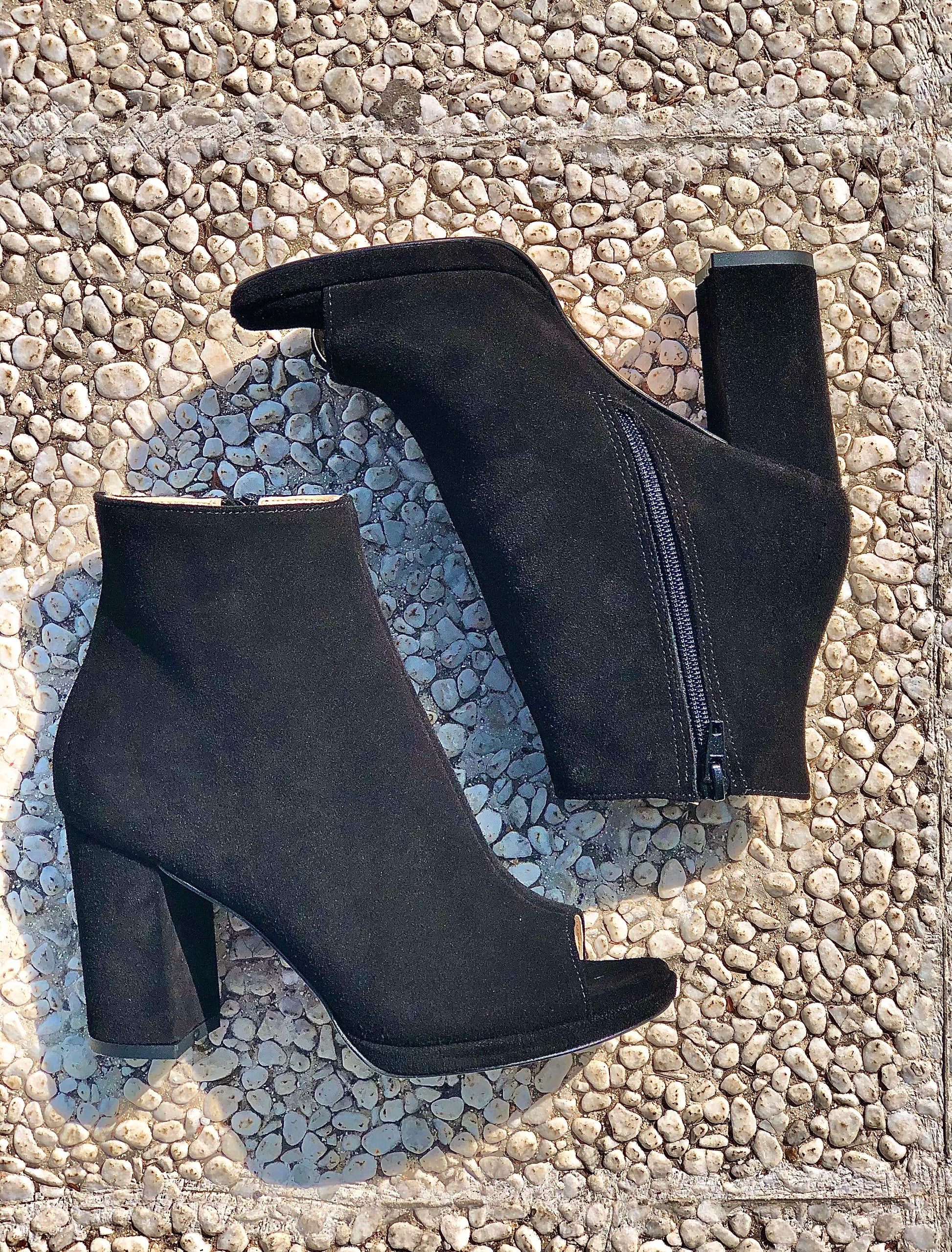 Bota de tornozelo em camurça com 9 cm de salto e 1 cm de plataforma.