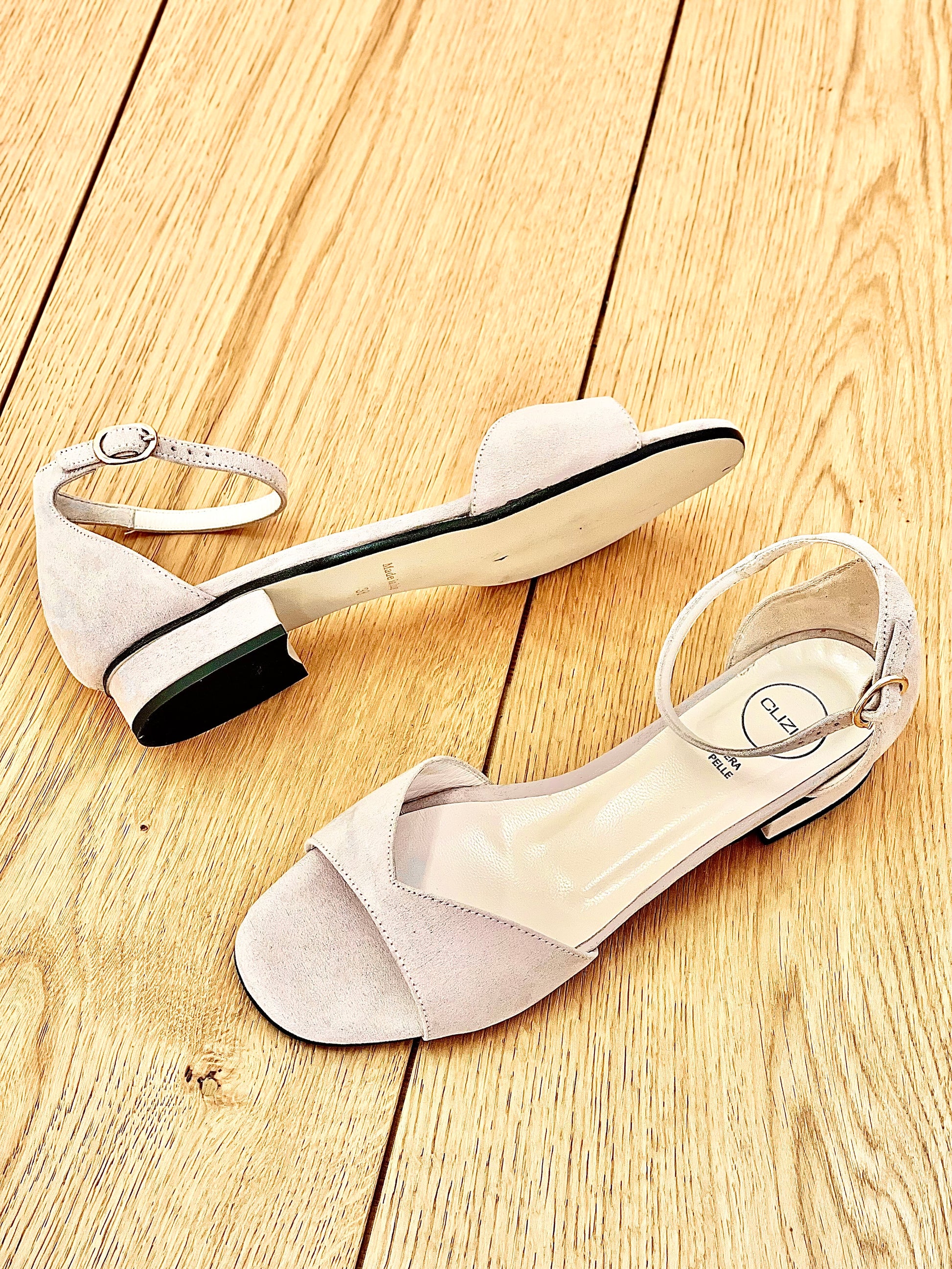 Sandália baixa em camurça com tira e salto com decote em V e salto de 2 cm.